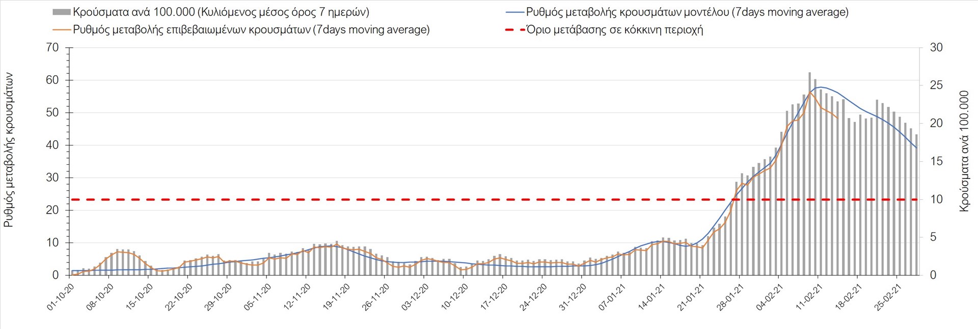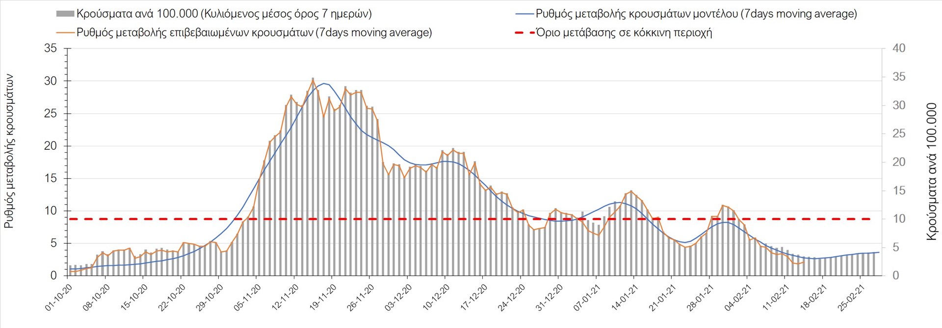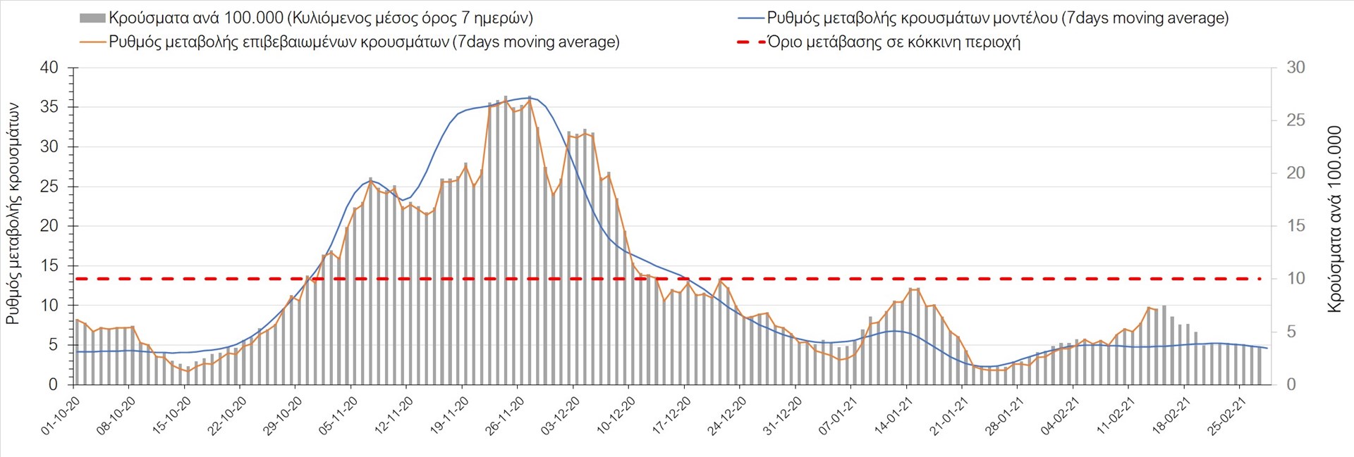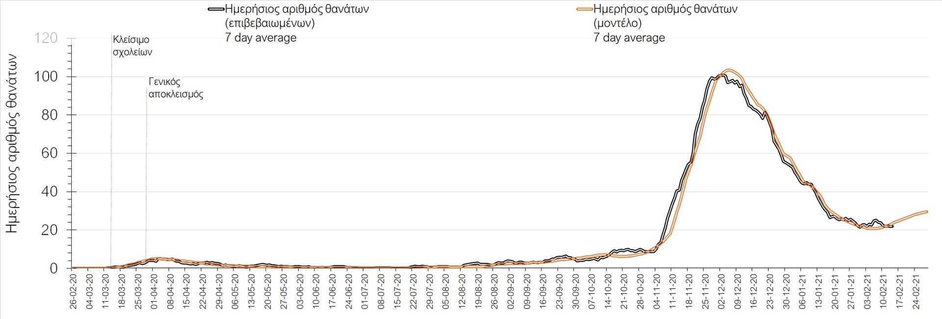 Συμπεράσματα:Η αύξηση που παρατηρείται πλέον στον αριθμό των ασθενών σε κρίσιμη κατάσταση (διασωληνομένοι σε ΜΕΘ), καθώς και ο αριθμός των θανάτων συνάδουν που παρατηρήθηκαν συνάδουν με τις προσομοιώσεις του μοντέλου CORE για τον επόμενο μήνα, ενώ πλέον και ο αριθμός των νέων κρουσμάτων παραμένει ανησυχητικός, ιδιαίτερα για την Αττική, με δεδομένο και το χαμηλό αριθμό των τεστ ανίχνευσης που πραγματοποιήθηκαν την Κυριακή. Τα παραπάνω αποτελέσματα αποτυπώνονται και στο δείκτη θετικότητας. Σε πανελλαδικό επίπεδο ο κυλιόμενος εβδομαδιαίος μέσος όρος του δείκτη θετικότητας παρέμεινε σταθερός στο 3,0% (η ημερήσια τιμή είναι 3,4%) ενώ ο κυλιόμενος εβδομαδιαίος μέσος όρος του πραγματικού αριθμού αναπαραγωγής Rt (δηλαδή ο αριθμός των ατόμων που ένας φορέας μπορεί να επιμολύνει) είναι πλέον 1,18 (τιμές του Rt πάνω από τη μονάδα υποδηλώνουν καθαρή αύξηση της διασποράς του ιού στην κοινότητα). Παρατηρείται δηλαδή από το Σάββατο μια ελαφρά επιβράδυνση της αυξητικής πορείας της πανδημίας συνολικά στη χώρα. Οι τιμές αυτές δείχνουν ότι αν και καλώς εφαρμόσθηκε το γενικευμένο lockdown της 3ης Ιανουαρίου, έτσι ώστε να αποσβεσθούν όποιες αποκλίσεις στην εφαρμογή των μέτρων υπήρξαν κατά την περίοδο των εορτών, δημιουργώντας θετικές προοπτικές στο σταδιακό άνοιγμα της οικονομίας που ξεκίνησε από τη Δευτέρα 18 Ιανουαρίου, ιδιαίτερη προσοχή πρέπει να δοθεί διότι όπως είχαμε επισημάνει από το προ-προηγούμενο Σαββατοκύριακο, τα αποτελέσματα των τελευταίων ημερών, δείχνουν ότι σε πανελλαδικό επίπεδο υπάρχει συνολικά αύξηση, δημιουργώντας ανησυχία τόσο για την πορεία της πανδημίας, όσο και για την πραγματική εξάπλωση του στελέχους B.1.1.7. του SARS-CoV-2 στην κοινότητα. Αναμένουμε λοιπόν τα αποτελέσματα των επομένων ημερών, όπου ο αριθμός των τεστ ανίχνευσης θα παραμείνει στα συνήθη επίπεδα (άνω των 40.000 ανά ημέρα), και ελπίζουμε να συνεχίσει στα επίπεδα της τελευταίας εβδομάδας, δηλαδή άνω των 45.000, και να συνεχίσει να αυξάνει άμεσα, φτάνοντας τα 80.000-100.000 τεστ ημερησίως. Επιπλέον, με βάση τα δεδομένα αυτής της εβδομάδας, καλώς εφαρμόσθηκαν τα περιοριστικά μέτρα που ισχύουν από τις 6 Φεβρουαρίου, τα οποία ίσως χρειαστούν επιπλέον αναθεώρηση, με βάση την επιδημιολογική εικόνα που θα επικρατήσει, ενώ επίσης καλώς εφαρμόσθηκε το lockdown μέχρι τις 28 Φεβρουαρίου στην Αθήνα. Με τα μέχρι τώρα δεδομένα, τα μέτρα αυτά φαίνονται να είναι ικανά να αναχαιτίσουν προσωρινά την επέλαση ενός τρίτου κύματος, εν αναμονή και επιπλέον στοιχείων, τόσο για τη μεταδοτικότητα του στελέχους B.1.1.7. του SARS-CoV-2, όσο και της διασποράς του στην κοινότητα.Παρά την εφαρμογή οριζοντίων μέτρων ανάσχεσης της πανδημίας που εφαρμόσθηκαν από τα τέλη Οκτωβρίου, η πορεία της τελευταίας διαφοροποιείται από περιοχή σε περιοχή. Οι παραπάνω παρατηρήσεις τείνουν στο συμπέρασμα ότι η διαχείριση του υγειονομικού κινδύνου θα πρέπει να εξεταστεί σε τοπικό επίπεδο (όπως πολύ σωστά έγινε με το lockdown στην Αθήνα και προηγουμένως στην Κοζάνη, από τη στιγμή που συνολικά στη χώρα φαίνεται να έχουμε ξεπεράσει την κορύφωση του συγκεκριμένου επιδημικού κύματος του Νοεμβρίου. Παρόλα αυτά, συνιστάται προσεκτική μελέτη των αποτελεσμάτων των επόμενων ημερών, λόγω του ανοίγματος των δημοτικών σχολείων και από αυτή την εβδομάδα και του λιανικού εμπορίου. Με βάση τη συνολική εικόνα που έχει διαμορφωθεί, έχουμε εντελώς διαφορετική κατ