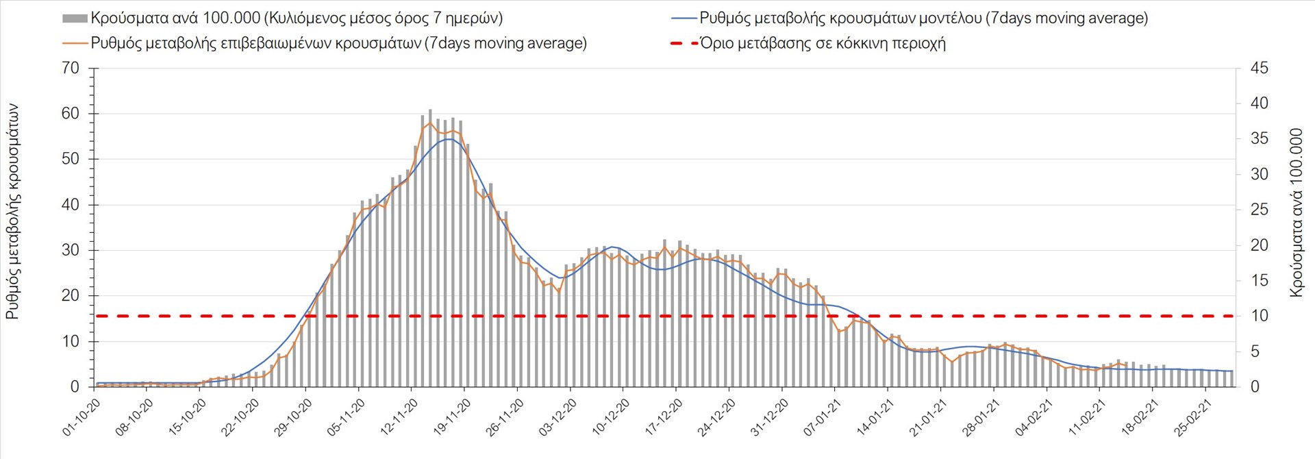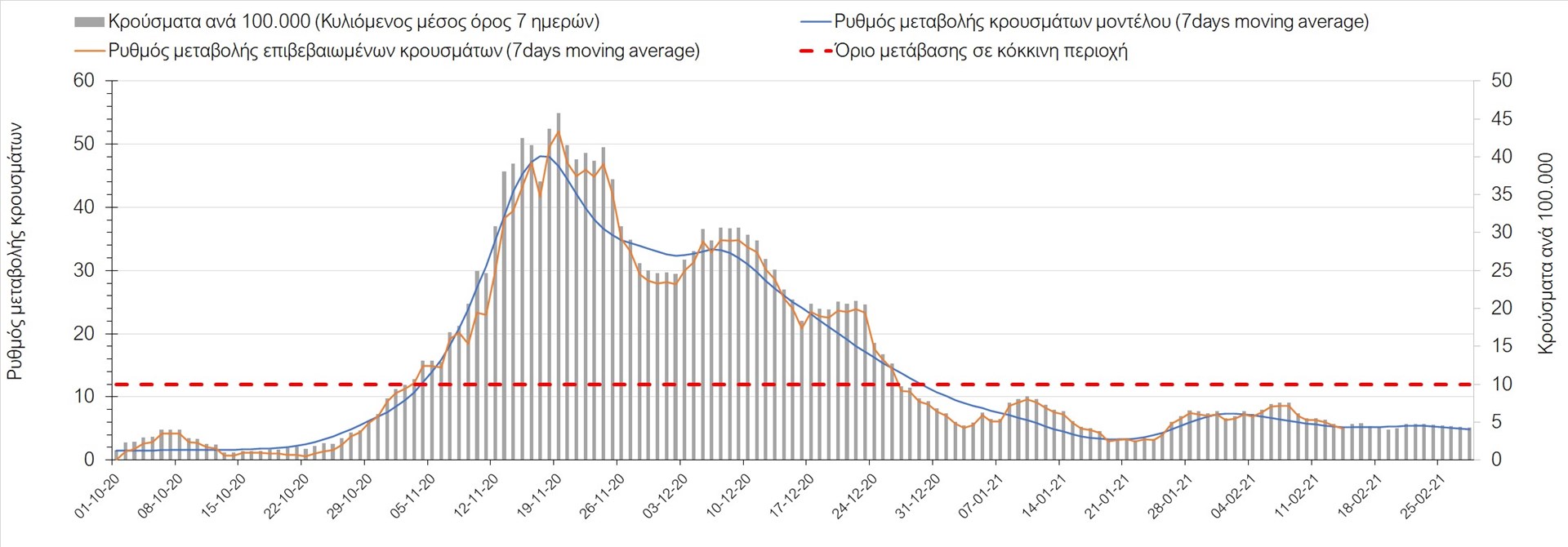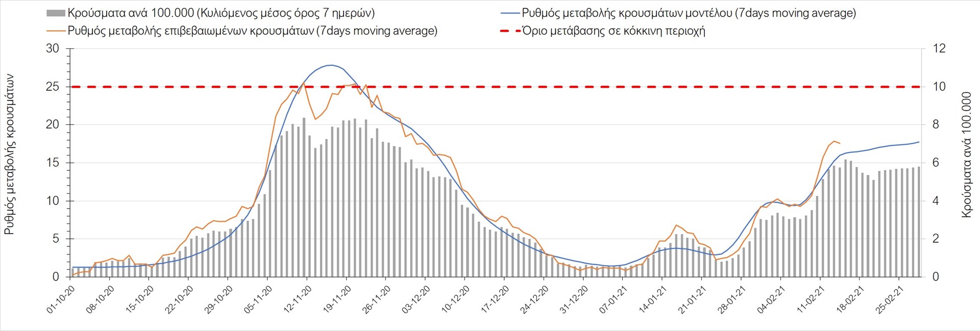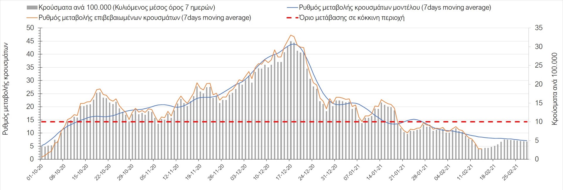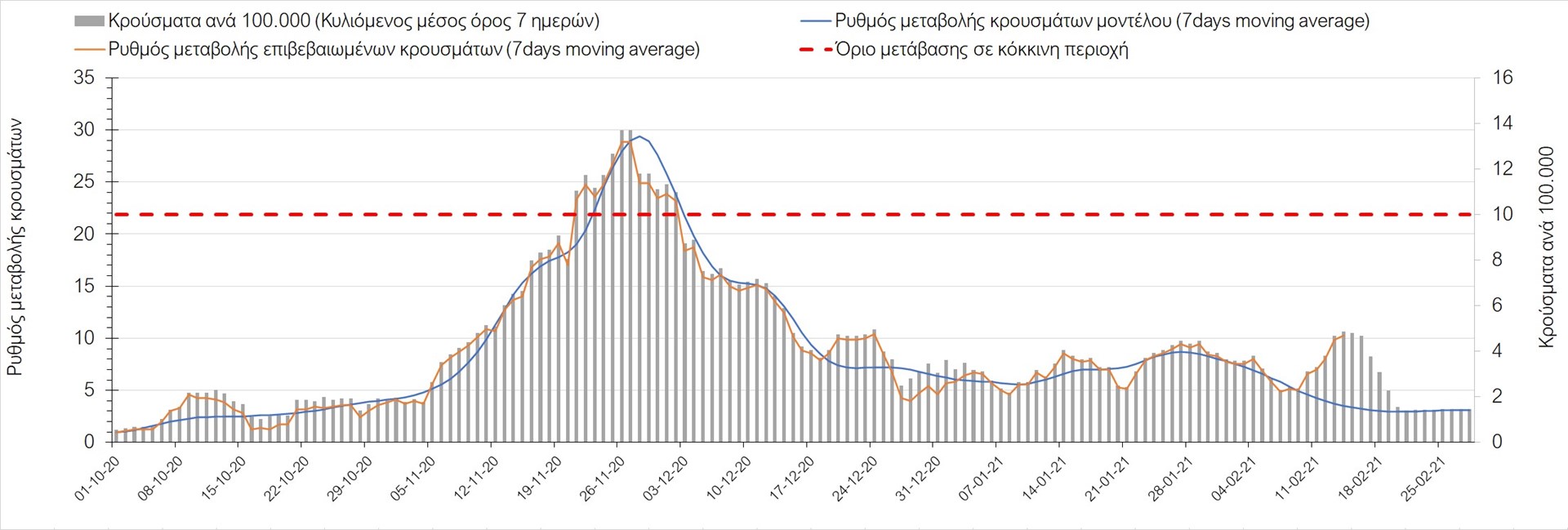 Συμπεράσματα:Η αύξηση που παρατηρείται πλέον στον αριθμό των ασθενών σε κρίσιμη κατάσταση (διασωληνομένοι σε ΜΕΘ), καθώς και ο αριθμός των θανάτων συνάδουν που παρατηρήθηκαν συνάδουν με τις προσομοιώσεις του μοντέλου CORE για τον επόμενο μήνα, ενώ πλέον και ο αριθμός των νέων κρουσμάτων παραμένει ανησυχητικός, ιδιαίτερα για την Αττική, με δεδομένο και το χαμηλό αριθμό των τεστ ανίχνευσης που πραγματοποιήθηκαν την Κυριακή. Τα παραπάνω αποτελέσματα αποτυπώνονται και στο δείκτη θετικότητας. Σε πανελλαδικό επίπεδο ο κυλιόμενος εβδομαδιαίος μέσος όρος του δείκτη θετικότητας παρέμεινε σταθερός στο 3,0% (η ημερήσια τιμή είναι 3,4%) ενώ ο κυλιόμενος εβδομαδιαίος μέσος όρος του πραγματικού αριθμού αναπαραγωγής Rt (δηλαδή ο αριθμός των ατόμων που ένας φορέας μπορεί να επιμολύνει) είναι πλέον 1,18 (τιμές του Rt πάνω από τη μονάδα υποδηλώνουν καθαρή αύξηση της διασποράς του ιού στην κοινότητα). Παρατηρείται δηλαδή από το Σάββατο μια ελαφρά επιβράδυνση της αυξητικής πορείας της πανδημίας συνολικά στη χώρα. Οι τιμές αυτές δείχνουν ότι αν και καλώς εφαρμόσθηκε το γενικευμένο lockdown της 3ης Ιανουαρίου, έτσι ώστε να αποσβεσθούν όποιες αποκλίσεις στην εφαρμογή των μέτρων υπήρξαν κατά την περίοδο των εορτών, δημιουργώντας θετικές προοπτικές στο σταδιακό άνοιγμα της οικονομίας που ξεκίνησε από τη Δευτέρα 18 Ιανουαρίου, ιδιαίτερη προσοχή πρέπει να δοθεί διότι όπως είχαμε επισημάνει από το προ-προηγούμενο Σαββατοκύριακο, τα αποτελέσματα των τελευταίων ημερών, δείχνουν ότι σε πανελλαδικό επίπεδο υπάρχει συνολικά αύξηση, δημιουργώντας ανησυχία τόσο για την πορεία της πανδημίας, όσο και για την πραγματική εξάπλωση του στελέχους B.1.1.7. του SARS-CoV-2 στην κοινότητα. Αναμένουμε λοιπόν τα αποτελέσματα των επομένων ημερών, όπου ο αριθμός των τεστ ανίχνευσης θα παραμείνει στα συνήθη επίπεδα (άνω των 40.000 ανά ημέρα), και ελπίζουμε να συνεχίσει στα επίπεδα της τελευταίας εβδομάδας, δηλαδή άνω των 45.000, και να συνεχίσει να αυξάνει άμεσα, φτάνοντας τα 80.000-100.000 τεστ ημερησίως. Επιπλέον, με βάση τα δεδομένα αυτής της εβδομάδας, καλώς εφαρμόσθηκαν τα περιοριστικά μέτρα που ισχύουν από τις 6 Φεβρουαρίου, τα οποία ίσως χρειαστούν επιπλέον αναθεώρηση, με βάση την επιδημιολογική εικόνα που θα επικρατήσει, ενώ επίσης καλώς εφαρμόσθηκε το lockdown μέχρι τις 28 Φεβρουαρίου στην Αθήνα. Με τα μέχρι τώρα δεδομένα, τα μέτρα αυτά φαίνονται να είναι ικανά να αναχαιτίσουν προσωρινά την επέλαση ενός τρίτου κύματος, εν αναμονή και επιπλέον στοιχείων, τόσο για τη μεταδοτικότητα του στελέχους B.1.1.7. του SARS-CoV-2, όσο και της διασποράς του στην κοινότητα.Παρά την εφαρμογή οριζοντίων μέτρων ανάσχεσης της πανδημίας που εφαρμόσθηκαν από τα τέλη Οκτωβρίου, η πορεία της τελευταίας διαφοροποιείται από περιοχή σε περιοχή. Οι παραπάνω παρατηρήσεις τείνουν στο συμπέρασμα ότι η διαχείριση του υγειονομικού κινδύνου θα πρέπει να εξεταστεί σε τοπικό επίπεδο (όπως πολύ σωστά έγινε με το lockdown στην Αθήνα και προηγουμένως στην Κοζάνη, από τη στιγμή που συνολικά στη χώρα φαίνεται να έχουμε ξεπεράσει την κορύφωση του συγκεκριμένου επιδημικού κύματος του Νοεμβρίου. Παρόλα αυτά, συνιστάται προσεκτική μελέτη των αποτελεσμάτων των επόμενων ημερών, λόγω του ανοίγματος των δημοτικών σχολείων και από αυτή την εβδομάδα και του λιανικού εμπορίου. Με βάση τη συνολική εικόνα που έχει διαμορφωθεί, έχουμε εντελώς διαφορετική κατ