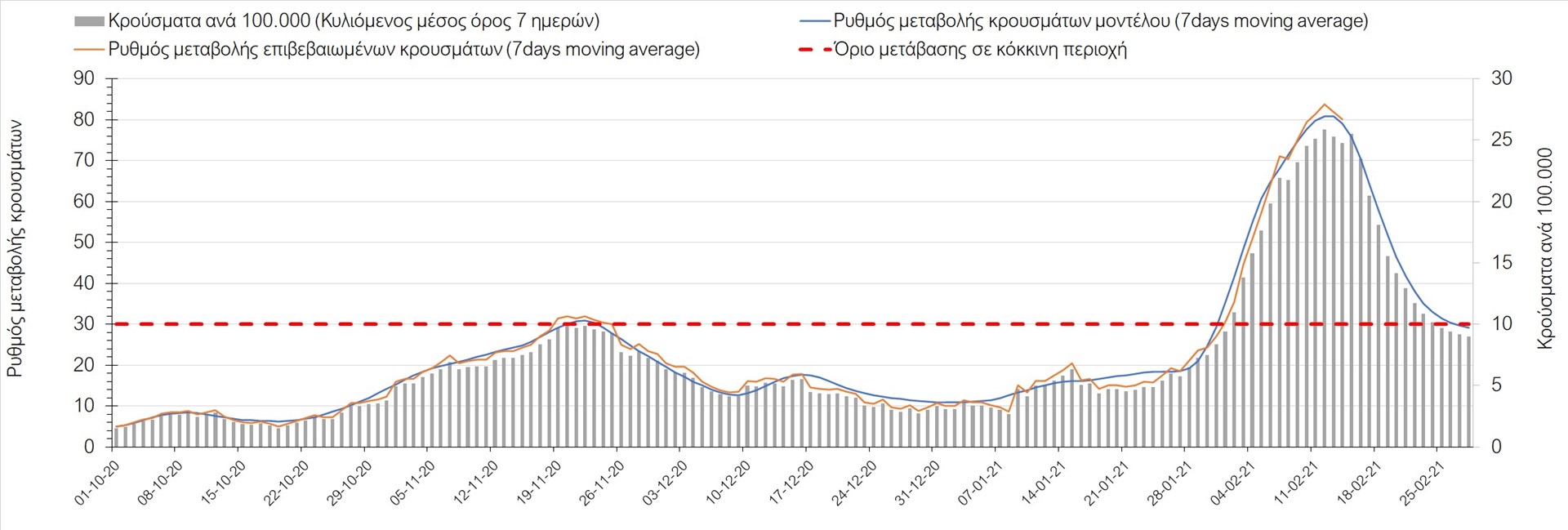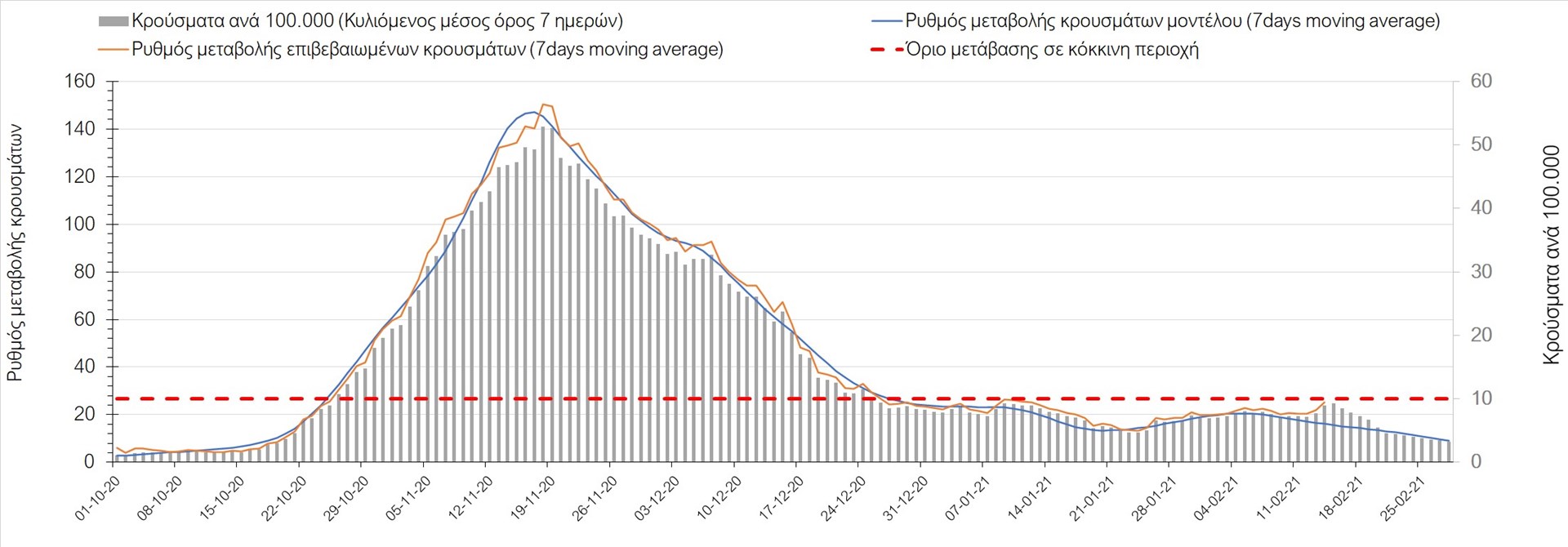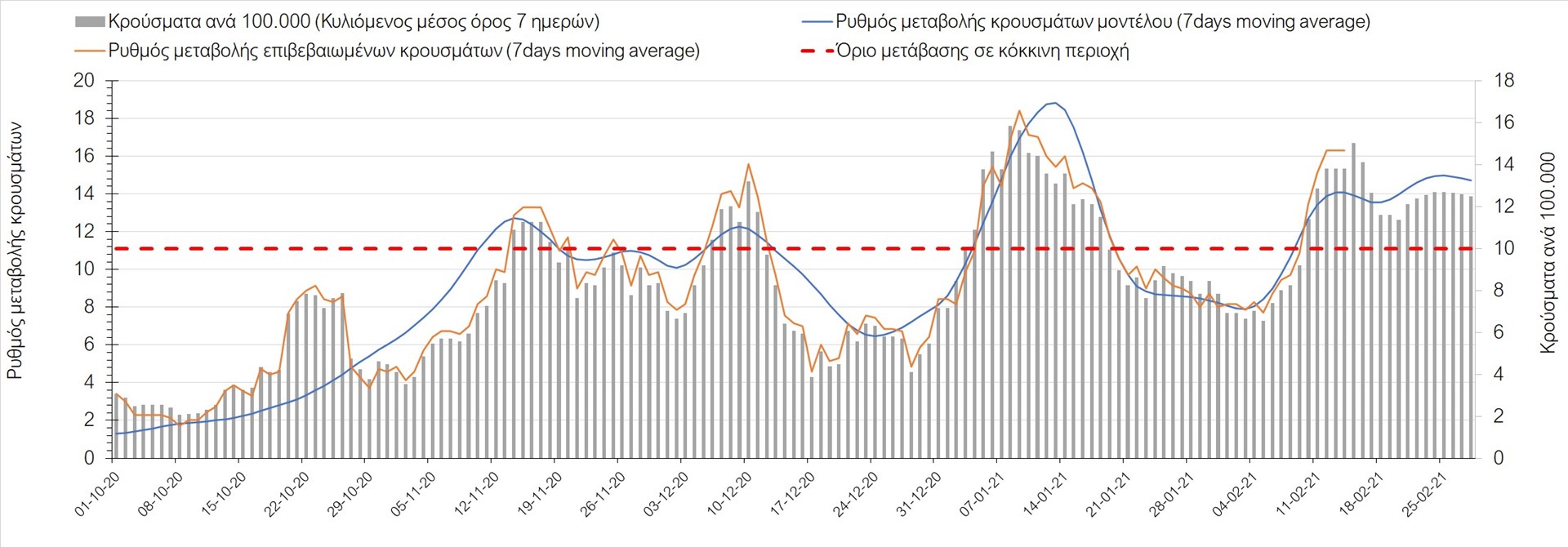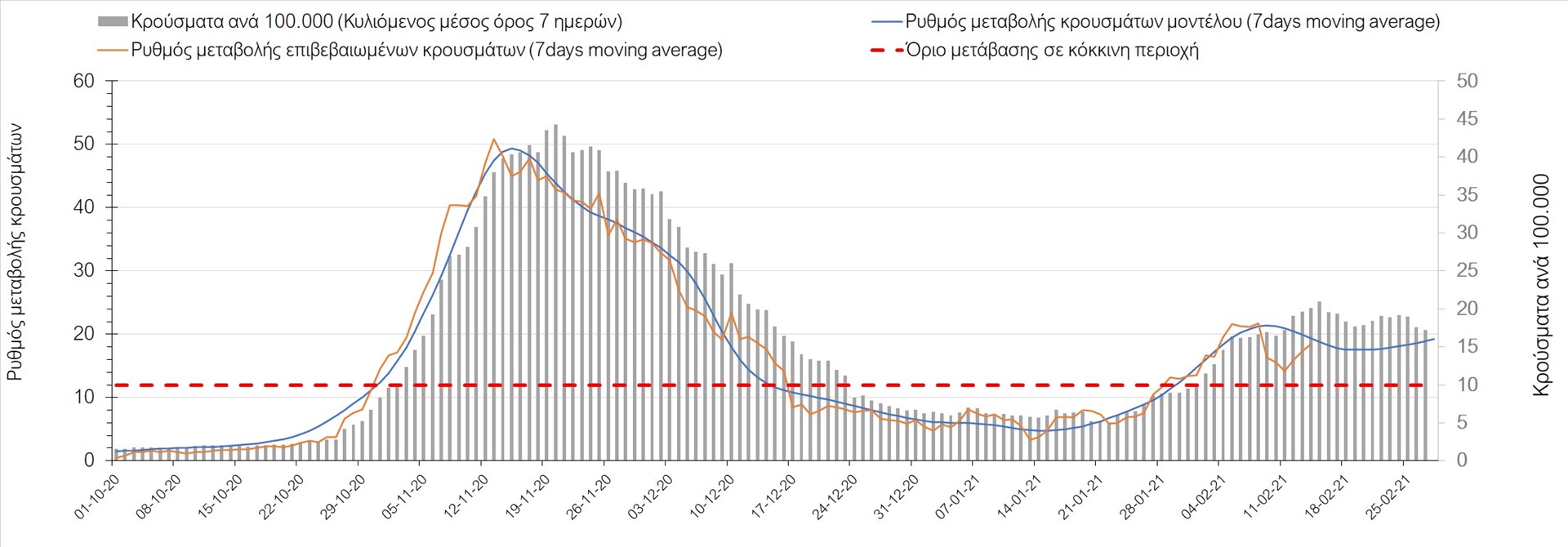 Συμπεράσματα:Η αύξηση που παρατηρείται πλέον στον αριθμό των ασθενών σε κρίσιμη κατάσταση (διασωληνομένοι σε ΜΕΘ), καθώς και ο αριθμός των θανάτων συνάδουν που παρατηρήθηκαν συνάδουν με τις προσομοιώσεις του μοντέλου CORE για τον επόμενο μήνα, ενώ πλέον και ο αριθμός των νέων κρουσμάτων παραμένει ανησυχητικός, ιδιαίτερα για την Αττική, με δεδομένο και το χαμηλό αριθμό των τεστ ανίχνευσης που πραγματοποιήθηκαν την Κυριακή. Τα παραπάνω αποτελέσματα αποτυπώνονται και στο δείκτη θετικότητας. Σε πανελλαδικό επίπεδο ο κυλιόμενος εβδομαδιαίος μέσος όρος του δείκτη θετικότητας παρέμεινε σταθερός στο 3,0% (η ημερήσια τιμή είναι 3,4%) ενώ ο κυλιόμενος εβδομαδιαίος μέσος όρος του πραγματικού αριθμού αναπαραγωγής Rt (δηλαδή ο αριθμός των ατόμων που ένας φορέας μπορεί να επιμολύνει) είναι πλέον 1,18 (τιμές του Rt πάνω από τη μονάδα υποδηλώνουν καθαρή αύξηση της διασποράς του ιού στην κοινότητα). Παρατηρείται δηλαδή από το Σάββατο μια ελαφρά επιβράδυνση της αυξητικής πορείας της πανδημίας συνολικά στη χώρα. Οι τιμές αυτές δείχνουν ότι αν και καλώς εφαρμόσθηκε το γενικευμένο lockdown της 3ης Ιανουαρίου, έτσι ώστε να αποσβεσθούν όποιες αποκλίσεις στην εφαρμογή των μέτρων υπήρξαν κατά την περίοδο των εορτών, δημιουργώντας θετικές προοπτικές στο σταδιακό άνοιγμα της οικονομίας που ξεκίνησε από τη Δευτέρα 18 Ιανουαρίου, ιδιαίτερη προσοχή πρέπει να δοθεί διότι όπως είχαμε επισημάνει από το προ-προηγούμενο Σαββατοκύριακο, τα αποτελέσματα των τελευταίων ημερών, δείχνουν ότι σε πανελλαδικό επίπεδο υπάρχει συνολικά αύξηση, δημιουργώντας ανησυχία τόσο για την πορεία της πανδημίας, όσο και για την πραγματική εξάπλωση του στελέχους B.1.1.7. του SARS-CoV-2 στην κοινότητα. Αναμένουμε λοιπόν τα αποτελέσματα των επομένων ημερών, όπου ο αριθμός των τεστ ανίχνευσης θα παραμείνει στα συνήθη επίπεδα (άνω των 40.000 ανά ημέρα), και ελπίζουμε να συνεχίσει στα επίπεδα της τελευταίας εβδομάδας, δηλαδή άνω των 45.000, και να συνεχίσει να αυξάνει άμεσα, φτάνοντας τα 80.000-100.000 τεστ ημερησίως. Επιπλέον, με βάση τα δεδομένα αυτής της εβδομάδας, καλώς εφαρμόσθηκαν τα περιοριστικά μέτρα που ισχύουν από τις 6 Φεβρουαρίου, τα οποία ίσως χρειαστούν επιπλέον αναθεώρηση, με βάση την επιδημιολογική εικόνα που θα επικρατήσει, ενώ επίσης καλώς εφαρμόσθηκε το lockdown μέχρι τις 28 Φεβρουαρίου στην Αθήνα. Με τα μέχρι τώρα δεδομένα, τα μέτρα αυτά φαίνονται να είναι ικανά να αναχαιτίσουν προσωρινά την επέλαση ενός τρίτου κύματος, εν αναμονή και επιπλέον στοιχείων, τόσο για τη μεταδοτικότητα του στελέχους B.1.1.7. του SARS-CoV-2, όσο και της διασποράς του στην κοινότητα.Παρά την εφαρμογή οριζοντίων μέτρων ανάσχεσης της πανδημίας που εφαρμόσθηκαν από τα τέλη Οκτωβρίου, η πορεία της τελευταίας διαφοροποιείται από περιοχή σε περιοχή. Οι παραπάνω παρατηρήσεις τείνουν στο συμπέρασμα ότι η διαχείριση του υγειονομικού κινδύνου θα πρέπει να εξεταστεί σε τοπικό επίπεδο (όπως πολύ σωστά έγινε με το lockdown στην Αθήνα και προηγουμένως στην Κοζάνη, από τη στιγμή που συνολικά στη χώρα φαίνεται να έχουμε ξεπεράσει την κορύφωση του συγκεκριμένου επιδημικού κύματος του Νοεμβρίου. Παρόλα αυτά, συνιστάται προσεκτική μελέτη των αποτελεσμάτων των επόμενων ημερών, λόγω του ανοίγματος των δημοτικών σχολείων και από αυτή την εβδομάδα και του λιανικού εμπορίου. Με βάση τη συνολική εικόνα που έχει διαμορφωθεί, έχουμε εντελώς διαφορετική κατ