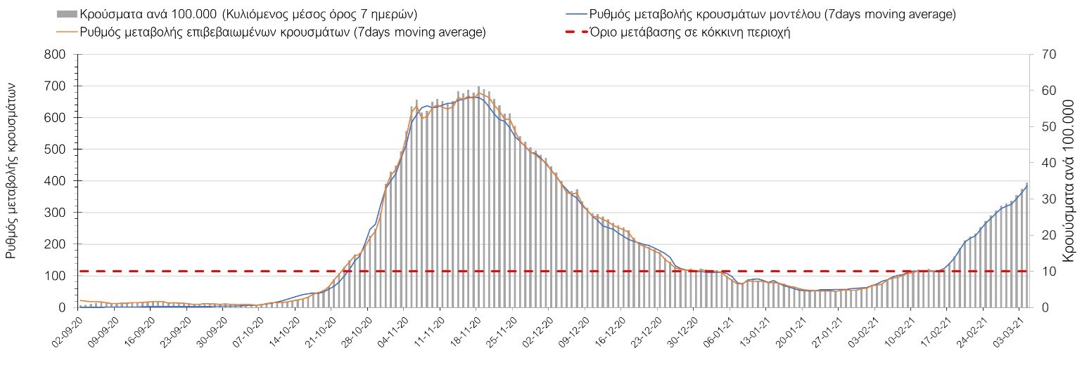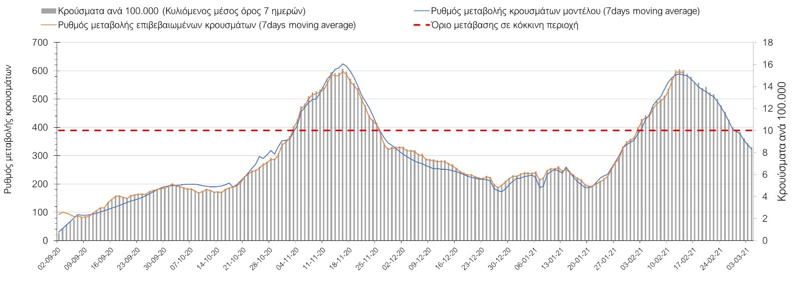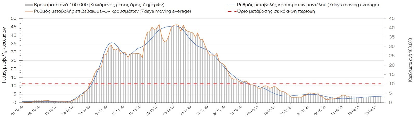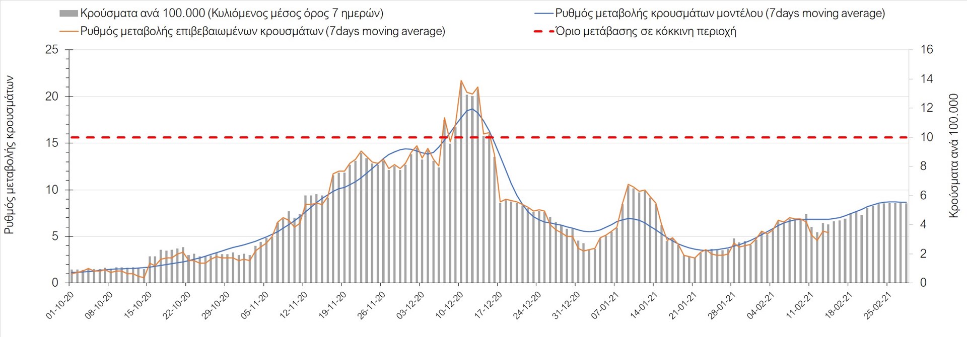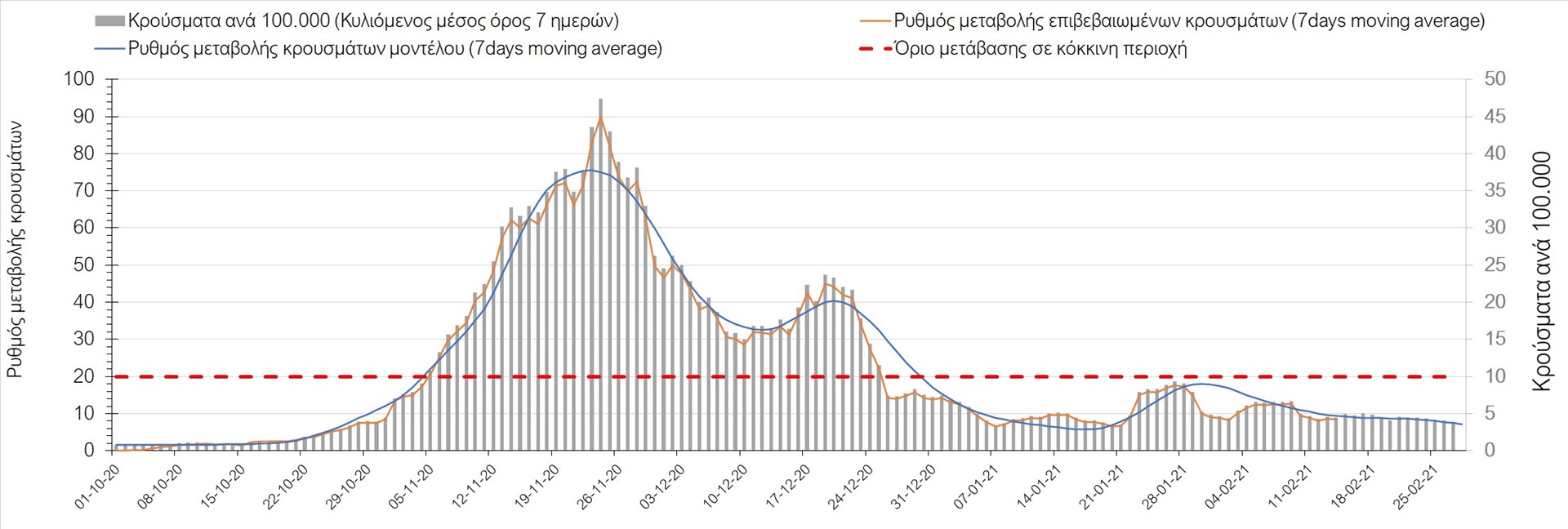 Συμπεράσματα:Η αύξηση που παρατηρείται πλέον στον αριθμό των ασθενών σε κρίσιμη κατάσταση (διασωληνομένοι σε ΜΕΘ), καθώς και ο αριθμός των θανάτων συνάδουν που παρατηρήθηκαν συνάδουν με τις προσομοιώσεις του μοντέλου CORE για τον επόμενο μήνα, ενώ πλέον και ο αριθμός των νέων κρουσμάτων παραμένει ανησυχητικός, ιδιαίτερα για την Αττική, με δεδομένο και το χαμηλό αριθμό των τεστ ανίχνευσης που πραγματοποιήθηκαν την Κυριακή. Τα παραπάνω αποτελέσματα αποτυπώνονται και στο δείκτη θετικότητας. Σε πανελλαδικό επίπεδο ο κυλιόμενος εβδομαδιαίος μέσος όρος του δείκτη θετικότητας παρέμεινε σταθερός στο 3,0% (η ημερήσια τιμή είναι 3,4%) ενώ ο κυλιόμενος εβδομαδιαίος μέσος όρος του πραγματικού αριθμού αναπαραγωγής Rt (δηλαδή ο αριθμός των ατόμων που ένας φορέας μπορεί να επιμολύνει) είναι πλέον 1,18 (τιμές του Rt πάνω από τη μονάδα υποδηλώνουν καθαρή αύξηση της διασποράς του ιού στην κοινότητα). Παρατηρείται δηλαδή από το Σάββατο μια ελαφρά επιβράδυνση της αυξητικής πορείας της πανδημίας συνολικά στη χώρα. Οι τιμές αυτές δείχνουν ότι αν και καλώς εφαρμόσθηκε το γενικευμένο lockdown της 3ης Ιανουαρίου, έτσι ώστε να αποσβεσθούν όποιες αποκλίσεις στην εφαρμογή των μέτρων υπήρξαν κατά την περίοδο των εορτών, δημιουργώντας θετικές προοπτικές στο σταδιακό άνοιγμα της οικονομίας που ξεκίνησε από τη Δευτέρα 18 Ιανουαρίου, ιδιαίτερη προσοχή πρέπει να δοθεί διότι όπως είχαμε επισημάνει από το προ-προηγούμενο Σαββατοκύριακο, τα αποτελέσματα των τελευταίων ημερών, δείχνουν ότι σε πανελλαδικό επίπεδο υπάρχει συνολικά αύξηση, δημιουργώντας ανησυχία τόσο για την πορεία της πανδημίας, όσο και για την πραγματική εξάπλωση του στελέχους B.1.1.7. του SARS-CoV-2 στην κοινότητα. Αναμένουμε λοιπόν τα αποτελέσματα των επομένων ημερών, όπου ο αριθμός των τεστ ανίχνευσης θα παραμείνει στα συνήθη επίπεδα (άνω των 40.000 ανά ημέρα), και ελπίζουμε να συνεχίσει στα επίπεδα της τελευταίας εβδομάδας, δηλαδή άνω των 45.000, και να συνεχίσει να αυξάνει άμεσα, φτάνοντας τα 80.000-100.000 τεστ ημερησίως. Επιπλέον, με βάση τα δεδομένα αυτής της εβδομάδας, καλώς εφαρμόσθηκαν τα περιοριστικά μέτρα που ισχύουν από τις 6 Φεβρουαρίου, τα οποία ίσως χρειαστούν επιπλέον αναθεώρηση, με βάση την επιδημιολογική εικόνα που θα επικρατήσει, ενώ επίσης καλώς εφαρμόσθηκε το lockdown μέχρι τις 28 Φεβρουαρίου στην Αθήνα. Με τα μέχρι τώρα δεδομένα, τα μέτρα αυτά φαίνονται να είναι ικανά να αναχαιτίσουν προσωρινά την επέλαση ενός τρίτου κύματος, εν αναμονή και επιπλέον στοιχείων, τόσο για τη μεταδοτικότητα του στελέχους B.1.1.7. του SARS-CoV-2, όσο και της διασποράς του στην κοινότητα.Παρά την εφαρμογή οριζοντίων μέτρων ανάσχεσης της πανδημίας που εφαρμόσθηκαν από τα τέλη Οκτωβρίου, η πορεία της τελευταίας διαφοροποιείται από περιοχή σε περιοχή. Οι παραπάνω παρατηρήσεις τείνουν στο συμπέρασμα ότι η διαχείριση του υγειονομικού κινδύνου θα πρέπει να εξεταστεί σε τοπικό επίπεδο (όπως πολύ σωστά έγινε με το lockdown στην Αθήνα και προηγουμένως στην Κοζάνη, από τη στιγμή που συνολικά στη χώρα φαίνεται να έχουμε ξεπεράσει την κορύφωση του συγκεκριμένου επιδημικού κύματος του Νοεμβρίου. Παρόλα αυτά, συνιστάται προσεκτική μελέτη των αποτελεσμάτων των επόμενων ημερών, λόγω του ανοίγματος των δημοτικών σχολείων και από αυτή την εβδομάδα και του λιανικού εμπορίου. Με βάση τη συνολική εικόνα που έχει διαμορφωθεί, έχουμε εντελώς διαφορετική κατ