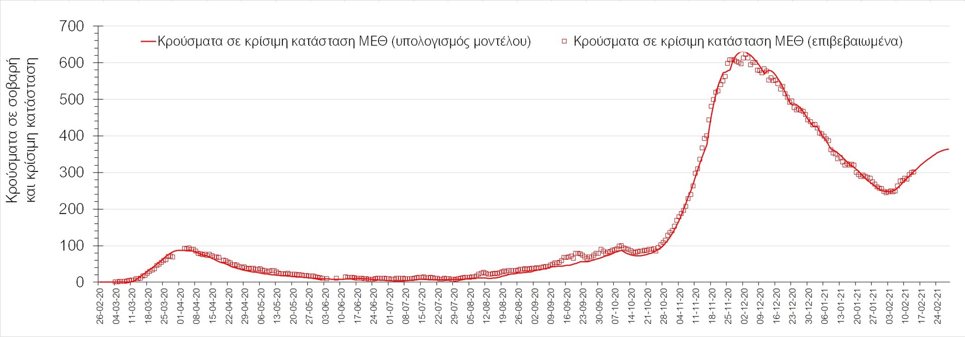 Όσον αφορά στους ασθενείς σε κρίσιμη κατάσταση (διασωληνωμένοι σε ΜΕΘ), ο αριθμός τους αυξήθηκε ελαφρά σε σχέση με το Σάββατο (301 από 300). Σε συνδυασμό με τα αποτελέσματα της τελευταίας εβδομάδας φαίνεται ότι έχει ολοκληρωθεί η αποκλιμάκωση και ξεκίνησε η ανοδική πορεία που αναμέναμε. Η καμπύλη εξέλιξης του αριθμού των ασθενών που χρειάζονται διασωλήνωση φαίνεται να ακολουθεί την πορεία που διαφαίνονταν και από την υπολογιστική πλατφόρμα CORE, όπως αυτή παρουσιάζεται στο Σχήμα 1, ενώ μια εκτίμηση για την πορεία των θανάτων παρουσιάζεται στο Σχήμα 2.