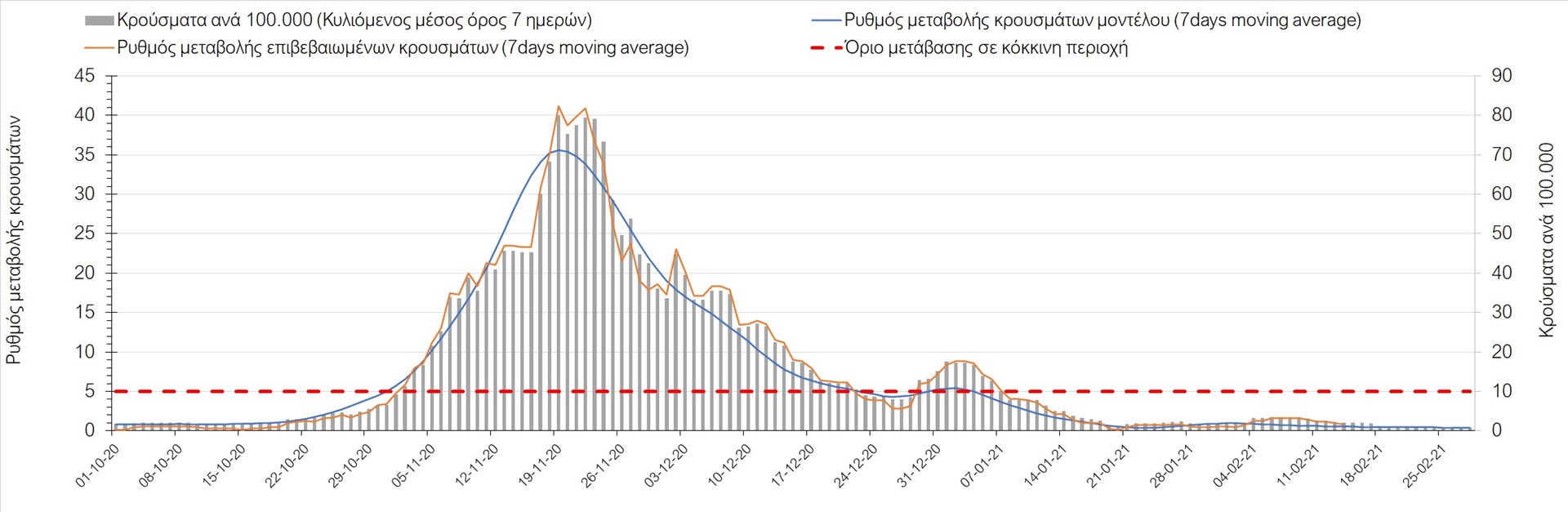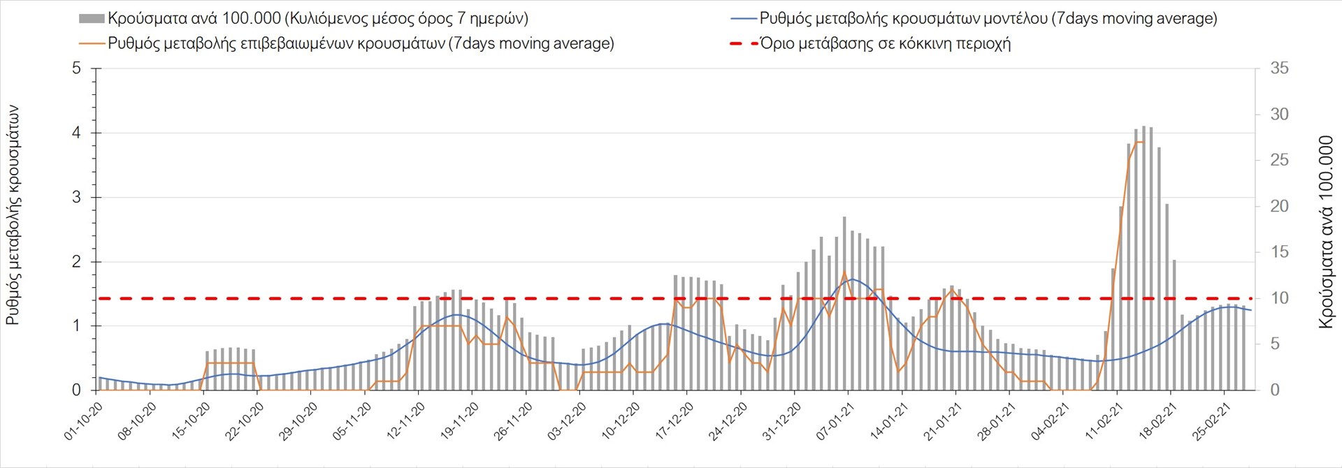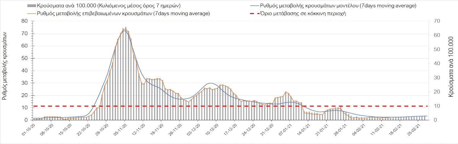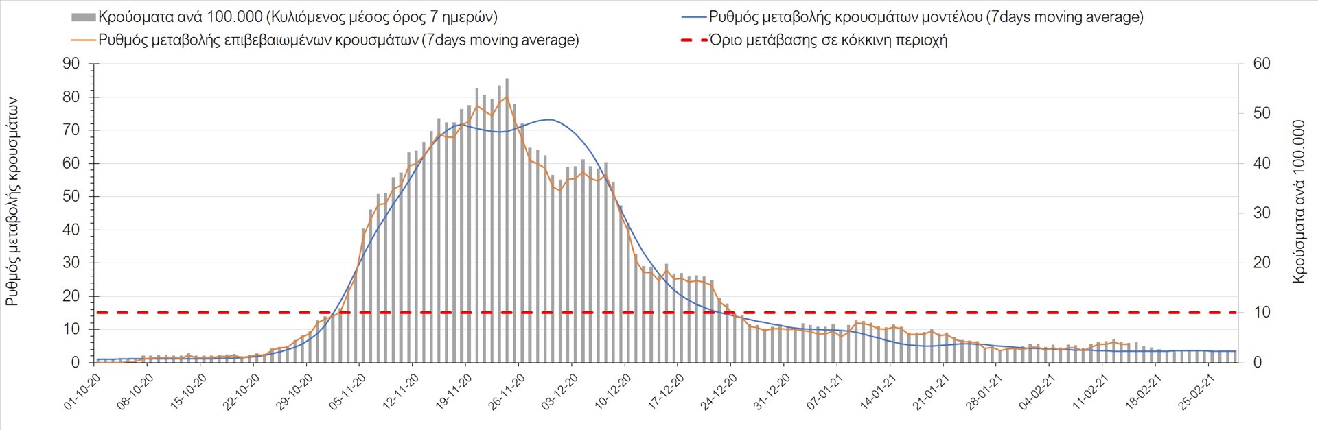 Όπως φαίνεται από το διάγραμμα, από τις 8 Ιανουαρίου έχουμε μια αύξηση κρουσμάτων μέχρι τις 11 Ιανουαρίου η οποία οφείλεται στη μείωση της περιστολής που σημειώθηκε στις γιορτές. Από τις 11 μέχρι τις 18 Ιανουαρίου προβλεπόταν μια μείωση κρουσμάτων λόγω της εφαρμογής του lockdown και η οποία όντως παρατηρήθηκε. Εντούτοις, όπως είχαμε προβλέψει, από τις 23 Ιανουαρίου και έπειτα διαφαίνεται αύξηση στον κυλιόμενο μέσο όρο των κρουσμάτων. Η εφαρμογή των περιοριστικών μέτρων, σε συνδυασμό με την επικρατούσα μετεωρολογία πρόκειται να επιφέρει μια σταθεροποίηση ή και ελαφρά μείωση των κρουσμάτων τις επόμενες ημέρες. Παρ’ολ’αυτά, μετά από τις 17/2 προβλέπεται μια περαιτέρω αύξηση των κρουσμάτων, η οποία αναμένουμε να καμφθεί τις επόμενες ημέρες, ως αποτέλεσμα των μέτρων που ελήφθησαν από την προηγουμένη εβδομάδα.