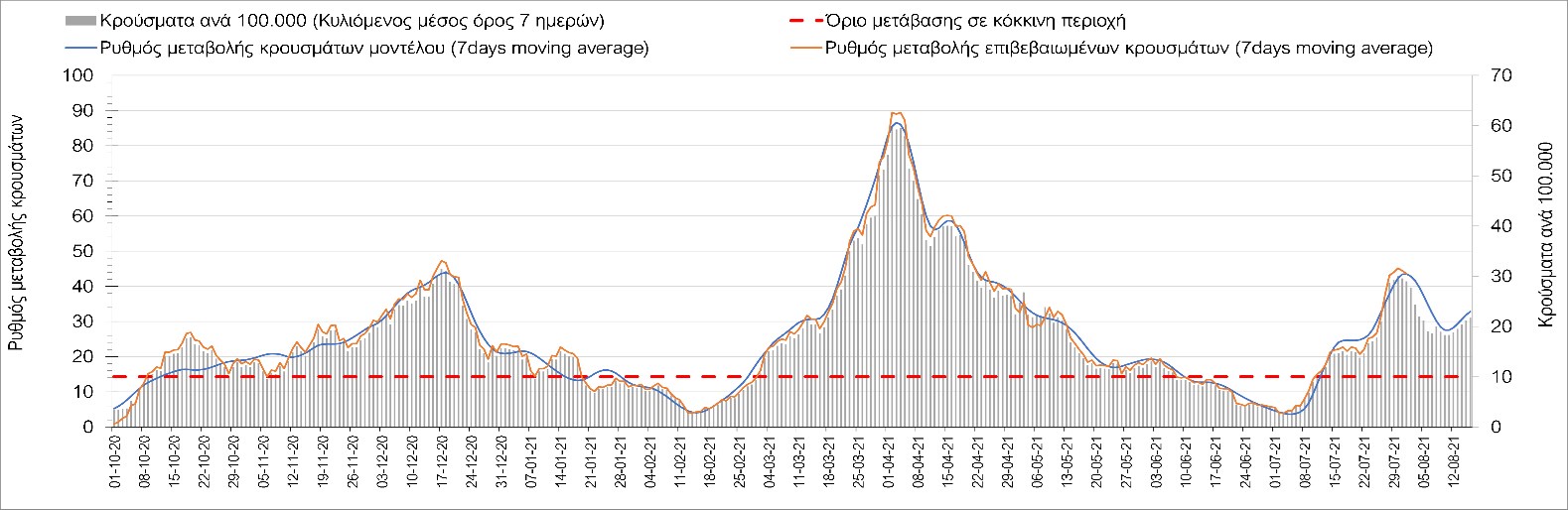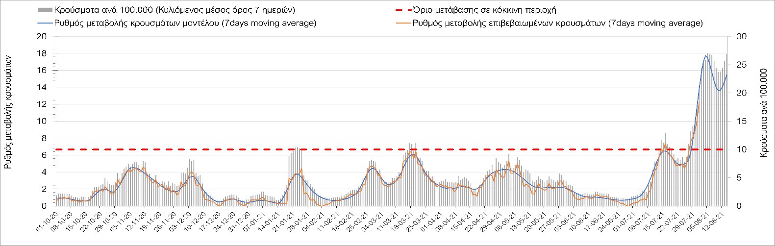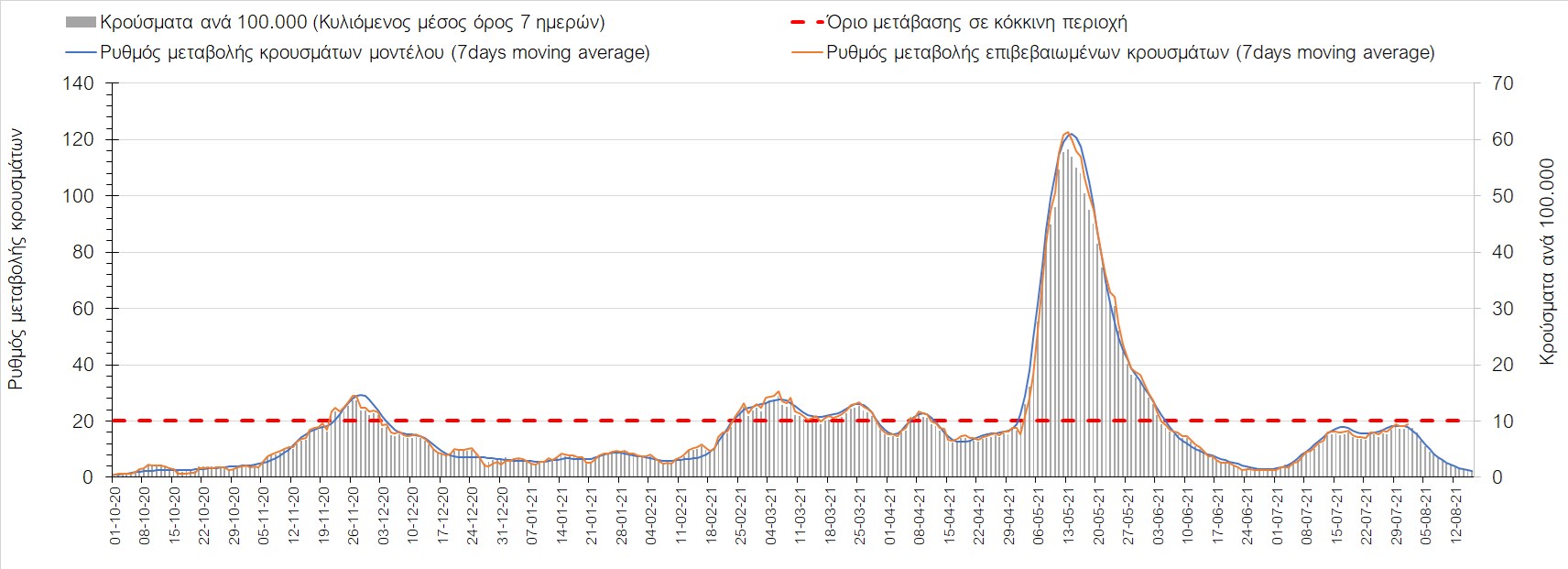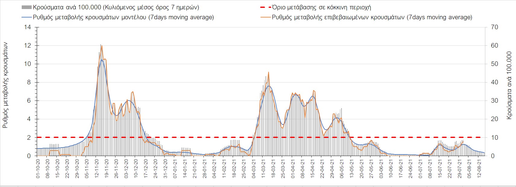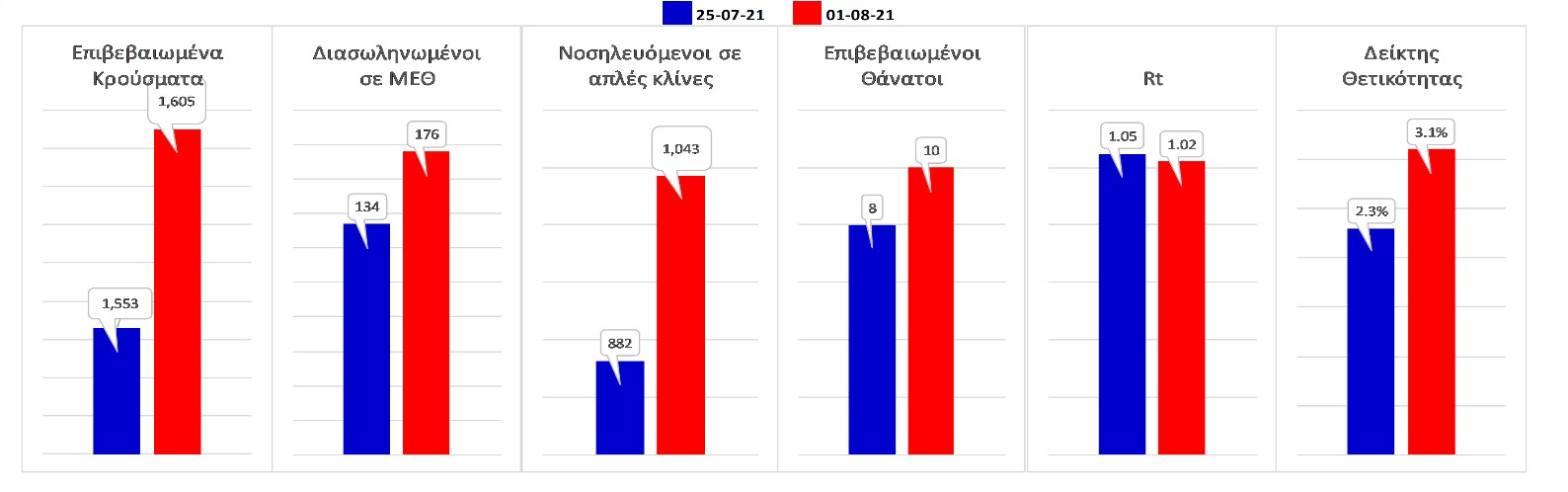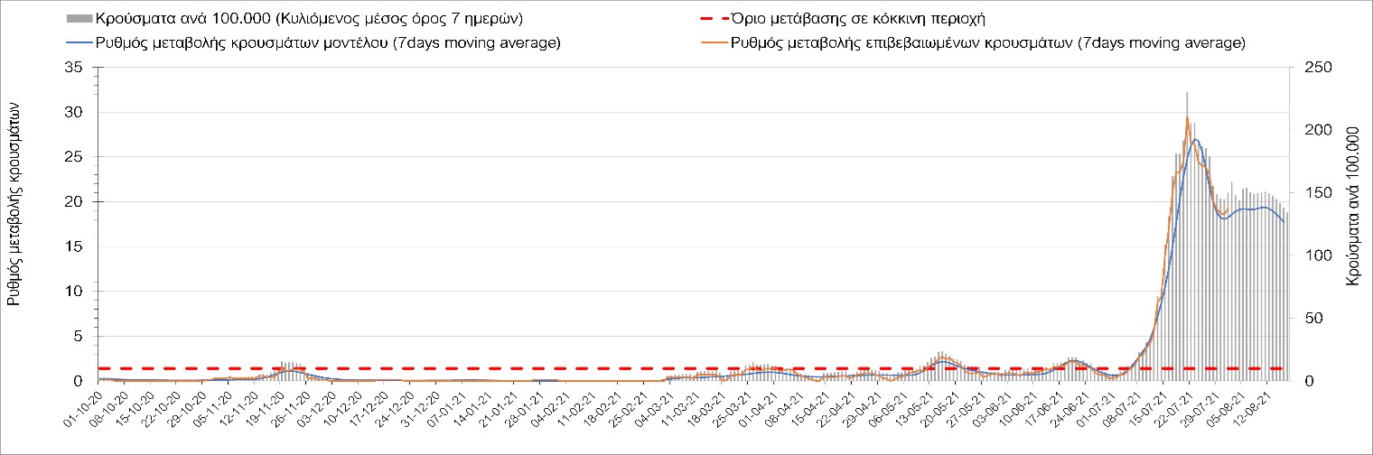 Σχήμα 58. Συγκριτικά αποτελέσματα της επιδημιολογικής εικόνας της σημερινής Κυριακής (01/08/2021) σε σχέση με την προηγούμενη (25/07/2021) Όσον αφορά επιμέρους περιοχές, αρκετές πλέον βρίσκονται πάνω από το όριο χαρακτηρισμού ως κόκκινες, όπως η Αθήνα, η Θεσσαλονίκη η Λάρισα, η Αχαΐα, η Αργολίδα, η Αρκαδία, η Κορινθία, η Μεσσηνία, η Εύβοια, η Βοιωτία, η Φωκίδα, η Φθιώτιδα, τα Ιωάννινα, η Θεσπρωτία, η Πρέβεζα, η Κοζάνη, η Ημαθία, η Καβάλα, η Φλώρινα, η Πέλλα, η Χαλκιδική, η Πιερία, ο Έβρος, το Ηράκλειο, τα Χανιά, το Ρέθυμνο, το Λασίθι, η Κέρκυρα, η Λέσβος, η Χίος, η Πάρος, η Ζάκυνθος, η Μύκονος, η Σαντορίνη και η Ρόδος, ενώ παρατηρούνται έντονα ανοδικές τάσεις στην Άρτα, στη Δράμα, στο Κιλκίς, στην Καστοριά, και στις Σέρρες. Ιδιαίτερα ανησυχητική είναι η αυξητική πορεία σε τουριστικούς προορισμούς όπως η Ρόδος (που αυτή τη στιγμή έχει την πιο έντονα ανοδική τάση), η Κέρκυρα, η Ζάκυνθος, η Χαλκιδική, η Χίος, η Λέσβος, η Θάσος, αλλά και σε περιοχές πιο κοντά στην Αθήνα όπως η Βοιωτία, η Εύβοια, η Κορινθία και η Αργολίδα. Στην Πελοπόννησο ανησυχητικά αυξητική τάση παρουσιάζουν σχεδόν όλες οι περιφερειακές ενότητες με εξαίρεση την Ηλεία, ενώ στην ηπειρωτική και Βόρειο Ελλάδα, η Κοζάνη, η Φλώρινα και ο Έβρος. Στην Κρήτη παραμένει σε υψηλά επίπεδα διασποράς το Ηράκλειο, όπως επίσης και τα Χανιά. Σε αυτές τις περιοχές συνιστούμε κινητοποίηση κλιμακίων του ΕΟΔΥ για αυξημένους ελέγχους με rapid test και καλή ιχνηλάτηση επαφών των θετικών περιπτώσεων.Ιδιαίτερα στην Αθήνα (παρά την πτωτική πορεία), προβληματίζει ο βαθμός που αυτή σχετίζεται με την εξάπλωση μεταλλαγμένων και ταχύτερα μεταδιδόμενων στελεχών (κυρίως το Β.1.1.318 και το Β.1.167). Χαρακτηριστικό παράδειγμα της αυξημένης μεταδοτικότητας του στελέχους Δ (Β.1.167) αποτελεί η Κρήτη. Συνολικά η Κρήτη είναι η περιοχή με τη χειρότερη επιδημιολογική εικόνα και η ταχύτητα μετάδοσης (και το αντίστοιχο ύψος του 4ου κύματος που έχει διαμορφωθεί) είναι ενδεικτική της αυξημένης μεταδοτικότητας του στελέχους Δ. Επίσης, καταδεικνύει τον αρνητικό ρόλο που παίζουν οι διαπεριφερειακές μετακινήσεις στη φάση ανάπτυξης της πανδημίας, καθώς η αρχική αύξηση κρουσμάτων στο Ρέθυμνο πρώτα και στο Ηράκλειο έπειτα, ακολουθήθηκε από αυξητική πορεία της διασποράς στα Χανιά και στο Λασίθι. Στην πράξη, η Κρήτη είναι μια περιοχή οδικά απομονωμένη από την υπόλοιπη Ελλάδα, στην οποία, οι διαπεριφερειακές μετακινήσεις επέτρεψαν τη γρήγορη διασπορά του στελέχους Δ. Παρόμοια φαινόμενα διαπεριφερειακής μετάδοσης παρατηρούνται στη Θεσσαλία, αλλά σε πιο ήπια έκταση, όπου η έντονα αυξητική τάση στη Μαγνησία, μεταφέρθηκε σε κάποιο βαθμό και στη Λάρισα, ενώ ακολουθεί και η Καρδίτσα. Αντίστοιχη είναι η διάχυση της διασποράς στην Ήπειρο και πιο συγκεκριμένα από τα Ιωάννινα προς τα εγγύς τουριστικά θέρετρα (Πρέβεζα και Θεσπρωτία). Συνεπώς, ακόμα και για περιοχές που για την ώρα είναι κάτω από το όριο (ή πολύ κοντά στο όριο), οι ανοδικές τάσεις που παρατηρούνται χρήζουν αυξημένης επιδημιολογικής επιτήρησης με εντατικοποίηση του γονιδιωματικού ελέγχου ώστε να ληφθούν εγκαίρως μέτρα περιορισμού της διασποράς του ιού.Επίσης, σύμφωνα με τα πιο πρόσφατα στοιχεία που έγιναν διαθέσιμα, ανησυχία πλέον δημιουργεί η αύξηση του ποσοστού διασποράς του μεταλλαγμένου στελέχους Β.1.617.2 (μετάλλαξη Δέλτα) σε συγκεκριμένες περιοχές για το 15νθήμερο από 04/07/2021 έως 18/07/2021, όπου οι αντίστοι