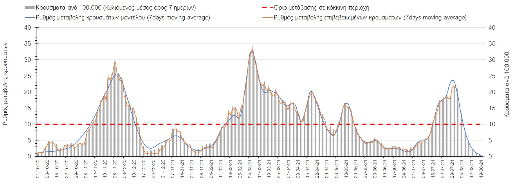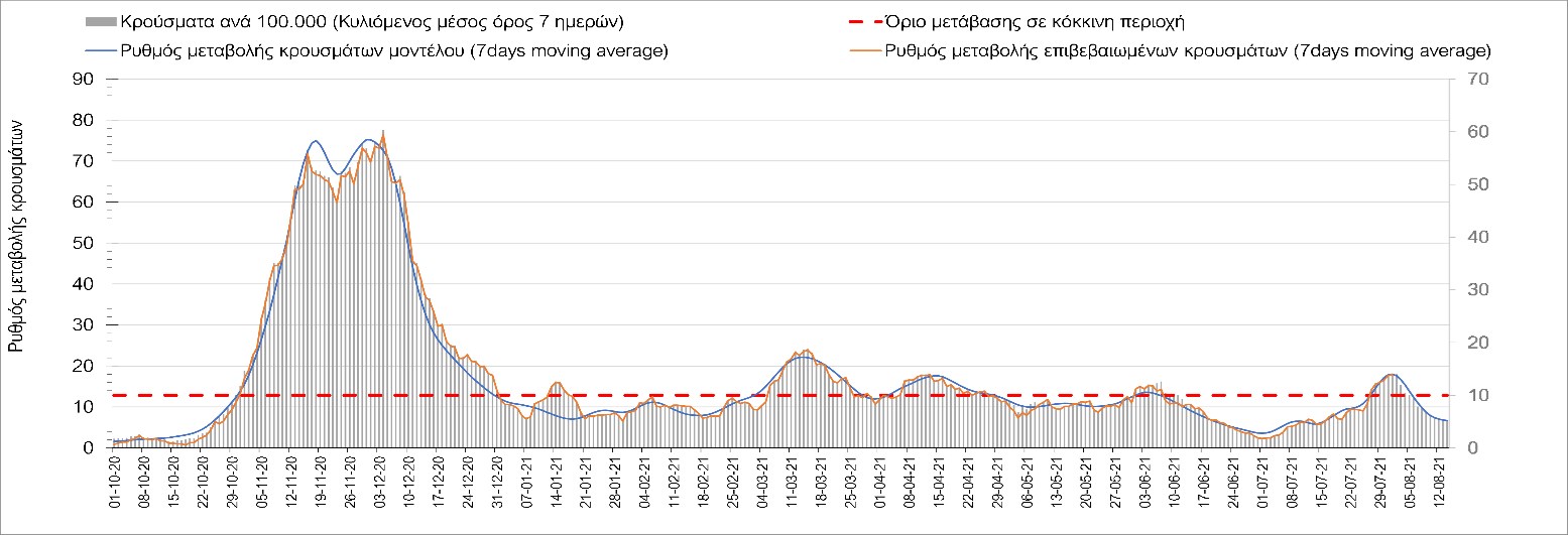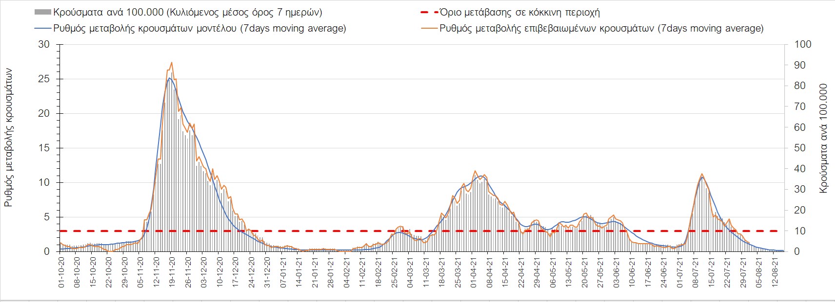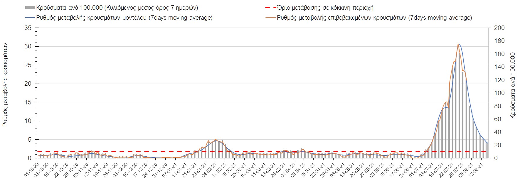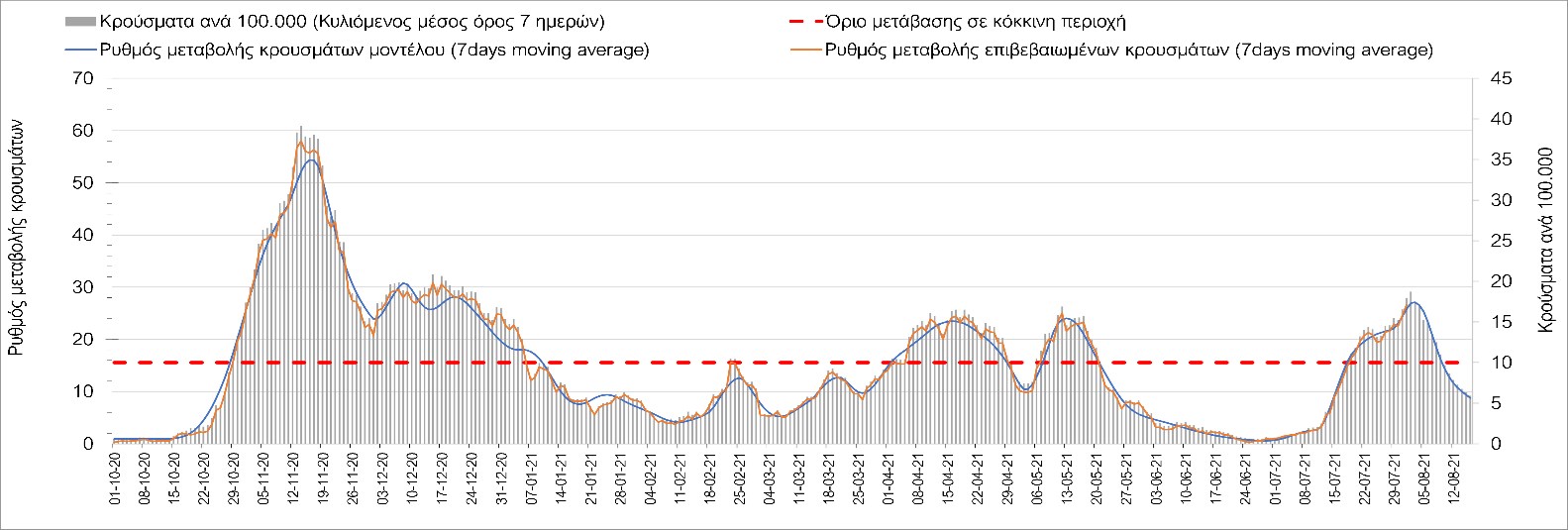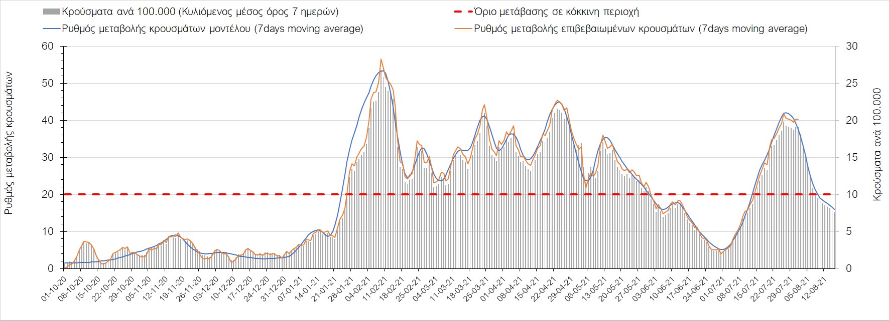 Σχήμα 58. Συγκριτικά αποτελέσματα της επιδημιολογικής εικόνας της σημερινής Κυριακής (01/08/2021) σε σχέση με την προηγούμενη (25/07/2021) Όσον αφορά επιμέρους περιοχές, αρκετές πλέον βρίσκονται πάνω από το όριο χαρακτηρισμού ως κόκκινες, όπως η Αθήνα, η Θεσσαλονίκη η Λάρισα, η Αχαΐα, η Αργολίδα, η Αρκαδία, η Κορινθία, η Μεσσηνία, η Εύβοια, η Βοιωτία, η Φωκίδα, η Φθιώτιδα, τα Ιωάννινα, η Θεσπρωτία, η Πρέβεζα, η Κοζάνη, η Ημαθία, η Καβάλα, η Φλώρινα, η Πέλλα, η Χαλκιδική, η Πιερία, ο Έβρος, το Ηράκλειο, τα Χανιά, το Ρέθυμνο, το Λασίθι, η Κέρκυρα, η Λέσβος, η Χίος, η Πάρος, η Ζάκυνθος, η Μύκονος, η Σαντορίνη και η Ρόδος, ενώ παρατηρούνται έντονα ανοδικές τάσεις στην Άρτα, στη Δράμα, στο Κιλκίς, στην Καστοριά, και στις Σέρρες. Ιδιαίτερα ανησυχητική είναι η αυξητική πορεία σε τουριστικούς προορισμούς όπως η Ρόδος (που αυτή τη στιγμή έχει την πιο έντονα ανοδική τάση), η Κέρκυρα, η Ζάκυνθος, η Χαλκιδική, η Χίος, η Λέσβος, η Θάσος, αλλά και σε περιοχές πιο κοντά στην Αθήνα όπως η Βοιωτία, η Εύβοια, η Κορινθία και η Αργολίδα. Στην Πελοπόννησο ανησυχητικά αυξητική τάση παρουσιάζουν σχεδόν όλες οι περιφερειακές ενότητες με εξαίρεση την Ηλεία, ενώ στην ηπειρωτική και Βόρειο Ελλάδα, η Κοζάνη, η Φλώρινα και ο Έβρος. Στην Κρήτη παραμένει σε υψηλά επίπεδα διασποράς το Ηράκλειο, όπως επίσης και τα Χανιά. Σε αυτές τις περιοχές συνιστούμε κινητοποίηση κλιμακίων του ΕΟΔΥ για αυξημένους ελέγχους με rapid test και καλή ιχνηλάτηση επαφών των θετικών περιπτώσεων.Ιδιαίτερα στην Αθήνα (παρά την πτωτική πορεία), προβληματίζει ο βαθμός που αυτή σχετίζεται με την εξάπλωση μεταλλαγμένων και ταχύτερα μεταδιδόμενων στελεχών (κυρίως το Β.1.1.318 και το Β.1.167). Χαρακτηριστικό παράδειγμα της αυξημένης μεταδοτικότητας του στελέχους Δ (Β.1.167) αποτελεί η Κρήτη. Συνολικά η Κρήτη είναι η περιοχή με τη χειρότερη επιδημιολογική εικόνα και η ταχύτητα μετάδοσης (και το αντίστοιχο ύψος του 4ου κύματος που έχει διαμορφωθεί) είναι ενδεικτική της αυξημένης μεταδοτικότητας του στελέχους Δ. Επίσης, καταδεικνύει τον αρνητικό ρόλο που παίζουν οι διαπεριφερειακές μετακινήσεις στη φάση ανάπτυξης της πανδημίας, καθώς η αρχική αύξηση κρουσμάτων στο Ρέθυμνο πρώτα και στο Ηράκλειο έπειτα, ακολουθήθηκε από αυξητική πορεία της διασποράς στα Χανιά και στο Λασίθι. Στην πράξη, η Κρήτη είναι μια περιοχή οδικά απομονωμένη από την υπόλοιπη Ελλάδα, στην οποία, οι διαπεριφερειακές μετακινήσεις επέτρεψαν τη γρήγορη διασπορά του στελέχους Δ. Παρόμοια φαινόμενα διαπεριφερειακής μετάδοσης παρατηρούνται στη Θεσσαλία, αλλά σε πιο ήπια έκταση, όπου η έντονα αυξητική τάση στη Μαγνησία, μεταφέρθηκε σε κάποιο βαθμό και στη Λάρισα, ενώ ακολουθεί και η Καρδίτσα. Αντίστοιχη είναι η διάχυση της διασποράς στην Ήπειρο και πιο συγκεκριμένα από τα Ιωάννινα προς τα εγγύς τουριστικά θέρετρα (Πρέβεζα και Θεσπρωτία). Συνεπώς, ακόμα και για περιοχές που για την ώρα είναι κάτω από το όριο (ή πολύ κοντά στο όριο), οι ανοδικές τάσεις που παρατηρούνται χρήζουν αυξημένης επιδημιολογικής επιτήρησης με εντατικοποίηση του γονιδιωματικού ελέγχου ώστε να ληφθούν εγκαίρως μέτρα περιορισμού της διασποράς του ιού.Επίσης, σύμφωνα με τα πιο πρόσφατα στοιχεία που έγιναν διαθέσιμα, ανησυχία πλέον δημιουργεί η αύξηση του ποσοστού διασποράς του μεταλλαγμένου στελέχους Β.1.617.2 (μετάλλαξη Δέλτα) σε συγκεκριμένες περιοχές για το 15νθήμερο από 04/07/2021 έως 18/07/2021, όπου οι αντίστοι
