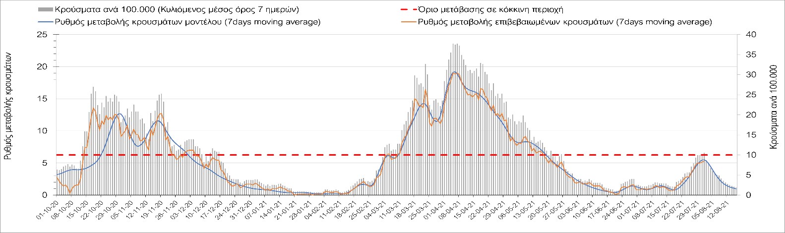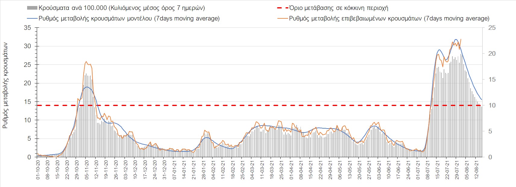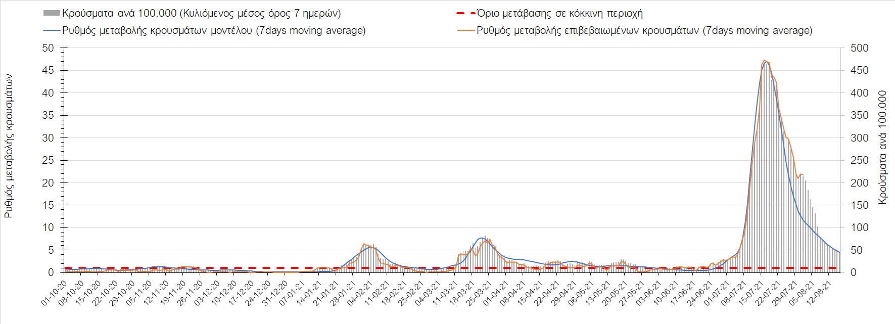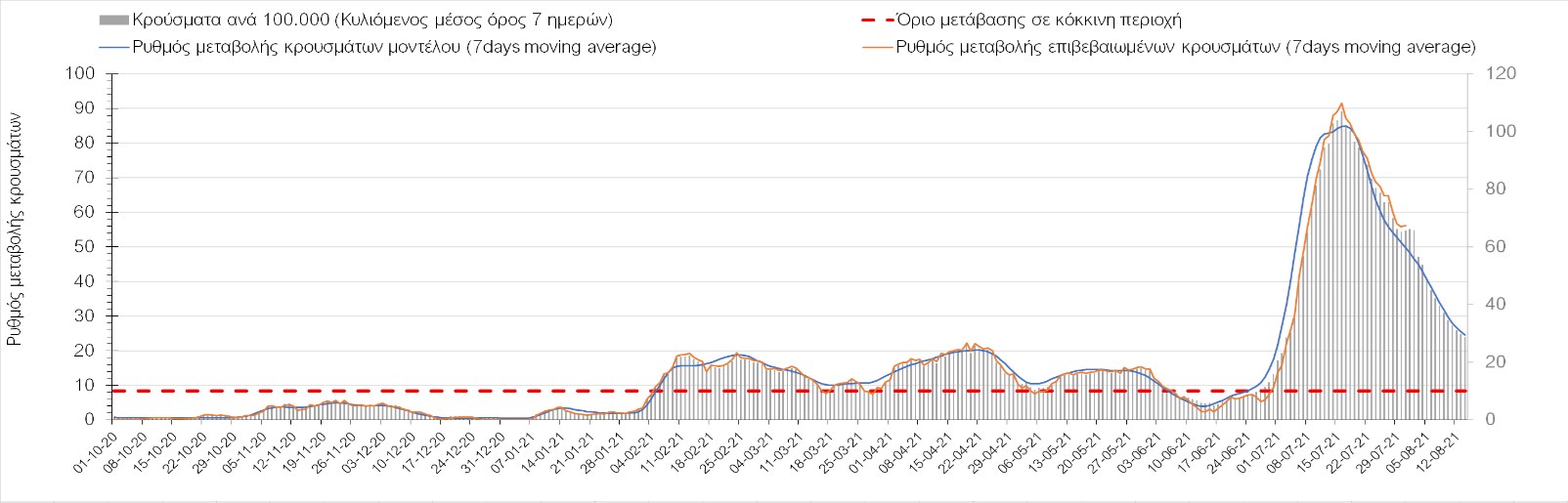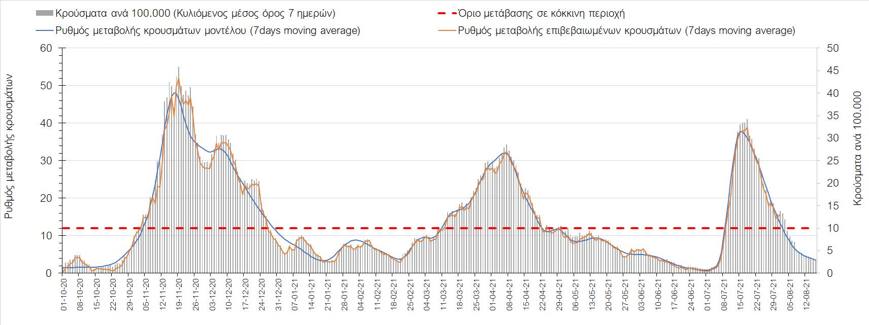 Σχήμα 58. Συγκριτικά αποτελέσματα της επιδημιολογικής εικόνας της σημερινής Κυριακής (01/08/2021) σε σχέση με την προηγούμενη (25/07/2021) Όσον αφορά επιμέρους περιοχές, αρκετές πλέον βρίσκονται πάνω από το όριο χαρακτηρισμού ως κόκκινες, όπως η Αθήνα, η Θεσσαλονίκη η Λάρισα, η Αχαΐα, η Αργολίδα, η Αρκαδία, η Κορινθία, η Μεσσηνία, η Εύβοια, η Βοιωτία, η Φωκίδα, η Φθιώτιδα, τα Ιωάννινα, η Θεσπρωτία, η Πρέβεζα, η Κοζάνη, η Ημαθία, η Καβάλα, η Φλώρινα, η Πέλλα, η Χαλκιδική, η Πιερία, ο Έβρος, το Ηράκλειο, τα Χανιά, το Ρέθυμνο, το Λασίθι, η Κέρκυρα, η Λέσβος, η Χίος, η Πάρος, η Ζάκυνθος, η Μύκονος, η Σαντορίνη και η Ρόδος, ενώ παρατηρούνται έντονα ανοδικές τάσεις στην Άρτα, στη Δράμα, στο Κιλκίς, στην Καστοριά, και στις Σέρρες. Ιδιαίτερα ανησυχητική είναι η αυξητική πορεία σε τουριστικούς προορισμούς όπως η Ρόδος (που αυτή τη στιγμή έχει την πιο έντονα ανοδική τάση), η Κέρκυρα, η Ζάκυνθος, η Χαλκιδική, η Χίος, η Λέσβος, η Θάσος, αλλά και σε περιοχές πιο κοντά στην Αθήνα όπως η Βοιωτία, η Εύβοια, η Κορινθία και η Αργολίδα. Στην Πελοπόννησο ανησυχητικά αυξητική τάση παρουσιάζουν σχεδόν όλες οι περιφερειακές ενότητες με εξαίρεση την Ηλεία, ενώ στην ηπειρωτική και Βόρειο Ελλάδα, η Κοζάνη, η Φλώρινα και ο Έβρος. Στην Κρήτη παραμένει σε υψηλά επίπεδα διασποράς το Ηράκλειο, όπως επίσης και τα Χανιά. Σε αυτές τις περιοχές συνιστούμε κινητοποίηση κλιμακίων του ΕΟΔΥ για αυξημένους ελέγχους με rapid test και καλή ιχνηλάτηση επαφών των θετικών περιπτώσεων.Ιδιαίτερα στην Αθήνα (παρά την πτωτική πορεία), προβληματίζει ο βαθμός που αυτή σχετίζεται με την εξάπλωση μεταλλαγμένων και ταχύτερα μεταδιδόμενων στελεχών (κυρίως το Β.1.1.318 και το Β.1.167). Χαρακτηριστικό παράδειγμα της αυξημένης μεταδοτικότητας του στελέχους Δ (Β.1.167) αποτελεί η Κρήτη. Συνολικά η Κρήτη είναι η περιοχή με τη χειρότερη επιδημιολογική εικόνα και η ταχύτητα μετάδοσης (και το αντίστοιχο ύψος του 4ου κύματος που έχει διαμορφωθεί) είναι ενδεικτική της αυξημένης μεταδοτικότητας του στελέχους Δ. Επίσης, καταδεικνύει τον αρνητικό ρόλο που παίζουν οι διαπεριφερειακές μετακινήσεις στη φάση ανάπτυξης της πανδημίας, καθώς η αρχική αύξηση κρουσμάτων στο Ρέθυμνο πρώτα και στο Ηράκλειο έπειτα, ακολουθήθηκε από αυξητική πορεία της διασποράς στα Χανιά και στο Λασίθι. Στην πράξη, η Κρήτη είναι μια περιοχή οδικά απομονωμένη από την υπόλοιπη Ελλάδα, στην οποία, οι διαπεριφερειακές μετακινήσεις επέτρεψαν τη γρήγορη διασπορά του στελέχους Δ. Παρόμοια φαινόμενα διαπεριφερειακής μετάδοσης παρατηρούνται στη Θεσσαλία, αλλά σε πιο ήπια έκταση, όπου η έντονα αυξητική τάση στη Μαγνησία, μεταφέρθηκε σε κάποιο βαθμό και στη Λάρισα, ενώ ακολουθεί και η Καρδίτσα. Αντίστοιχη είναι η διάχυση της διασποράς στην Ήπειρο και πιο συγκεκριμένα από τα Ιωάννινα προς τα εγγύς τουριστικά θέρετρα (Πρέβεζα και Θεσπρωτία). Συνεπώς, ακόμα και για περιοχές που για την ώρα είναι κάτω από το όριο (ή πολύ κοντά στο όριο), οι ανοδικές τάσεις που παρατηρούνται χρήζουν αυξημένης επιδημιολογικής επιτήρησης με εντατικοποίηση του γονιδιωματικού ελέγχου ώστε να ληφθούν εγκαίρως μέτρα περιορισμού της διασποράς του ιού.Επίσης, σύμφωνα με τα πιο πρόσφατα στοιχεία που έγιναν διαθέσιμα, ανησυχία πλέον δημιουργεί η αύξηση του ποσοστού διασποράς του μεταλλαγμένου στελέχους Β.1.617.2 (μετάλλαξη Δέλτα) σε συγκεκριμένες περιοχές για το 15νθήμερο από 04/07/2021 έως 18/07/2021, όπου οι αντίστοι