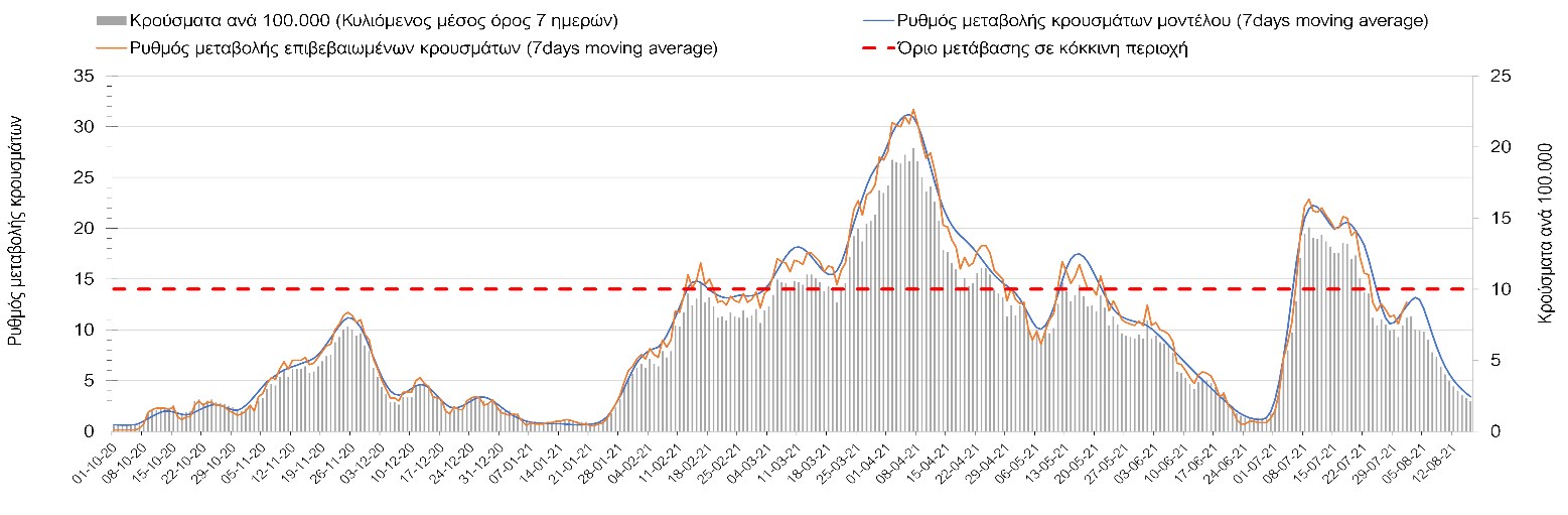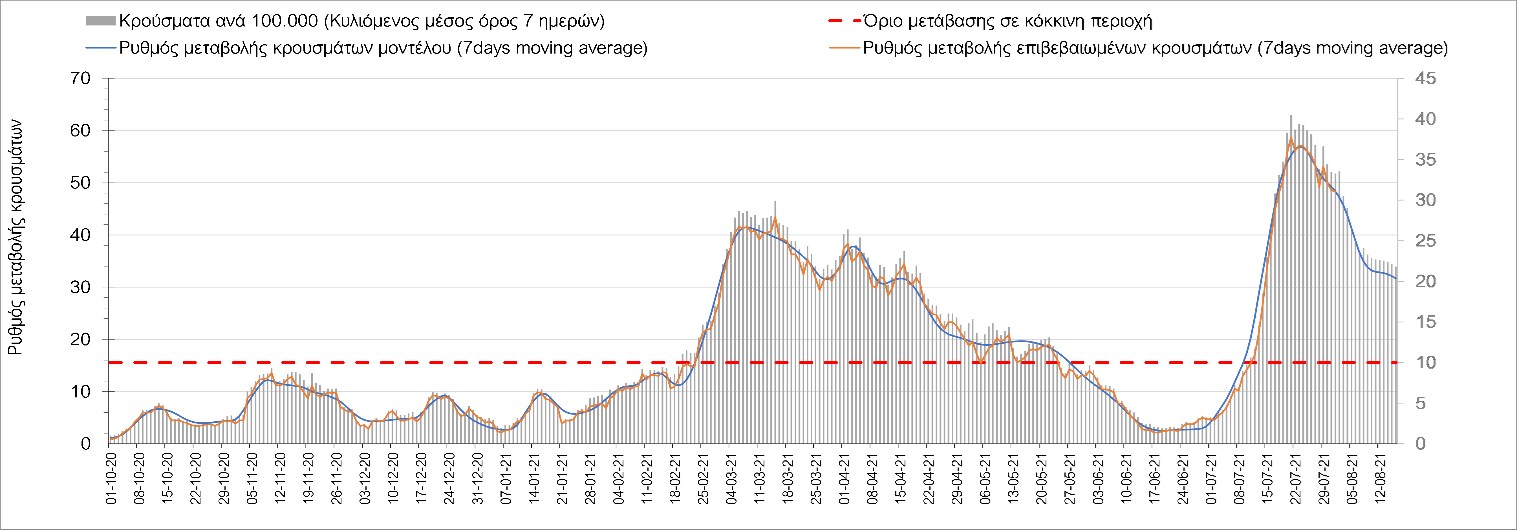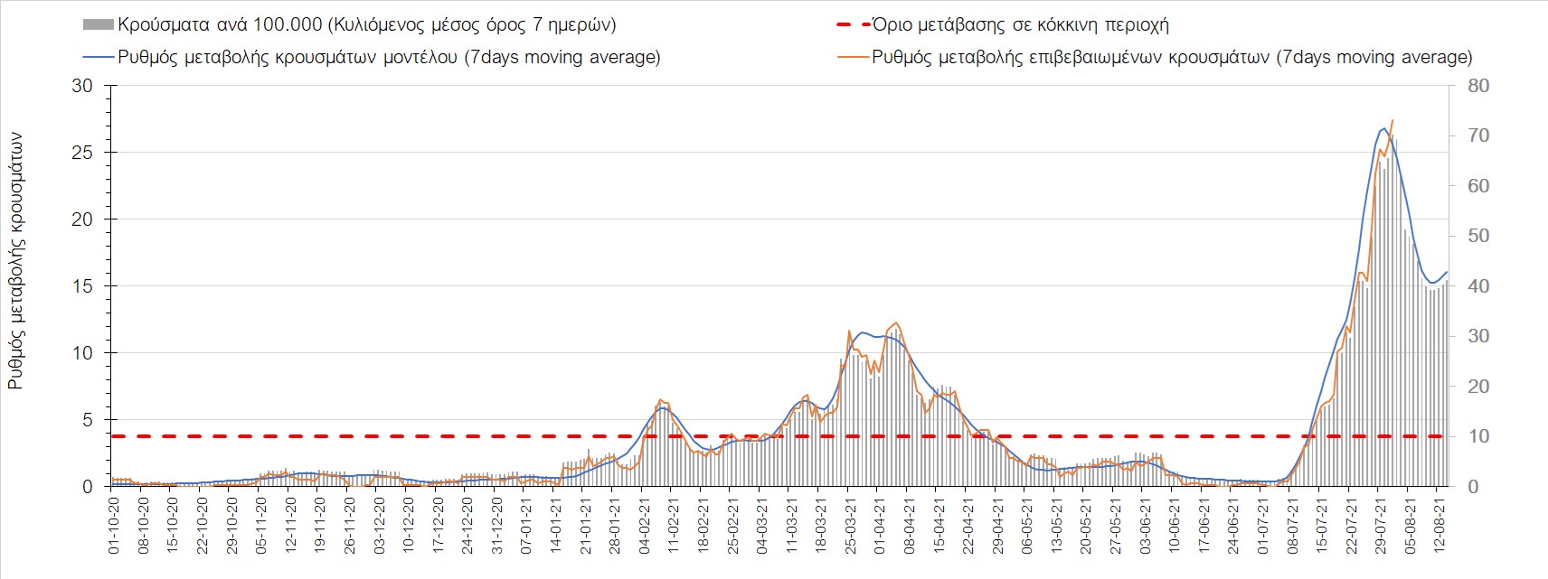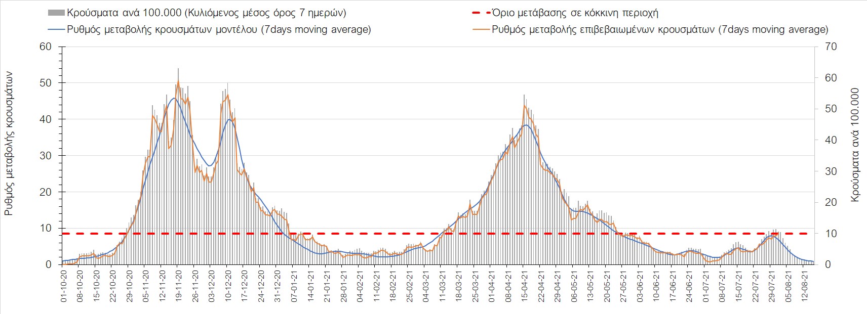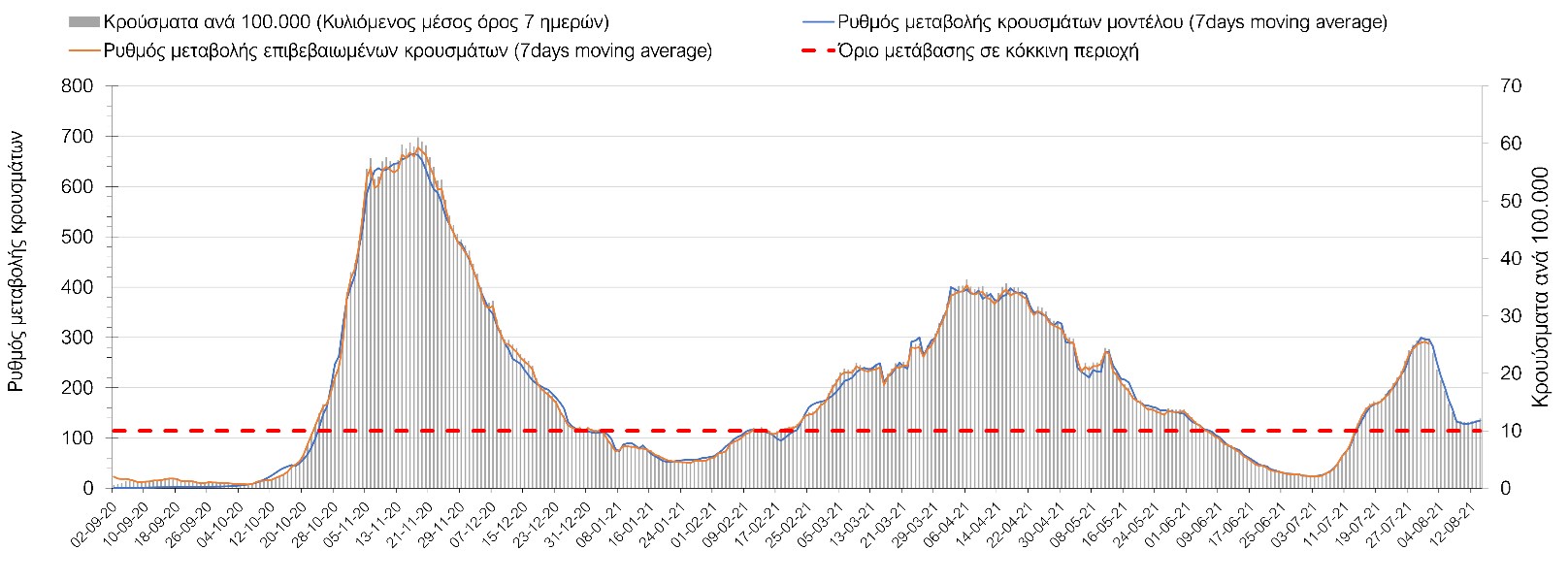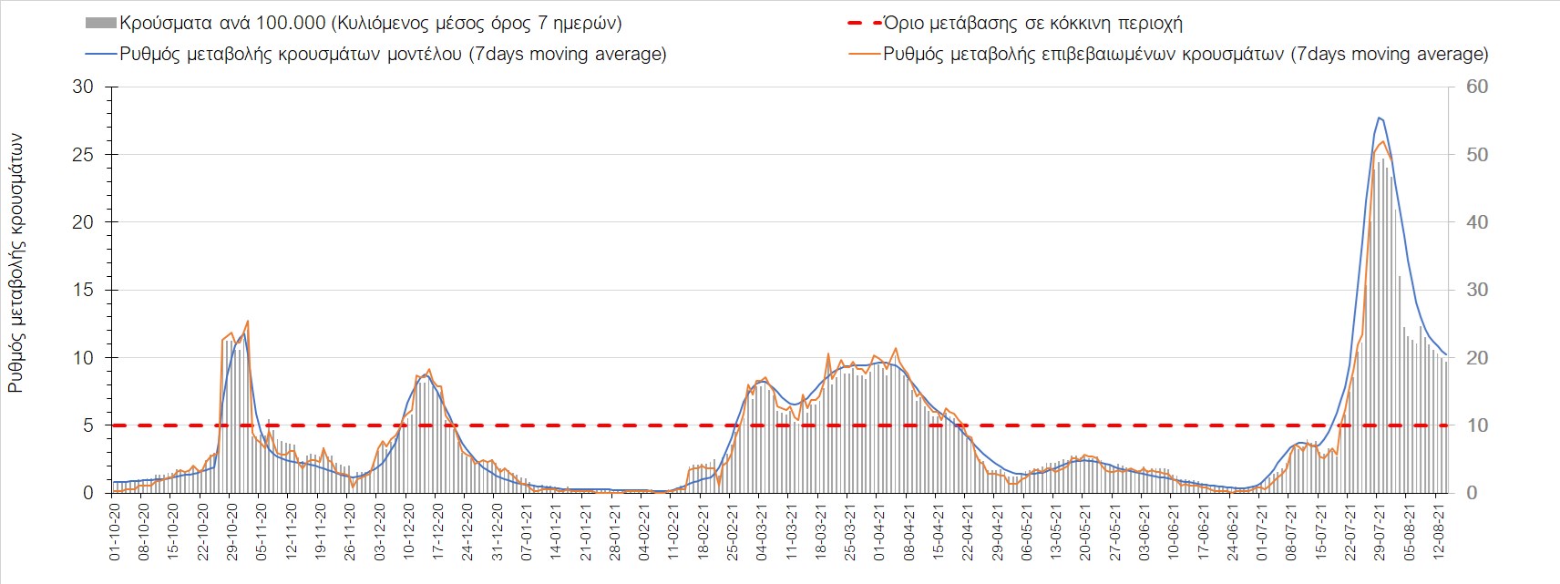 Σχήμα 58. Συγκριτικά αποτελέσματα της επιδημιολογικής εικόνας της σημερινής Κυριακής (01/08/2021) σε σχέση με την προηγούμενη (25/07/2021) Όσον αφορά επιμέρους περιοχές, αρκετές πλέον βρίσκονται πάνω από το όριο χαρακτηρισμού ως κόκκινες, όπως η Αθήνα, η Θεσσαλονίκη η Λάρισα, η Αχαΐα, η Αργολίδα, η Αρκαδία, η Κορινθία, η Μεσσηνία, η Εύβοια, η Βοιωτία, η Φωκίδα, η Φθιώτιδα, τα Ιωάννινα, η Θεσπρωτία, η Πρέβεζα, η Κοζάνη, η Ημαθία, η Καβάλα, η Φλώρινα, η Πέλλα, η Χαλκιδική, η Πιερία, ο Έβρος, το Ηράκλειο, τα Χανιά, το Ρέθυμνο, το Λασίθι, η Κέρκυρα, η Λέσβος, η Χίος, η Πάρος, η Ζάκυνθος, η Μύκονος, η Σαντορίνη και η Ρόδος, ενώ παρατηρούνται έντονα ανοδικές τάσεις στην Άρτα, στη Δράμα, στο Κιλκίς, στην Καστοριά, και στις Σέρρες. Ιδιαίτερα ανησυχητική είναι η αυξητική πορεία σε τουριστικούς προορισμούς όπως η Ρόδος (που αυτή τη στιγμή έχει την πιο έντονα ανοδική τάση), η Κέρκυρα, η Ζάκυνθος, η Χαλκιδική, η Χίος, η Λέσβος, η Θάσος, αλλά και σε περιοχές πιο κοντά στην Αθήνα όπως η Βοιωτία, η Εύβοια, η Κορινθία και η Αργολίδα. Στην Πελοπόννησο ανησυχητικά αυξητική τάση παρουσιάζουν σχεδόν όλες οι περιφερειακές ενότητες με εξαίρεση την Ηλεία, ενώ στην ηπειρωτική και Βόρειο Ελλάδα, η Κοζάνη, η Φλώρινα και ο Έβρος. Στην Κρήτη παραμένει σε υψηλά επίπεδα διασποράς το Ηράκλειο, όπως επίσης και τα Χανιά. Σε αυτές τις περιοχές συνιστούμε κινητοποίηση κλιμακίων του ΕΟΔΥ για αυξημένους ελέγχους με rapid test και καλή ιχνηλάτηση επαφών των θετικών περιπτώσεων.Ιδιαίτερα στην Αθήνα (παρά την πτωτική πορεία), προβληματίζει ο βαθμός που αυτή σχετίζεται με την εξάπλωση μεταλλαγμένων και ταχύτερα μεταδιδόμενων στελεχών (κυρίως το Β.1.1.318 και το Β.1.167). Χαρακτηριστικό παράδειγμα της αυξημένης μεταδοτικότητας του στελέχους Δ (Β.1.167) αποτελεί η Κρήτη. Συνολικά η Κρήτη είναι η περιοχή με τη χειρότερη επιδημιολογική εικόνα και η ταχύτητα μετάδοσης (και το αντίστοιχο ύψος του 4ου κύματος που έχει διαμορφωθεί) είναι ενδεικτική της αυξημένης μεταδοτικότητας του στελέχους Δ. Επίσης, καταδεικνύει τον αρνητικό ρόλο που παίζουν οι διαπεριφερειακές μετακινήσεις στη φάση ανάπτυξης της πανδημίας, καθώς η αρχική αύξηση κρουσμάτων στο Ρέθυμνο πρώτα και στο Ηράκλειο έπειτα, ακολουθήθηκε από αυξητική πορεία της διασποράς στα Χανιά και στο Λασίθι. Στην πράξη, η Κρήτη είναι μια περιοχή οδικά απομονωμένη από την υπόλοιπη Ελλάδα, στην οποία, οι διαπεριφερειακές μετακινήσεις επέτρεψαν τη γρήγορη διασπορά του στελέχους Δ. Παρόμοια φαινόμενα διαπεριφερειακής μετάδοσης παρατηρούνται στη Θεσσαλία, αλλά σε πιο ήπια έκταση, όπου η έντονα αυξητική τάση στη Μαγνησία, μεταφέρθηκε σε κάποιο βαθμό και στη Λάρισα, ενώ ακολουθεί και η Καρδίτσα. Αντίστοιχη είναι η διάχυση της διασποράς στην Ήπειρο και πιο συγκεκριμένα από τα Ιωάννινα προς τα εγγύς τουριστικά θέρετρα (Πρέβεζα και Θεσπρωτία). Συνεπώς, ακόμα και για περιοχές που για την ώρα είναι κάτω από το όριο (ή πολύ κοντά στο όριο), οι ανοδικές τάσεις που παρατηρούνται χρήζουν αυξημένης επιδημιολογικής επιτήρησης με εντατικοποίηση του γονιδιωματικού ελέγχου ώστε να ληφθούν εγκαίρως μέτρα περιορισμού της διασποράς του ιού.Επίσης, σύμφωνα με τα πιο πρόσφατα στοιχεία που έγιναν διαθέσιμα, ανησυχία πλέον δημιουργεί η αύξηση του ποσοστού διασποράς του μεταλλαγμένου στελέχους Β.1.617.2 (μετάλλαξη Δέλτα) σε συγκεκριμένες περιοχές για το 15νθήμερο από 04/07/2021 έως 18/07/2021, όπου οι αντίστοι
