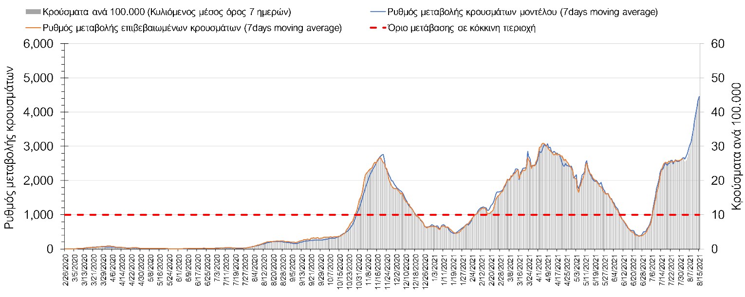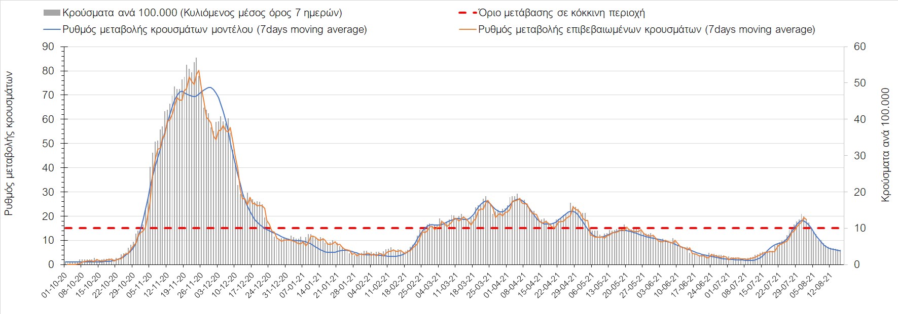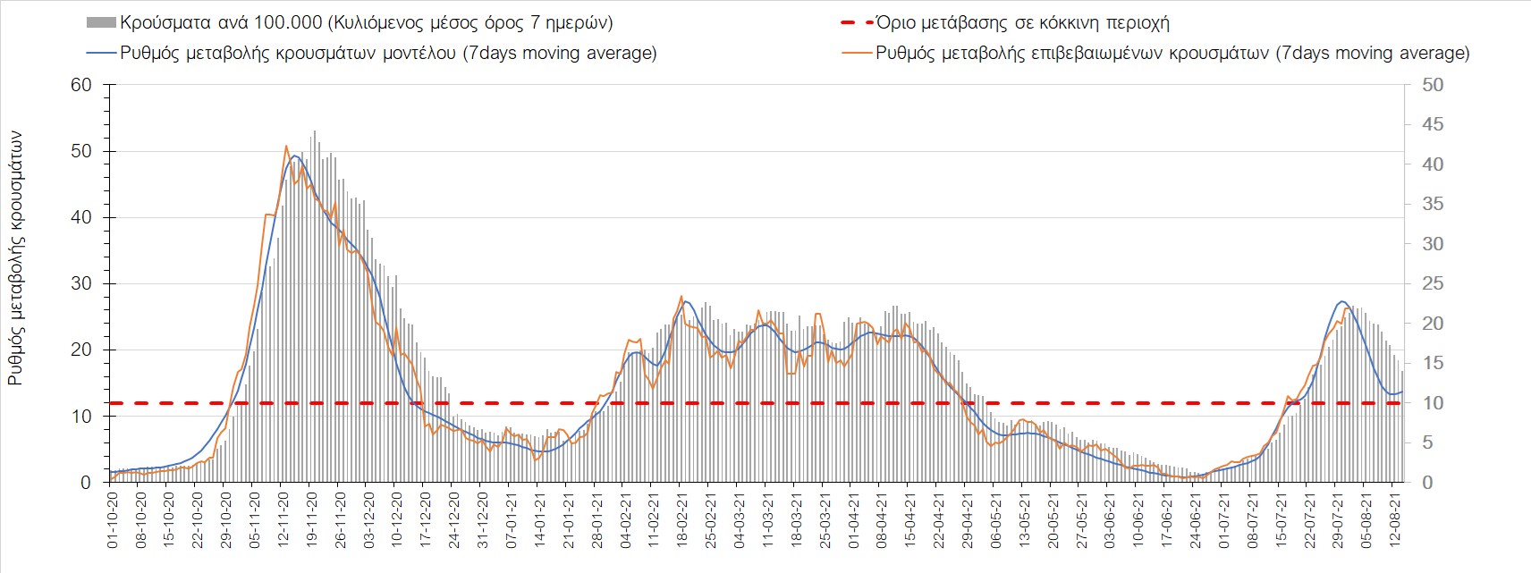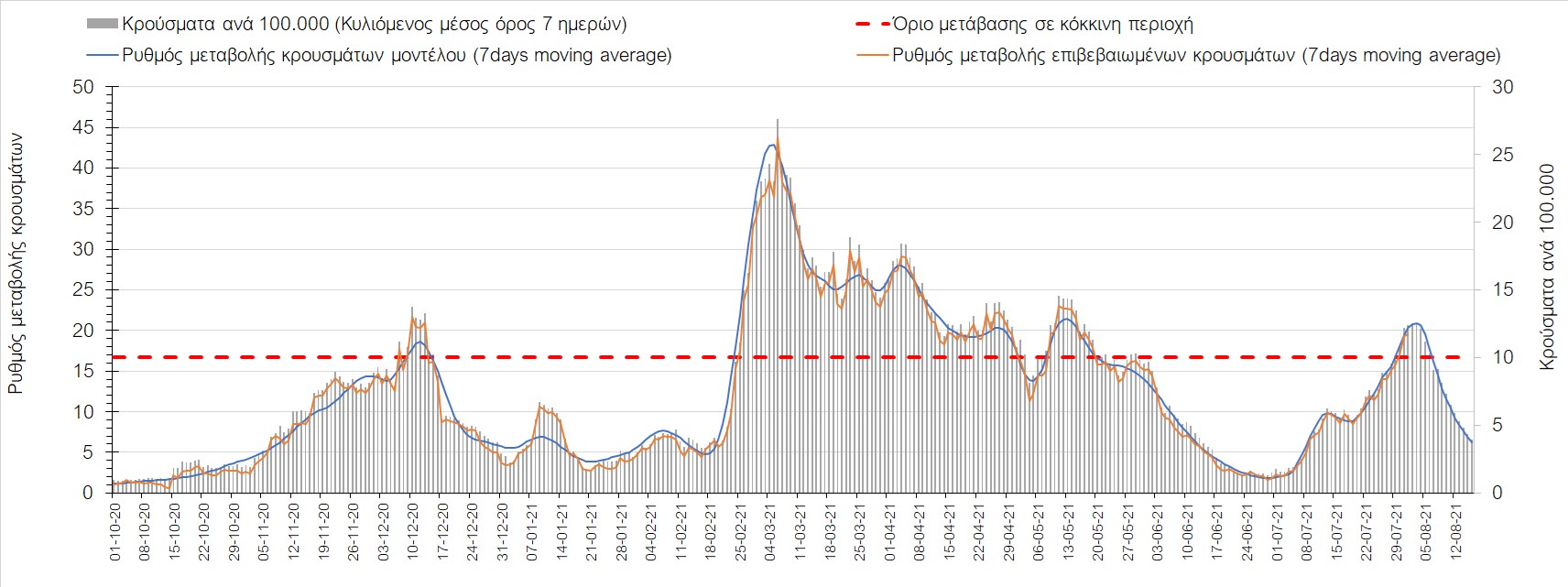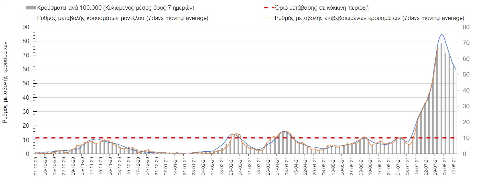 Σχήμα 58. Συγκριτικά αποτελέσματα της επιδημιολογικής εικόνας της σημερινής Κυριακής (01/08/2021) σε σχέση με την προηγούμενη (25/07/2021) Όσον αφορά επιμέρους περιοχές, αρκετές πλέον βρίσκονται πάνω από το όριο χαρακτηρισμού ως κόκκινες, όπως η Αθήνα, η Θεσσαλονίκη η Λάρισα, η Αχαΐα, η Αργολίδα, η Αρκαδία, η Κορινθία, η Μεσσηνία, η Εύβοια, η Βοιωτία, η Φωκίδα, η Φθιώτιδα, τα Ιωάννινα, η Θεσπρωτία, η Πρέβεζα, η Κοζάνη, η Ημαθία, η Καβάλα, η Φλώρινα, η Πέλλα, η Χαλκιδική, η Πιερία, ο Έβρος, το Ηράκλειο, τα Χανιά, το Ρέθυμνο, το Λασίθι, η Κέρκυρα, η Λέσβος, η Χίος, η Πάρος, η Ζάκυνθος, η Μύκονος, η Σαντορίνη και η Ρόδος, ενώ παρατηρούνται έντονα ανοδικές τάσεις στην Άρτα, στη Δράμα, στο Κιλκίς, στην Καστοριά, και στις Σέρρες. Ιδιαίτερα ανησυχητική είναι η αυξητική πορεία σε τουριστικούς προορισμούς όπως η Ρόδος (που αυτή τη στιγμή έχει την πιο έντονα ανοδική τάση), η Κέρκυρα, η Ζάκυνθος, η Χαλκιδική, η Χίος, η Λέσβος, η Θάσος, αλλά και σε περιοχές πιο κοντά στην Αθήνα όπως η Βοιωτία, η Εύβοια, η Κορινθία και η Αργολίδα. Στην Πελοπόννησο ανησυχητικά αυξητική τάση παρουσιάζουν σχεδόν όλες οι περιφερειακές ενότητες με εξαίρεση την Ηλεία, ενώ στην ηπειρωτική και Βόρειο Ελλάδα, η Κοζάνη, η Φλώρινα και ο Έβρος. Στην Κρήτη παραμένει σε υψηλά επίπεδα διασποράς το Ηράκλειο, όπως επίσης και τα Χανιά. Σε αυτές τις περιοχές συνιστούμε κινητοποίηση κλιμακίων του ΕΟΔΥ για αυξημένους ελέγχους με rapid test και καλή ιχνηλάτηση επαφών των θετικών περιπτώσεων.Ιδιαίτερα στην Αθήνα (παρά την πτωτική πορεία), προβληματίζει ο βαθμός που αυτή σχετίζεται με την εξάπλωση μεταλλαγμένων και ταχύτερα μεταδιδόμενων στελεχών (κυρίως το Β.1.1.318 και το Β.1.167). Χαρακτηριστικό παράδειγμα της αυξημένης μεταδοτικότητας του στελέχους Δ (Β.1.167) αποτελεί η Κρήτη. Συνολικά η Κρήτη είναι η περιοχή με τη χειρότερη επιδημιολογική εικόνα και η ταχύτητα μετάδοσης (και το αντίστοιχο ύψος του 4ου κύματος που έχει διαμορφωθεί) είναι ενδεικτική της αυξημένης μεταδοτικότητας του στελέχους Δ. Επίσης, καταδεικνύει τον αρνητικό ρόλο που παίζουν οι διαπεριφερειακές μετακινήσεις στη φάση ανάπτυξης της πανδημίας, καθώς η αρχική αύξηση κρουσμάτων στο Ρέθυμνο πρώτα και στο Ηράκλειο έπειτα, ακολουθήθηκε από αυξητική πορεία της διασποράς στα Χανιά και στο Λασίθι. Στην πράξη, η Κρήτη είναι μια περιοχή οδικά απομονωμένη από την υπόλοιπη Ελλάδα, στην οποία, οι διαπεριφερειακές μετακινήσεις επέτρεψαν τη γρήγορη διασπορά του στελέχους Δ. Παρόμοια φαινόμενα διαπεριφερειακής μετάδοσης παρατηρούνται στη Θεσσαλία, αλλά σε πιο ήπια έκταση, όπου η έντονα αυξητική τάση στη Μαγνησία, μεταφέρθηκε σε κάποιο βαθμό και στη Λάρισα, ενώ ακολουθεί και η Καρδίτσα. Αντίστοιχη είναι η διάχυση της διασποράς στην Ήπειρο και πιο συγκεκριμένα από τα Ιωάννινα προς τα εγγύς τουριστικά θέρετρα (Πρέβεζα και Θεσπρωτία). Συνεπώς, ακόμα και για περιοχές που για την ώρα είναι κάτω από το όριο (ή πολύ κοντά στο όριο), οι ανοδικές τάσεις που παρατηρούνται χρήζουν αυξημένης επιδημιολογικής επιτήρησης με εντατικοποίηση του γονιδιωματικού ελέγχου ώστε να ληφθούν εγκαίρως μέτρα περιορισμού της διασποράς του ιού.Επίσης, σύμφωνα με τα πιο πρόσφατα στοιχεία που έγιναν διαθέσιμα, ανησυχία πλέον δημιουργεί η αύξηση του ποσοστού διασποράς του μεταλλαγμένου στελέχους Β.1.617.2 (μετάλλαξη Δέλτα) σε συγκεκριμένες περιοχές για το 15νθήμερο από 04/07/2021 έως 18/07/2021, όπου οι αντίστοι