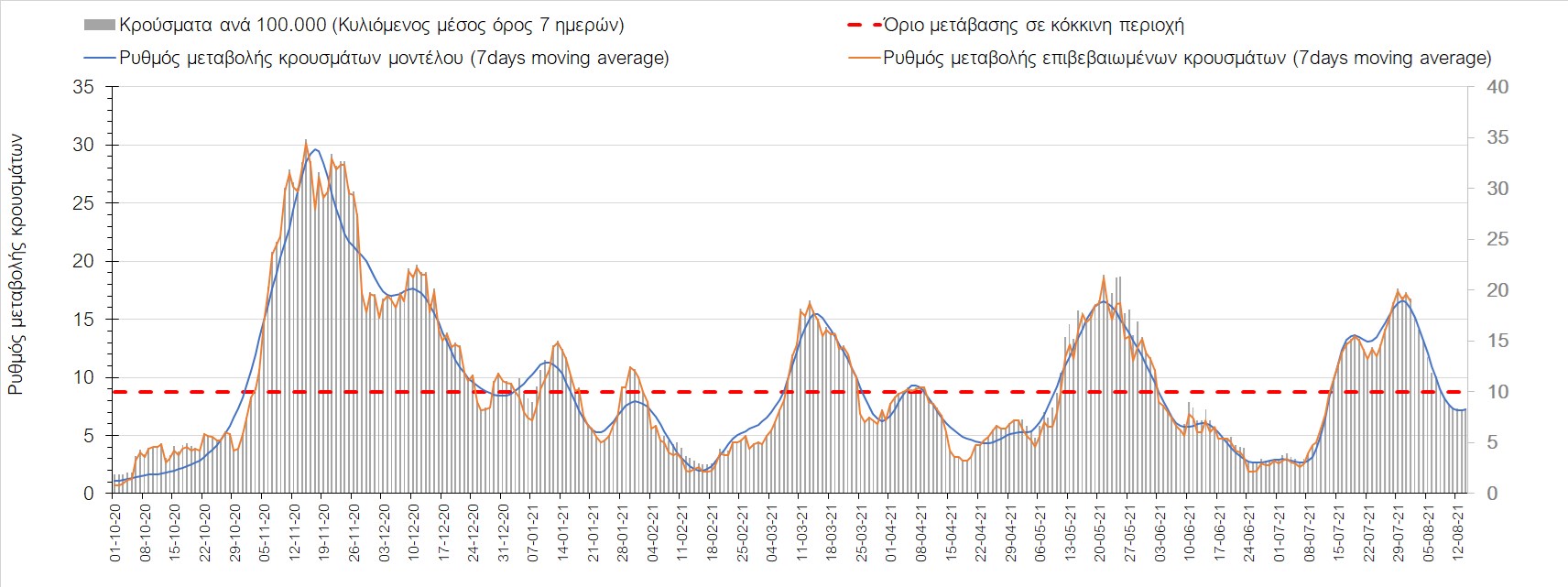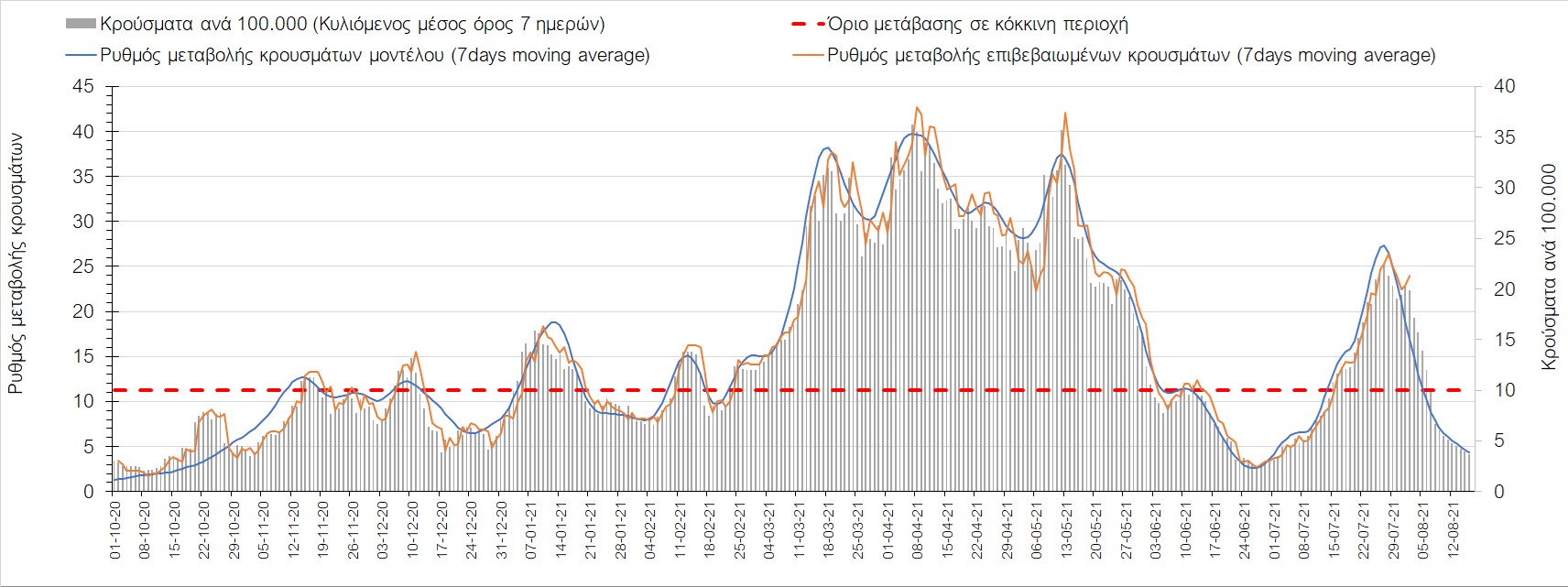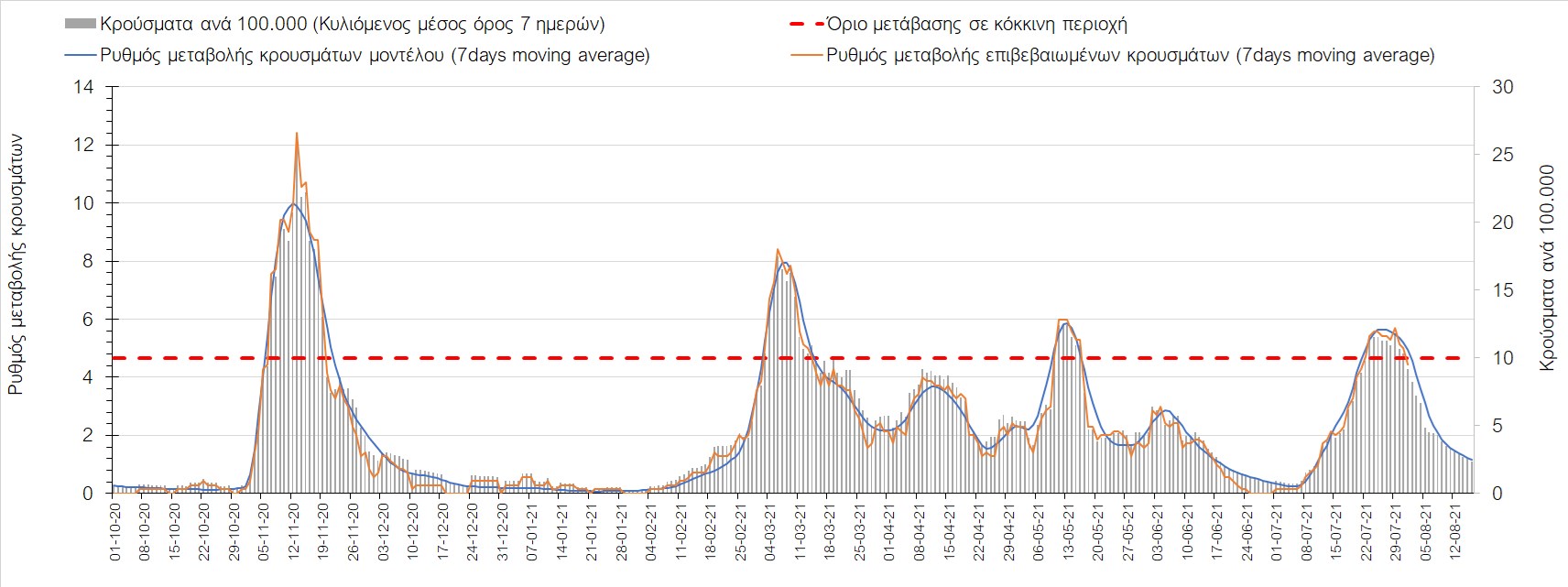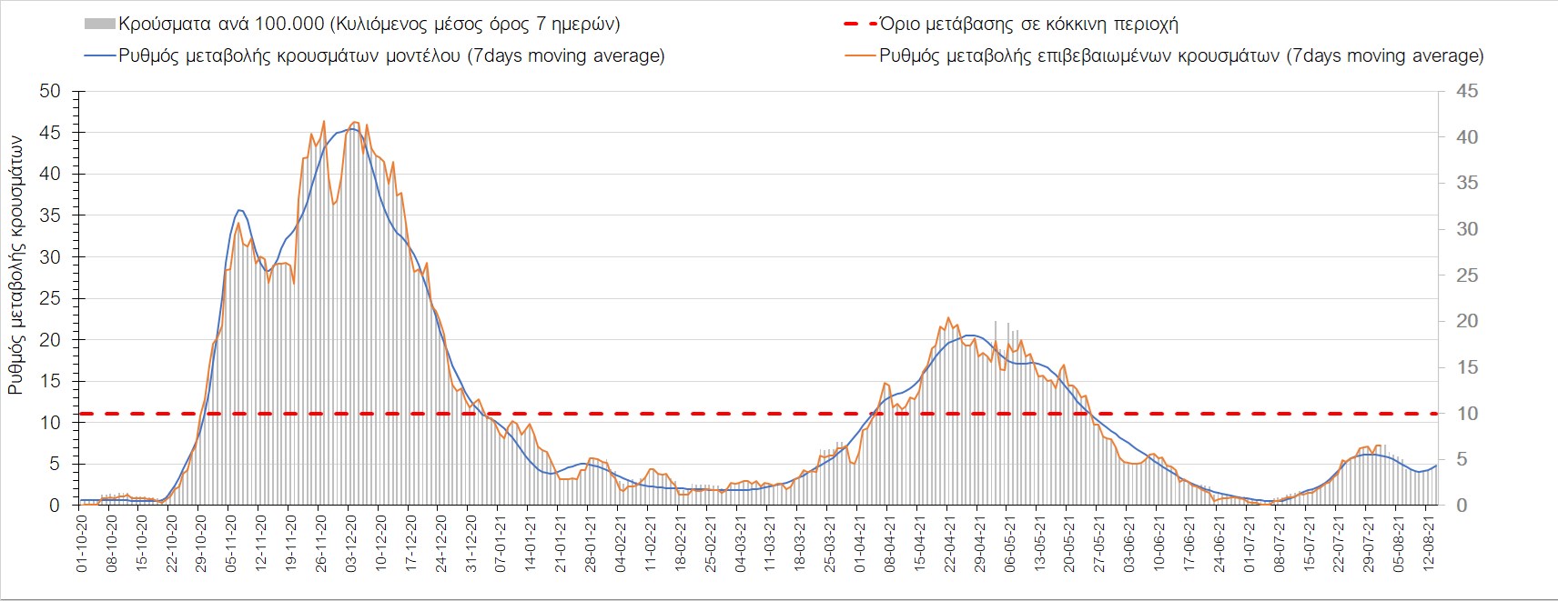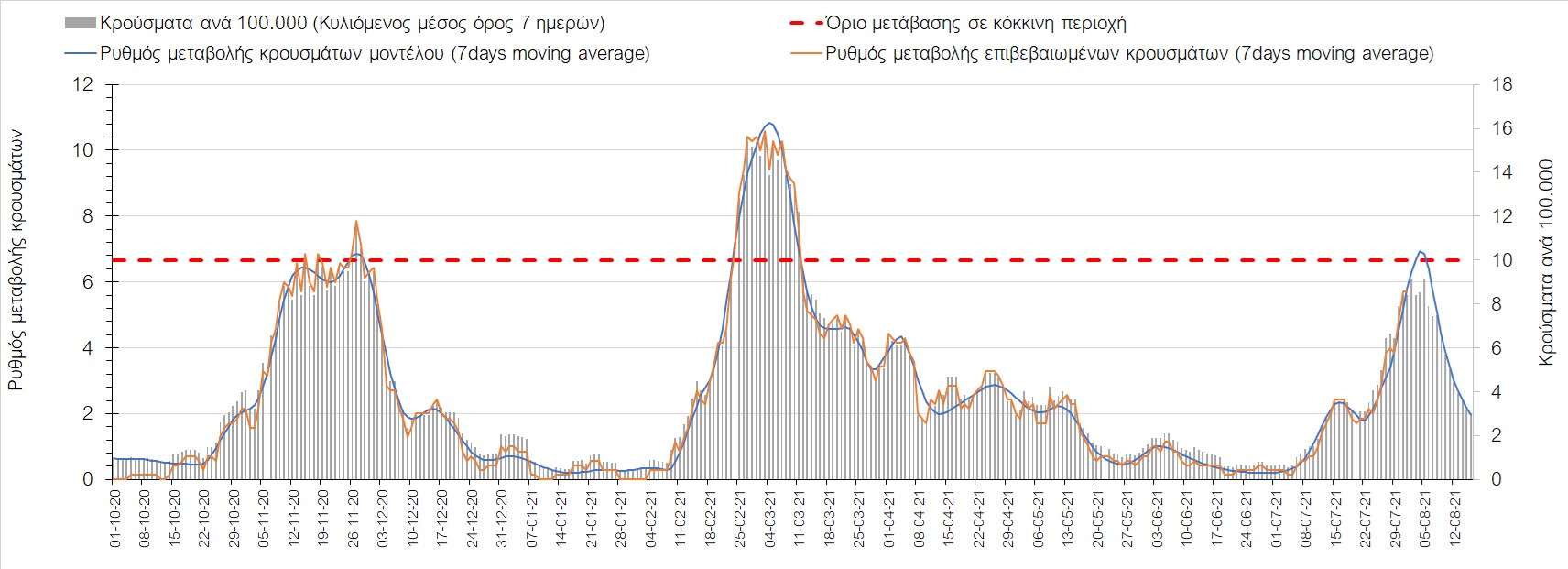 Σχήμα 58. Συγκριτικά αποτελέσματα της επιδημιολογικής εικόνας της σημερινής Κυριακής (01/08/2021) σε σχέση με την προηγούμενη (25/07/2021) Όσον αφορά επιμέρους περιοχές, αρκετές πλέον βρίσκονται πάνω από το όριο χαρακτηρισμού ως κόκκινες, όπως η Αθήνα, η Θεσσαλονίκη η Λάρισα, η Αχαΐα, η Αργολίδα, η Αρκαδία, η Κορινθία, η Μεσσηνία, η Εύβοια, η Βοιωτία, η Φωκίδα, η Φθιώτιδα, τα Ιωάννινα, η Θεσπρωτία, η Πρέβεζα, η Κοζάνη, η Ημαθία, η Καβάλα, η Φλώρινα, η Πέλλα, η Χαλκιδική, η Πιερία, ο Έβρος, το Ηράκλειο, τα Χανιά, το Ρέθυμνο, το Λασίθι, η Κέρκυρα, η Λέσβος, η Χίος, η Πάρος, η Ζάκυνθος, η Μύκονος, η Σαντορίνη και η Ρόδος, ενώ παρατηρούνται έντονα ανοδικές τάσεις στην Άρτα, στη Δράμα, στο Κιλκίς, στην Καστοριά, και στις Σέρρες. Ιδιαίτερα ανησυχητική είναι η αυξητική πορεία σε τουριστικούς προορισμούς όπως η Ρόδος (που αυτή τη στιγμή έχει την πιο έντονα ανοδική τάση), η Κέρκυρα, η Ζάκυνθος, η Χαλκιδική, η Χίος, η Λέσβος, η Θάσος, αλλά και σε περιοχές πιο κοντά στην Αθήνα όπως η Βοιωτία, η Εύβοια, η Κορινθία και η Αργολίδα. Στην Πελοπόννησο ανησυχητικά αυξητική τάση παρουσιάζουν σχεδόν όλες οι περιφερειακές ενότητες με εξαίρεση την Ηλεία, ενώ στην ηπειρωτική και Βόρειο Ελλάδα, η Κοζάνη, η Φλώρινα και ο Έβρος. Στην Κρήτη παραμένει σε υψηλά επίπεδα διασποράς το Ηράκλειο, όπως επίσης και τα Χανιά. Σε αυτές τις περιοχές συνιστούμε κινητοποίηση κλιμακίων του ΕΟΔΥ για αυξημένους ελέγχους με rapid test και καλή ιχνηλάτηση επαφών των θετικών περιπτώσεων.Ιδιαίτερα στην Αθήνα (παρά την πτωτική πορεία), προβληματίζει ο βαθμός που αυτή σχετίζεται με την εξάπλωση μεταλλαγμένων και ταχύτερα μεταδιδόμενων στελεχών (κυρίως το Β.1.1.318 και το Β.1.167). Χαρακτηριστικό παράδειγμα της αυξημένης μεταδοτικότητας του στελέχους Δ (Β.1.167) αποτελεί η Κρήτη. Συνολικά η Κρήτη είναι η περιοχή με τη χειρότερη επιδημιολογική εικόνα και η ταχύτητα μετάδοσης (και το αντίστοιχο ύψος του 4ου κύματος που έχει διαμορφωθεί) είναι ενδεικτική της αυξημένης μεταδοτικότητας του στελέχους Δ. Επίσης, καταδεικνύει τον αρνητικό ρόλο που παίζουν οι διαπεριφερειακές μετακινήσεις στη φάση ανάπτυξης της πανδημίας, καθώς η αρχική αύξηση κρουσμάτων στο Ρέθυμνο πρώτα και στο Ηράκλειο έπειτα, ακολουθήθηκε από αυξητική πορεία της διασποράς στα Χανιά και στο Λασίθι. Στην πράξη, η Κρήτη είναι μια περιοχή οδικά απομονωμένη από την υπόλοιπη Ελλάδα, στην οποία, οι διαπεριφερειακές μετακινήσεις επέτρεψαν τη γρήγορη διασπορά του στελέχους Δ. Παρόμοια φαινόμενα διαπεριφερειακής μετάδοσης παρατηρούνται στη Θεσσαλία, αλλά σε πιο ήπια έκταση, όπου η έντονα αυξητική τάση στη Μαγνησία, μεταφέρθηκε σε κάποιο βαθμό και στη Λάρισα, ενώ ακολουθεί και η Καρδίτσα. Αντίστοιχη είναι η διάχυση της διασποράς στην Ήπειρο και πιο συγκεκριμένα από τα Ιωάννινα προς τα εγγύς τουριστικά θέρετρα (Πρέβεζα και Θεσπρωτία). Συνεπώς, ακόμα και για περιοχές που για την ώρα είναι κάτω από το όριο (ή πολύ κοντά στο όριο), οι ανοδικές τάσεις που παρατηρούνται χρήζουν αυξημένης επιδημιολογικής επιτήρησης με εντατικοποίηση του γονιδιωματικού ελέγχου ώστε να ληφθούν εγκαίρως μέτρα περιορισμού της διασποράς του ιού.Επίσης, σύμφωνα με τα πιο πρόσφατα στοιχεία που έγιναν διαθέσιμα, ανησυχία πλέον δημιουργεί η αύξηση του ποσοστού διασποράς του μεταλλαγμένου στελέχους Β.1.617.2 (μετάλλαξη Δέλτα) σε συγκεκριμένες περιοχές για το 15νθήμερο από 04/07/2021 έως 18/07/2021, όπου οι αντίστοι