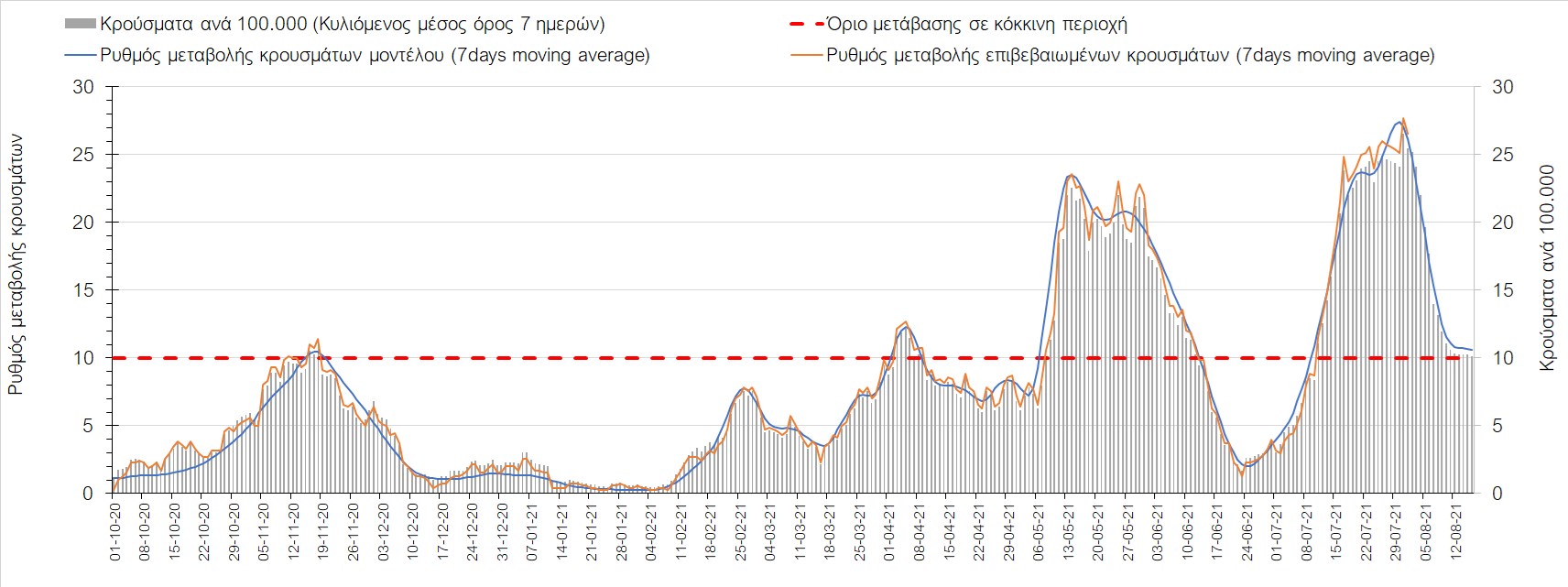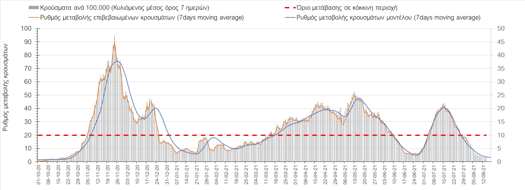 - Θεωρήσαμε ότι από τις αρχές Αυγούστου, θα έχουμε αύξηση των επαφών λόγω της μαζικής εξόδου των διακοπών, με τρόπο παραπλήσιο με αυτόν που παρατηρήθηκε το καλοκαίρι του 2020.