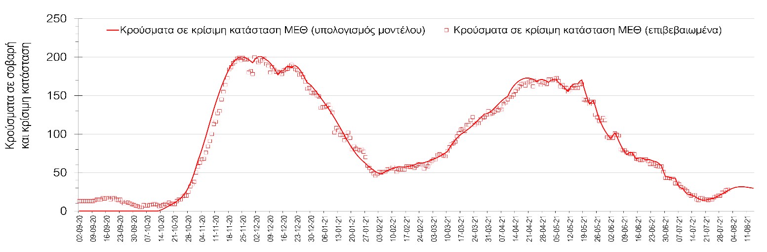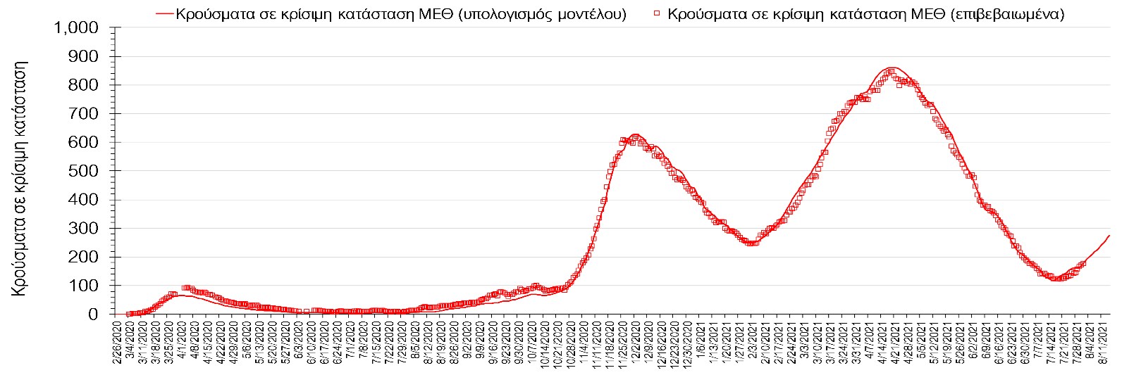 Σύμφωνα με τα στοιχεία του ΕΟΔΥ, ο αριθμός κρουσμάτων της Κυριακής ανέρχεται στα 1605 νέα κρούσματα, με τα αποτελέσματα να συνάδουν με τις προβλέψεις της υπολογιστικής πλατφόρμας CORE (n=1663), που λαμβάνουν υπόψη την διασπορά όλων των μεταλλαγμένων στελεχών του SARS-CoV-2. Ο αριθμός των τεστ που πραγματοποιήθηκαν ήταν 68.376 και σε συνδυασμό με τον αριθμό των κρουσμάτων, ο δείκτης θετικότητας διαμορφώθηκε στο 2,3%. Η πραγματοποίηση αριθμού τεστ σε επίπεδα άνω των 50.000 την ημέρα, συντελεί στο να εξάγουμε πιο ασφαλή συμπεράσματα σχετικά με την πορεία της πανδημίας, αλλά και να εντοπίζονται περισσότεροι ασυμπτωματικοί και προσυμπτωματικοί, συντελώντας στην ανάσχεση πιθανής έξαρσης που θα μπορούσε να συμβεί λόγω της εμφάνισης ολοένα και ταχύτερα μεταδιδόμενων στελεχών, σε συνδυασμό με τα υπάρχοντα ανοίγματα και τις τουριστικές ροές. Σημαντικοί σύμμαχοι σε αυτή την προσπάθεια αύξησης του αριθμού των τεστ ανίχνευσης του SARS-CoV-2 αποτελούν εκτός από τα rapid test και τα self test, για να καταπολεμηθεί η δυναμική αύξησης της διασποράς στις περιοχές όπου μια τέτοια αύξηση διαφαίνεται από τα μέχρι τώρα δεδομένα και την υπολογιστική πλατφόρμα CORE, αλλά και για να συνεχιστεί η πολύ καλή πορεία στο σύνολο της χώρας.Ο αριθμός ημερήσιων θανάτων (10) που καταγράφηκε είναι μικρότερος από προχθές (17). Όπως είχαμε προβλέψει ο κυλιόμενος εβδομαδιαίος μέσος όρος που είναι 9 παραμένει σε χαμηλά επίπεδα, αλλά αναμένεται να ακολουθήσει την ανοδική τάση των ασθενών σε κρίσιμη κατάσταση. Όσον αφορά στους ασθενείς σε κρίσιμη κατάσταση (διασωληνωμένοι σε ΜΕΘ), ο αριθμός είναι αυξημένος σε σχέση με προχθές (176 από 172), και πλέον βλέπουμε την επιβράδυνση της πτώσης να έχει οδηγήσει προς την αναμενόμενη αναστροφή της πτωτικής πορείας να συμβαίνει την χρονική στιγμή που αναμέναμε. Η καμπύλη εξέλιξης του αριθμού των ασθενών που νοσηλεύονται σε κλίνες ΜΕΘ με βάση τις προσομοιώσεις της πλατφόρμας CORE, όπως αυτή παρουσιάζεται στο Σχήμα 1, των ασθενών που νοσηλεύονται σε απλές κλίνες στο Σχήμα 2 (όπου διαφαίνεται πλέον η αναμενόμενη αύξηση στις νοσηλείες), ενώ μια εκτίμηση για την πορεία των θανάτων ανά ημέρα παρουσιάζεται στο Σχήμα 3.