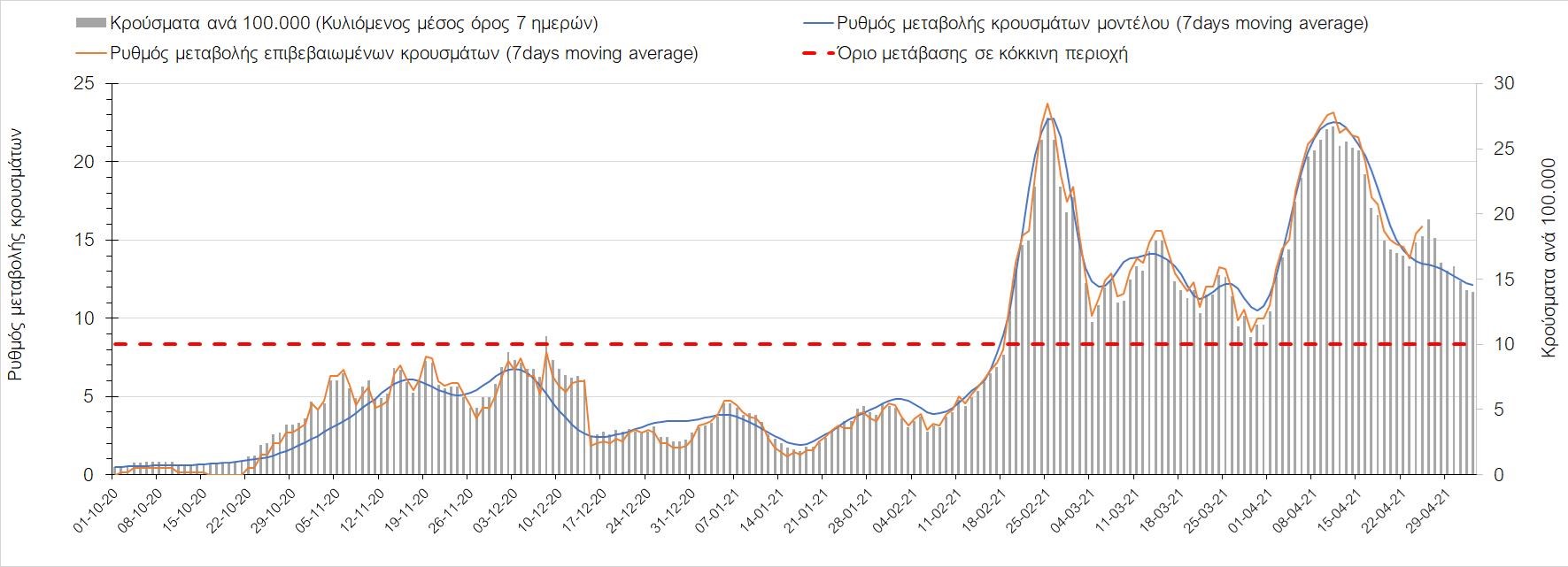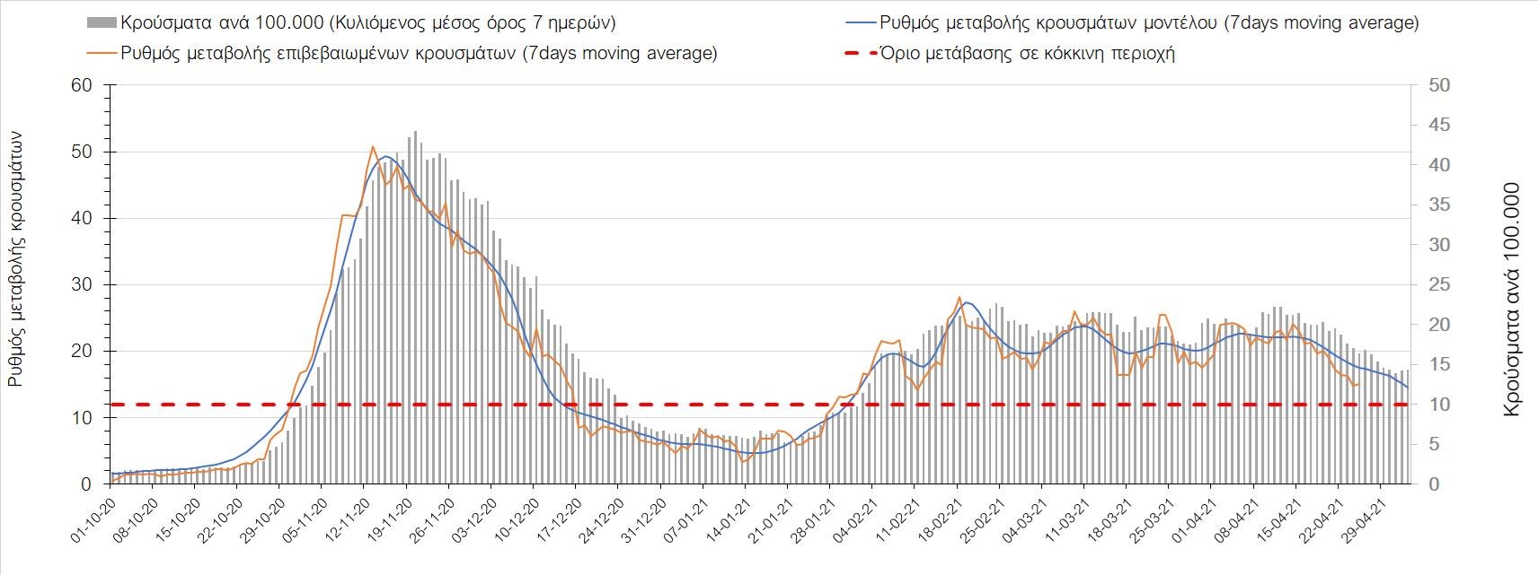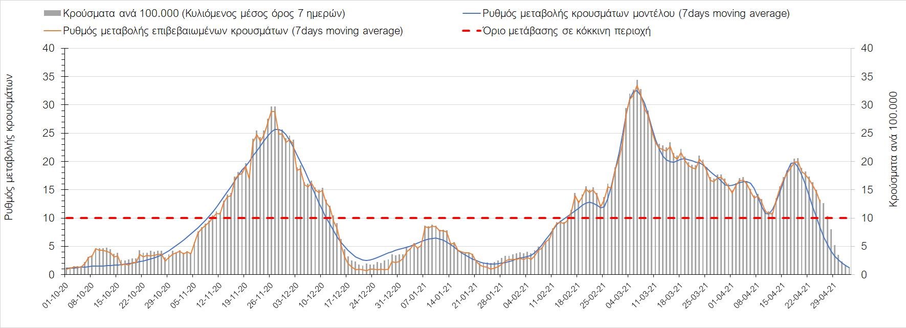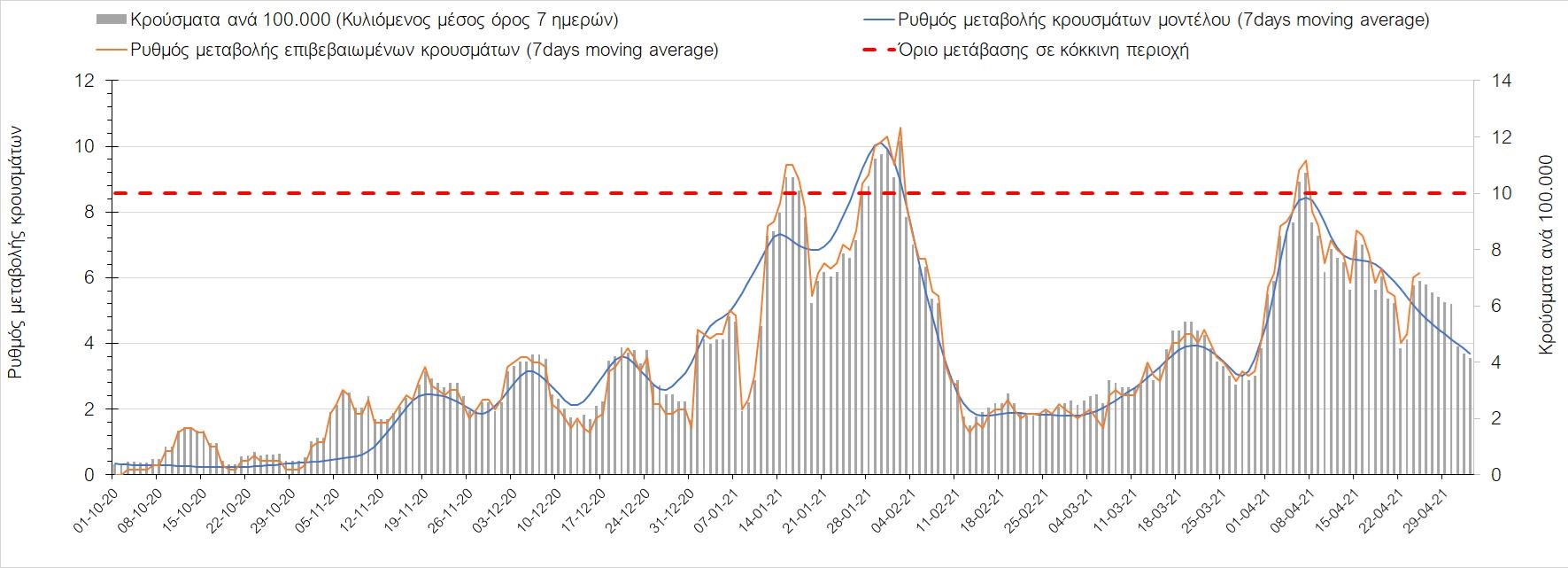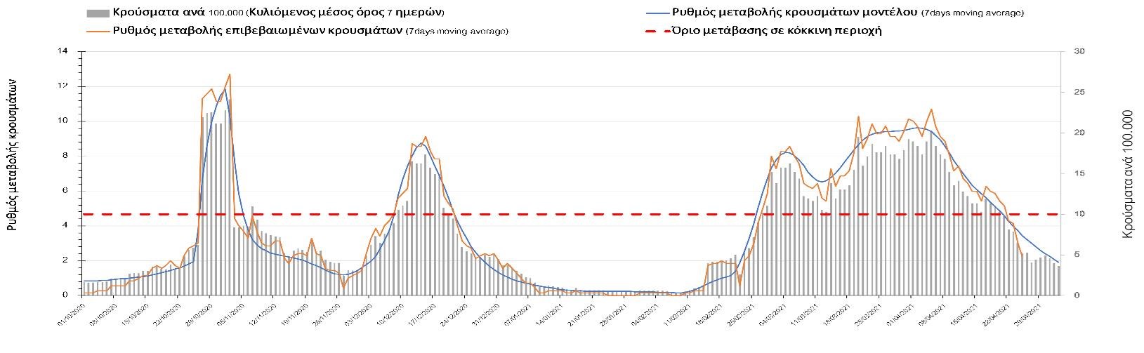 Η ήπια αναχαίτιση του 3ου κύματος που παρατηρείται, οφείλεται σε ένα συνδυασμό παραμέτρων, οι οποίες είναι η συνέχιση του lockdown, η χρήση των self-test, η αύξηση του αριθμού των τεστ από τον ΕΟΔΥ, γεγονός που συντελεί στην απομάκρυνση από τις αλυσίδες μετάδοσης των ασυμπτωματικών και προσυμπτωματικών φορέων, η προοδευτική βελτίωση του καιρού και σε μικρότερο βαθμό η πρόοδος των εμβολιασμών, η σημασία των οποίων στον έλεγχο της πανδημίας θα αρχίσει να είναι πιο εμφανής από το τέλος του επόμενου μήνα. Όμως, με δεδομένο το άνοιγμα του λιανικού εμπορίου και των Λυκείων, είναι ακόμα πιο σημαντική η τήρηση των μέτρων, ενώ ύψιστης σημασίας στις επόμενες εβδομάδες θα αποδειχθεί η ορθή και μαζική εφαρμογή των self-test, με ταυτόχρονη αύξηση της ιχνηλασίας των επαφών των ανιχνευθέντων ως θετικοί και καραντίνα 14 ημερών για τους συμπολίτες μας που θα επιβεβαιωθεί ότι είναι θετικοί στην μόλυνση με SARS-CoV-2 ακόμη και αν είναι ασυμπτωματικοί. Δεδομένου ότι τελικά ο αριθμός των self-test που πραγματοποιούνται ημερησίως δεν έχει φθάσει στα επιθυμητά νούμερα στα οποία βασίζονται οι προβολές που παρουσιάζονται στην παρούσα τεχνική έκθεση μέχρι το Πάσχα, μόλις έχουμε νεώτερα για τον ακριβή αριθμό τους και τη συχνότητα εκτέλεσης αυτών, θα επαναεπικαιροποιήσουμε τις προβλέψεις μας. Αξίζει επίσης να σημειωθεί ότι στην Αθήνα τις τελευταίες ημέρες παρατηρήθηκαν συρροές, οι πιθανές επιπτώσεις των οποίων θα αποτυπωθούν στις επόμενες ημέρες. Τέλος, πολύ ισχυρές επιφυλάξεις έχουμε για το σχετικά πρόωρο άνοιγμα της εστίασης που αποφασίστηκε για τις 3 Μαΐου, καθώς και το άνοιγμα των μεγάλων εμπορικών κέντρων από τις 24 Απριλίου, και που θα μπορούσαν να επιβραδύνουν την πτωτική πορεία της διασποράς του SARS-CoV-2 προς το τέλος του Μαΐου. Το πρόωρο άνοιγμα της εστίασης θα συντελέσει σε αύξηση των επαφών (και άρα της μεταδοτικότητας), και όχι σε αποσυμπίεση των εικόνων συνωστισμού που παρατηρούμε τις τελευταίες ημέρες κυρίως σε περιοχές της Αθήνας, δεδομένου ότι η εστίαση θα δώσει την ευκαιρία αύξησης των επαφών σε ηλικιακές ομάδες που τώρα βρίσκονται εκτός των ηλικιών που συγχρωτίζονται. Καθοριστικότατη για την αποφυγή της αναστροφής της καλής πορείας παρά τα προαναφερθέντα ανοίγματα είναι η εντατικοποίηση των self-test, και η αύξηση του ρυθμού εμβολιασμού, η σημαντικότητα και η αποτελεσματικότητα των οποίων έχει ήδη φανεί τις τελευταίες 2 εβδομάδες. Εάν αυτά πραγματοποιηθούν στο βαθμό και με τον τρόπο που προβλέπεται, η συνολική πορεία αποκλιμάκωσης της πανδημίας θα συνεχιστεί με μικρές διακυμάνσεις.