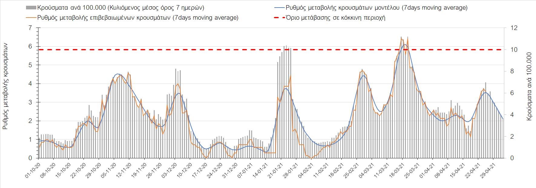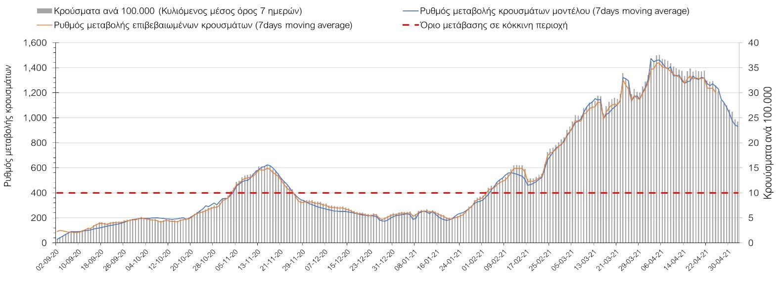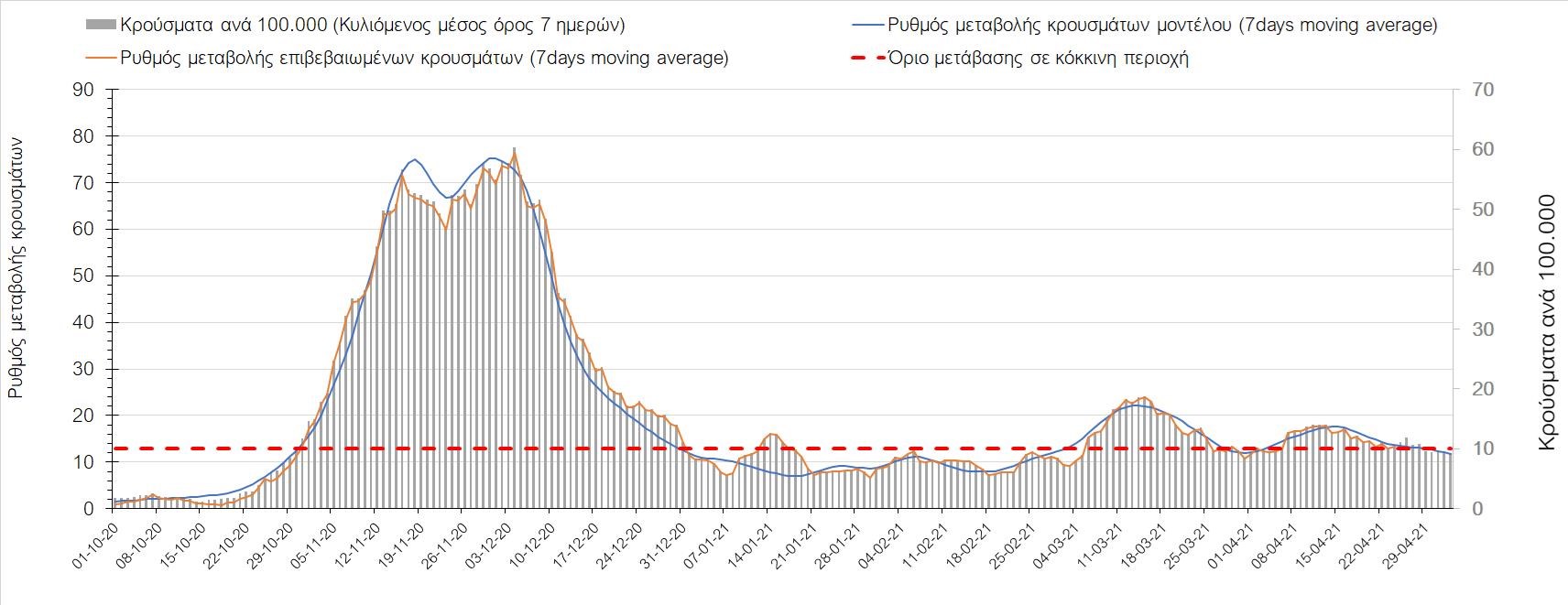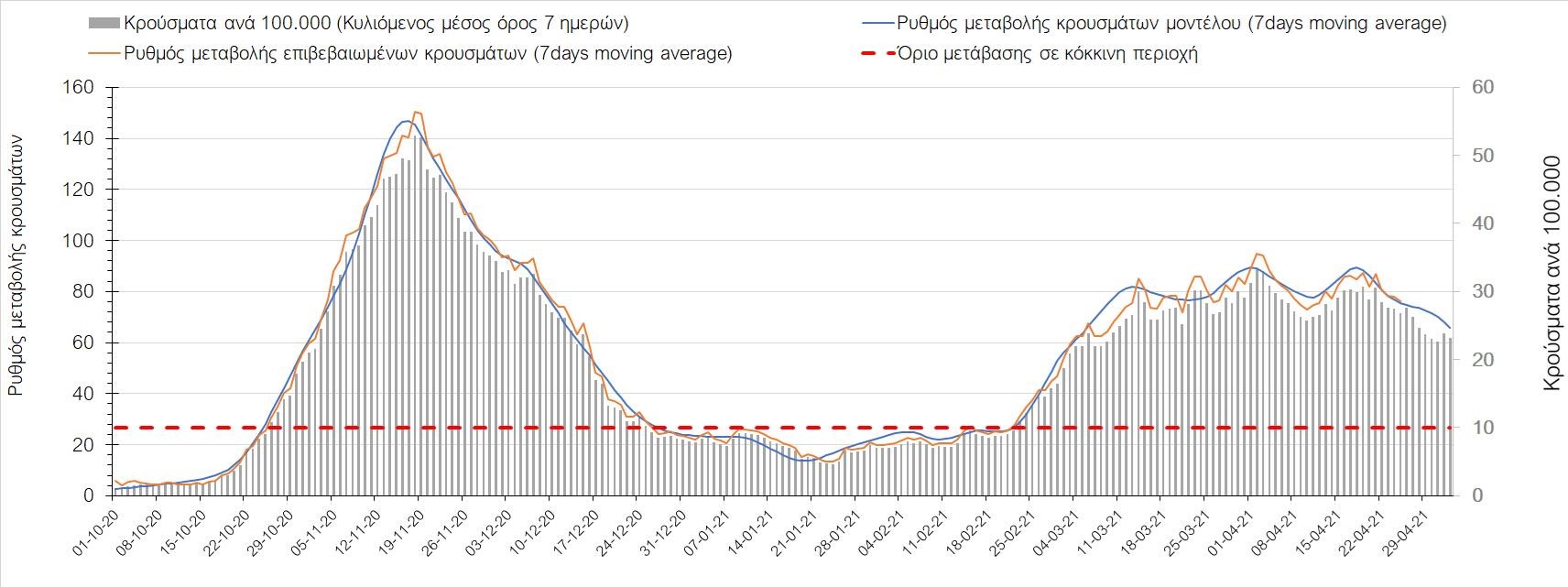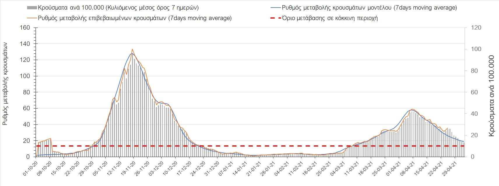 Η ήπια αναχαίτιση του 3ου κύματος που παρατηρείται, οφείλεται σε ένα συνδυασμό παραμέτρων, οι οποίες είναι η συνέχιση του lockdown, η χρήση των self-test, η αύξηση του αριθμού των τεστ από τον ΕΟΔΥ, γεγονός που συντελεί στην απομάκρυνση από τις αλυσίδες μετάδοσης των ασυμπτωματικών και προσυμπτωματικών φορέων, η προοδευτική βελτίωση του καιρού και σε μικρότερο βαθμό η πρόοδος των εμβολιασμών, η σημασία των οποίων στον έλεγχο της πανδημίας θα αρχίσει να είναι πιο εμφανής από το τέλος του επόμενου μήνα. Όμως, με δεδομένο το άνοιγμα του λιανικού εμπορίου και των Λυκείων, είναι ακόμα πιο σημαντική η τήρηση των μέτρων, ενώ ύψιστης σημασίας στις επόμενες εβδομάδες θα αποδειχθεί η ορθή και μαζική εφαρμογή των self-test, με ταυτόχρονη αύξηση της ιχνηλασίας των επαφών των ανιχνευθέντων ως θετικοί και καραντίνα 14 ημερών για τους συμπολίτες μας που θα επιβεβαιωθεί ότι είναι θετικοί στην μόλυνση με SARS-CoV-2 ακόμη και αν είναι ασυμπτωματικοί. Δεδομένου ότι τελικά ο αριθμός των self-test που πραγματοποιούνται ημερησίως δεν έχει φθάσει στα επιθυμητά νούμερα στα οποία βασίζονται οι προβολές που παρουσιάζονται στην παρούσα τεχνική έκθεση μέχρι το Πάσχα, μόλις έχουμε νεώτερα για τον ακριβή αριθμό τους και τη συχνότητα εκτέλεσης αυτών, θα επαναεπικαιροποιήσουμε τις προβλέψεις μας. Αξίζει επίσης να σημειωθεί ότι στην Αθήνα τις τελευταίες ημέρες παρατηρήθηκαν συρροές, οι πιθανές επιπτώσεις των οποίων θα αποτυπωθούν στις επόμενες ημέρες. Τέλος, πολύ ισχυρές επιφυλάξεις έχουμε για το σχετικά πρόωρο άνοιγμα της εστίασης που αποφασίστηκε για τις 3 Μαΐου, καθώς και το άνοιγμα των μεγάλων εμπορικών κέντρων από τις 24 Απριλίου, και που θα μπορούσαν να επιβραδύνουν την πτωτική πορεία της διασποράς του SARS-CoV-2 προς το τέλος του Μαΐου. Το πρόωρο άνοιγμα της εστίασης θα συντελέσει σε αύξηση των επαφών (και άρα της μεταδοτικότητας), και όχι σε αποσυμπίεση των εικόνων συνωστισμού που παρατηρούμε τις τελευταίες ημέρες κυρίως σε περιοχές της Αθήνας, δεδομένου ότι η εστίαση θα δώσει την ευκαιρία αύξησης των επαφών σε ηλικιακές ομάδες που τώρα βρίσκονται εκτός των ηλικιών που συγχρωτίζονται. Καθοριστικότατη για την αποφυγή της αναστροφής της καλής πορείας παρά τα προαναφερθέντα ανοίγματα είναι η εντατικοποίηση των self-test, και η αύξηση του ρυθμού εμβολιασμού, η σημαντικότητα και η αποτελεσματικότητα των οποίων έχει ήδη φανεί τις τελευταίες 2 εβδομάδες. Εάν αυτά πραγματοποιηθούν στο βαθμό και με τον τρόπο που προβλέπεται, η συνολική πορεία αποκλιμάκωσης της πανδημίας θα συνεχιστεί με μικρές διακυμάνσεις.