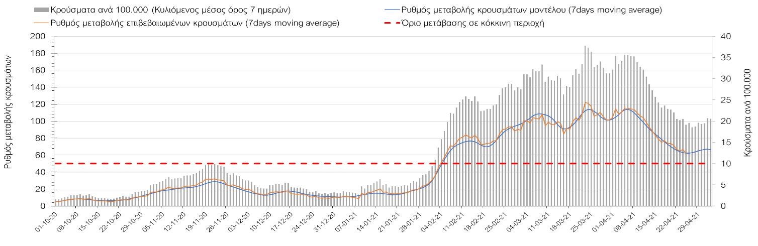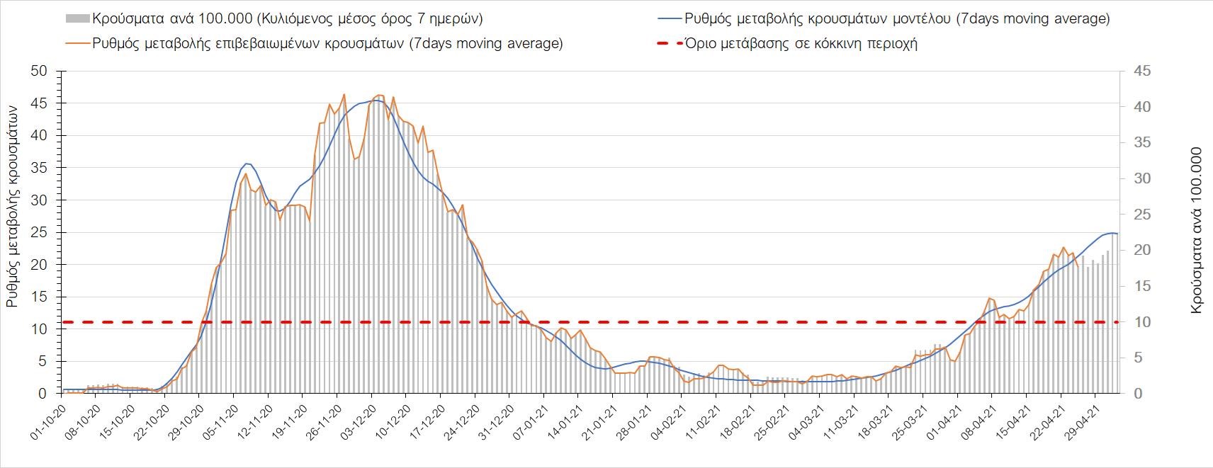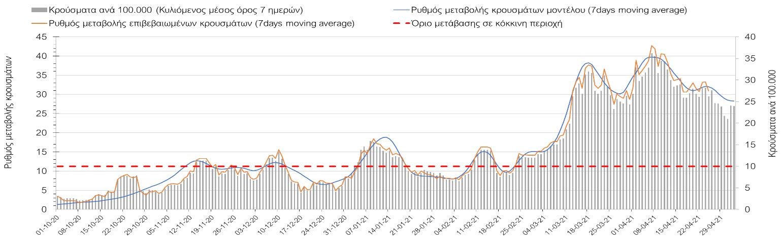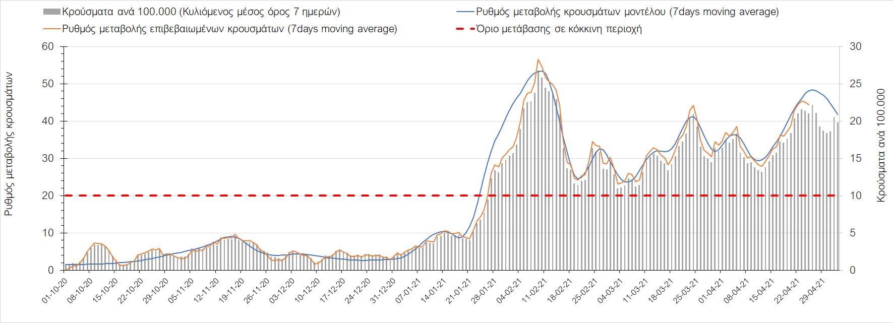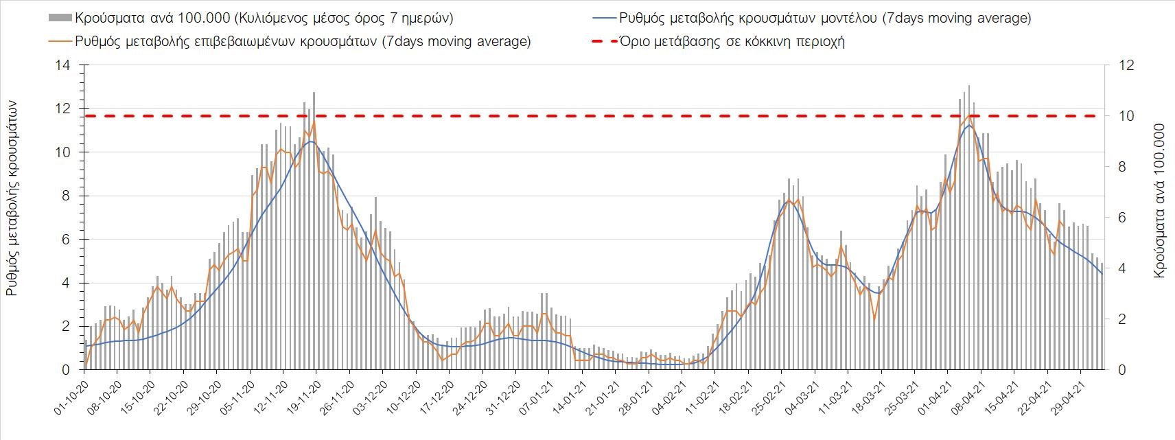 Η ήπια αναχαίτιση του 3ου κύματος που παρατηρείται, οφείλεται σε ένα συνδυασμό παραμέτρων, οι οποίες είναι η συνέχιση του lockdown, η χρήση των self-test, η αύξηση του αριθμού των τεστ από τον ΕΟΔΥ, γεγονός που συντελεί στην απομάκρυνση από τις αλυσίδες μετάδοσης των ασυμπτωματικών και προσυμπτωματικών φορέων, η προοδευτική βελτίωση του καιρού και σε μικρότερο βαθμό η πρόοδος των εμβολιασμών, η σημασία των οποίων στον έλεγχο της πανδημίας θα αρχίσει να είναι πιο εμφανής από το τέλος του επόμενου μήνα. Όμως, με δεδομένο το άνοιγμα του λιανικού εμπορίου και των Λυκείων, είναι ακόμα πιο σημαντική η τήρηση των μέτρων, ενώ ύψιστης σημασίας στις επόμενες εβδομάδες θα αποδειχθεί η ορθή και μαζική εφαρμογή των self-test, με ταυτόχρονη αύξηση της ιχνηλασίας των επαφών των ανιχνευθέντων ως θετικοί και καραντίνα 14 ημερών για τους συμπολίτες μας που θα επιβεβαιωθεί ότι είναι θετικοί στην μόλυνση με SARS-CoV-2 ακόμη και αν είναι ασυμπτωματικοί. Δεδομένου ότι τελικά ο αριθμός των self-test που πραγματοποιούνται ημερησίως δεν έχει φθάσει στα επιθυμητά νούμερα στα οποία βασίζονται οι προβολές που παρουσιάζονται στην παρούσα τεχνική έκθεση μέχρι το Πάσχα, μόλις έχουμε νεώτερα για τον ακριβή αριθμό τους και τη συχνότητα εκτέλεσης αυτών, θα επαναεπικαιροποιήσουμε τις προβλέψεις μας. Αξίζει επίσης να σημειωθεί ότι στην Αθήνα τις τελευταίες ημέρες παρατηρήθηκαν συρροές, οι πιθανές επιπτώσεις των οποίων θα αποτυπωθούν στις επόμενες ημέρες. Τέλος, πολύ ισχυρές επιφυλάξεις έχουμε για το σχετικά πρόωρο άνοιγμα της εστίασης που αποφασίστηκε για τις 3 Μαΐου, καθώς και το άνοιγμα των μεγάλων εμπορικών κέντρων από τις 24 Απριλίου, και που θα μπορούσαν να επιβραδύνουν την πτωτική πορεία της διασποράς του SARS-CoV-2 προς το τέλος του Μαΐου. Το πρόωρο άνοιγμα της εστίασης θα συντελέσει σε αύξηση των επαφών (και άρα της μεταδοτικότητας), και όχι σε αποσυμπίεση των εικόνων συνωστισμού που παρατηρούμε τις τελευταίες ημέρες κυρίως σε περιοχές της Αθήνας, δεδομένου ότι η εστίαση θα δώσει την ευκαιρία αύξησης των επαφών σε ηλικιακές ομάδες που τώρα βρίσκονται εκτός των ηλικιών που συγχρωτίζονται. Καθοριστικότατη για την αποφυγή της αναστροφής της καλής πορείας παρά τα προαναφερθέντα ανοίγματα είναι η εντατικοποίηση των self-test, και η αύξηση του ρυθμού εμβολιασμού, η σημαντικότητα και η αποτελεσματικότητα των οποίων έχει ήδη φανεί τις τελευταίες 2 εβδομάδες. Εάν αυτά πραγματοποιηθούν στο βαθμό και με τον τρόπο που προβλέπεται, η συνολική πορεία αποκλιμάκωσης της πανδημίας θα συνεχιστεί με μικρές διακυμάνσεις.