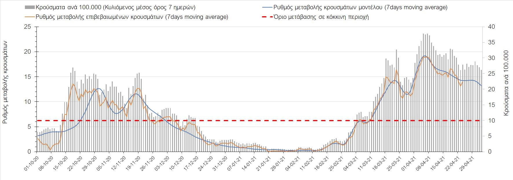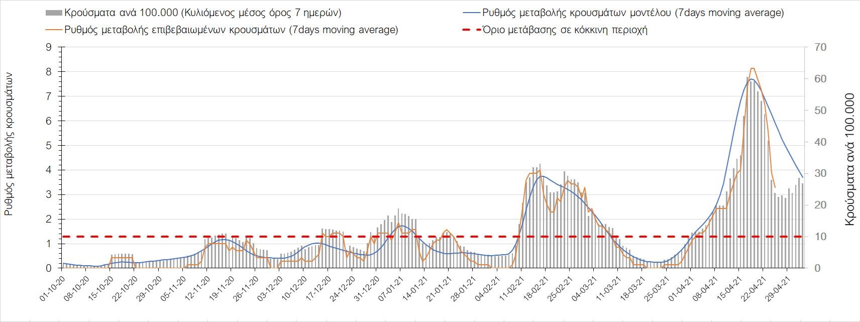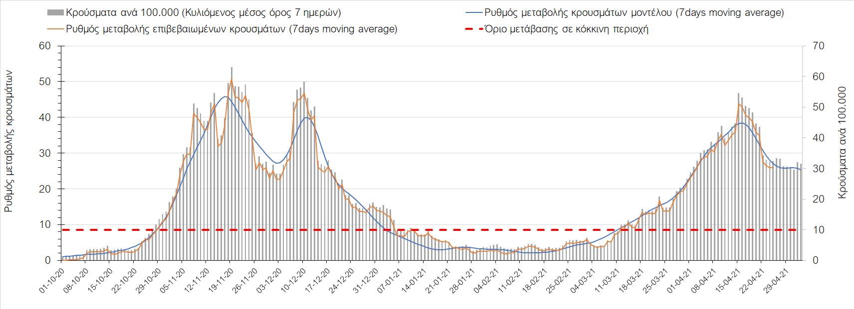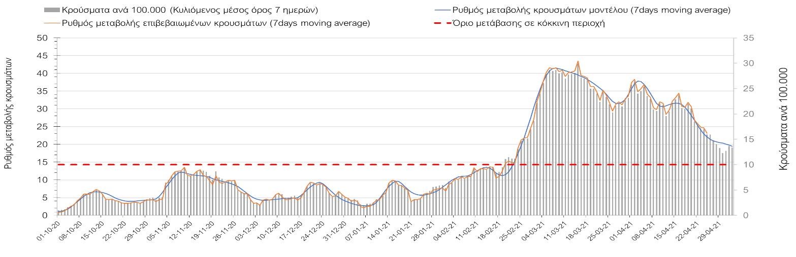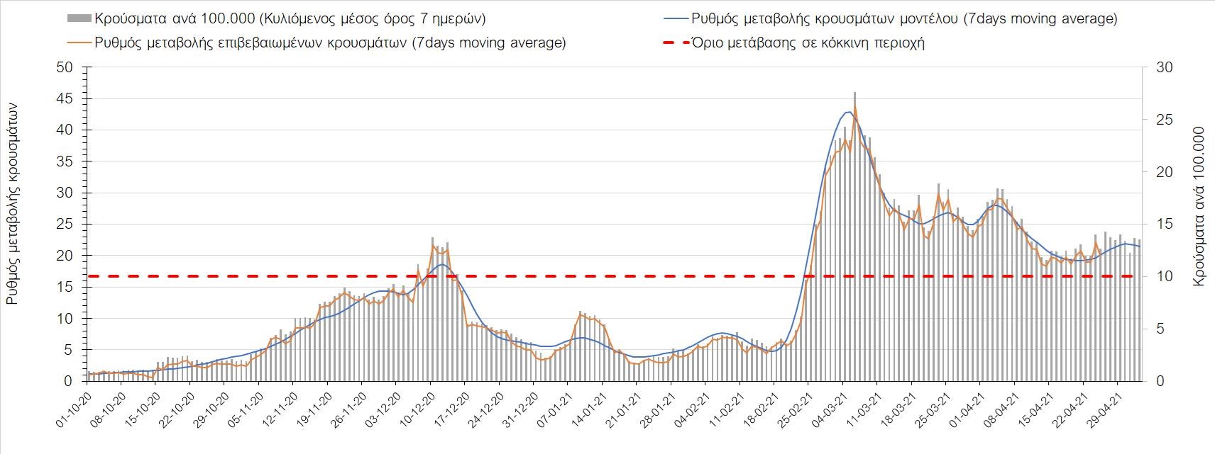 Η ήπια αναχαίτιση του 3ου κύματος που παρατηρείται, οφείλεται σε ένα συνδυασμό παραμέτρων, οι οποίες είναι η συνέχιση του lockdown, η χρήση των self-test, η αύξηση του αριθμού των τεστ από τον ΕΟΔΥ, γεγονός που συντελεί στην απομάκρυνση από τις αλυσίδες μετάδοσης των ασυμπτωματικών και προσυμπτωματικών φορέων, η προοδευτική βελτίωση του καιρού και σε μικρότερο βαθμό η πρόοδος των εμβολιασμών, η σημασία των οποίων στον έλεγχο της πανδημίας θα αρχίσει να είναι πιο εμφανής από το τέλος του επόμενου μήνα. Όμως, με δεδομένο το άνοιγμα του λιανικού εμπορίου και των Λυκείων, είναι ακόμα πιο σημαντική η τήρηση των μέτρων, ενώ ύψιστης σημασίας στις επόμενες εβδομάδες θα αποδειχθεί η ορθή και μαζική εφαρμογή των self-test, με ταυτόχρονη αύξηση της ιχνηλασίας των επαφών των ανιχνευθέντων ως θετικοί και καραντίνα 14 ημερών για τους συμπολίτες μας που θα επιβεβαιωθεί ότι είναι θετικοί στην μόλυνση με SARS-CoV-2 ακόμη και αν είναι ασυμπτωματικοί. Δεδομένου ότι τελικά ο αριθμός των self-test που πραγματοποιούνται ημερησίως δεν έχει φθάσει στα επιθυμητά νούμερα στα οποία βασίζονται οι προβολές που παρουσιάζονται στην παρούσα τεχνική έκθεση μέχρι το Πάσχα, μόλις έχουμε νεώτερα για τον ακριβή αριθμό τους και τη συχνότητα εκτέλεσης αυτών, θα επαναεπικαιροποιήσουμε τις προβλέψεις μας. Αξίζει επίσης να σημειωθεί ότι στην Αθήνα τις τελευταίες ημέρες παρατηρήθηκαν συρροές, οι πιθανές επιπτώσεις των οποίων θα αποτυπωθούν στις επόμενες ημέρες. Τέλος, πολύ ισχυρές επιφυλάξεις έχουμε για το σχετικά πρόωρο άνοιγμα της εστίασης που αποφασίστηκε για τις 3 Μαΐου, καθώς και το άνοιγμα των μεγάλων εμπορικών κέντρων από τις 24 Απριλίου, και που θα μπορούσαν να επιβραδύνουν την πτωτική πορεία της διασποράς του SARS-CoV-2 προς το τέλος του Μαΐου. Το πρόωρο άνοιγμα της εστίασης θα συντελέσει σε αύξηση των επαφών (και άρα της μεταδοτικότητας), και όχι σε αποσυμπίεση των εικόνων συνωστισμού που παρατηρούμε τις τελευταίες ημέρες κυρίως σε περιοχές της Αθήνας, δεδομένου ότι η εστίαση θα δώσει την ευκαιρία αύξησης των επαφών σε ηλικιακές ομάδες που τώρα βρίσκονται εκτός των ηλικιών που συγχρωτίζονται. Καθοριστικότατη για την αποφυγή της αναστροφής της καλής πορείας παρά τα προαναφερθέντα ανοίγματα είναι η εντατικοποίηση των self-test, και η αύξηση του ρυθμού εμβολιασμού, η σημαντικότητα και η αποτελεσματικότητα των οποίων έχει ήδη φανεί τις τελευταίες 2 εβδομάδες. Εάν αυτά πραγματοποιηθούν στο βαθμό και με τον τρόπο που προβλέπεται, η συνολική πορεία αποκλιμάκωσης της πανδημίας θα συνεχιστεί με μικρές διακυμάνσεις.