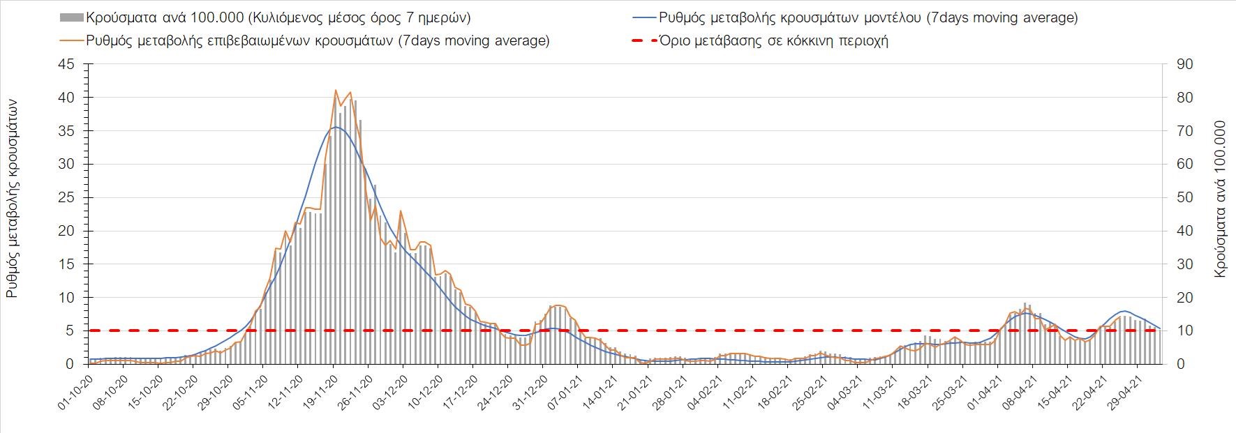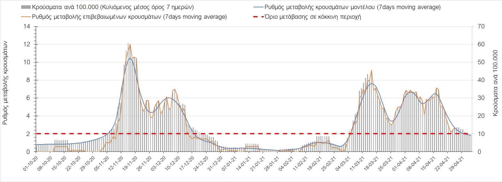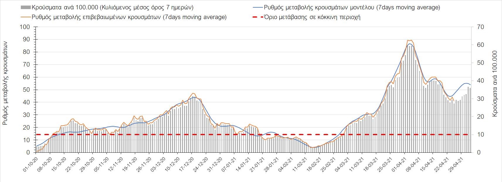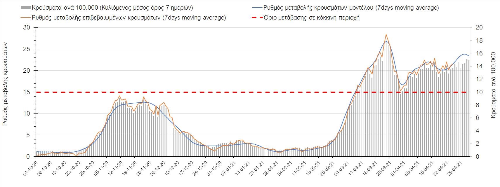 Παρά την εφαρμογή οριζόντιων μέτρων ανάσχεσης της πανδημίας που εφαρμόσθηκαν από τα τέλη Οκτωβρίου, η πορεία της τελευταίας διαφοροποιείται από περιοχή σε περιοχή. Οι παραπάνω παρατηρήσεις τείνουν στο συμπέρασμα ότι η διαχείριση του υγειονομικού κινδύνου θα πρέπει να συνεχίσει να εξετάζεται σε τοπικό επίπεδο. Πλέον προβληματίζουν πέρα από την Αττική και τη Θεσσαλονίκη, η Αχαΐα, η Αρκαδία, η Ηλεία, η Αργολίδα, η Κορινθία, η Εύβοια, η Βοιωτία, η Λάρισα, η Μαγνησία, τα Ιωάννινα, η Κοζάνη, η Χαλκιδική, η Καστοριά, η Καβάλα, η Πέλλα, οι Σέρρες και η Πέλλα, η Ξάνθη, η Θάσος, το Ηράκλειο, τα Χανιά, και το Ρέθυμνο. Ανάγκη αυξημένης επιτήρησης έχουν η Φθιώτιδα, η Ευρυτανία, η Καρδίτσα, τα Τρίκαλα, η Πιερία, η Δράμα, η Φλώρινα, το Κιλκίς, τα Γρεβενά, η Ημαθία, η Ροδόπη, ο Έβρος και το Λασίθι, που έχουν διακυμάνσεις κοντά στο όριο της κόκκινης περιοχής.