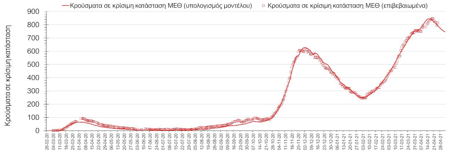 Όσον αφορά στους ασθενείς σε κρίσιμη κατάσταση (διασωληνωμένοι σε ΜΕΘ), ο αριθμός τους αυξήθηκε σε σχέση με το Σάββατο (816 από 797), και διαφαίνεται να έχει ξεκινήσει η αποκλιμάκωση με βάση την επικαιροποιημένη πρόβλεψη (αυτό βέβαια με την παραδοχή ότι θα συνεχίσουν να τηρούνται τα ισχύοντα μέτρα, συμπεριλαμβανομένων των προβλεπόμενων self-test και ανοίγματα δραστηριοτήτων υψηλού συγχρωτισμού, όπως τα mall και η εστίαση θα γίνουν με την κατάλληλη προετοιμασία). Αξίζει να σημειωθεί ότι ο αριθμός των ασθενών σε κρίσιμη κατάσταση όπως και των θανάτων είναι αναλογικά χαμηλότερος σε σχέση με τα αντίστοιχα μεγέθη στο δεύτερο κύμα, τόσο λόγω των εμβολιασμών ευπαθών ομάδων, όσο και του υψηλότερου αριθμού τεστ ανίχνευσης, που συντελεί στον εντοπισμό περισσότερων ασυμπτωματικών ή ήπια συμπτωματικών κρουσμάτων.