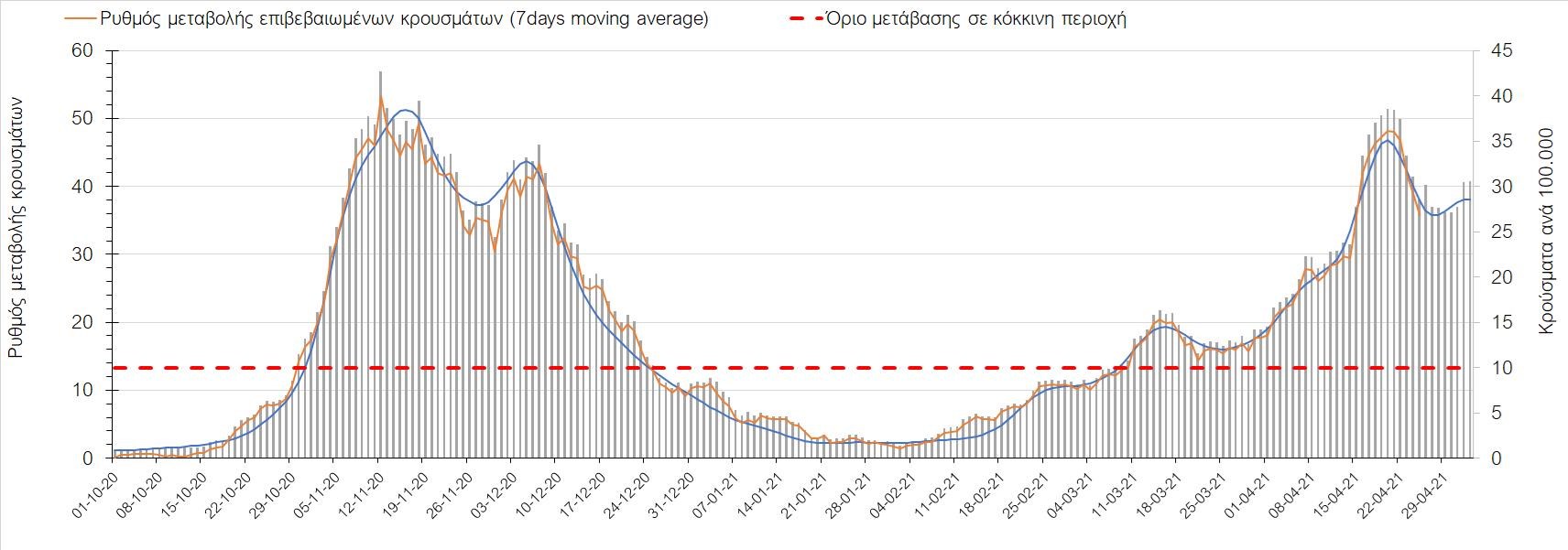 Σχήμα 4. Πορεία του ημερησίου αριθμού των κρουσμάτων (κυλιόμενος μέσος όρος 7 ημερών) στην Ελληνική επικράτεια