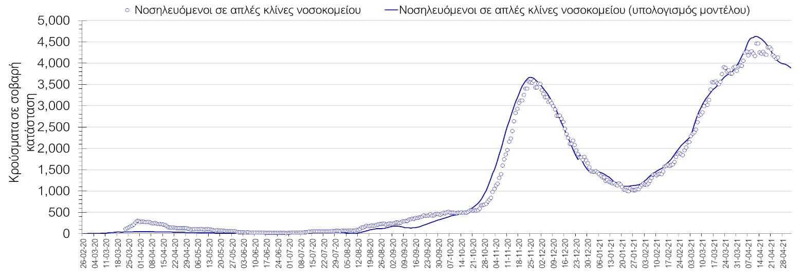 Σχήμα 2. Αριθμός κρουσμάτων σε σοβαρή κατάσταση (νοσηλευόμενοι σε απλές κλίνες) σύμφωνα με τα στοιχεία του ΕΟΔΥ και τις προβλέψεις της υπολογιστικής πλατφόρμας CORE.