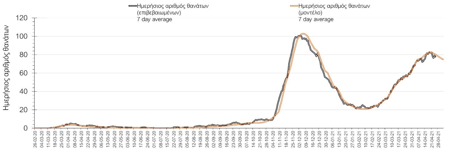 Ο αριθμός ημερήσιων θανάτων (57) είναι μειωμένος σε σχέση με το Σάββατο (86) και όπως είχαμε προβλέψει από την προηγούμενη εβδομάδα, ο κυλιόμενος εβδομαδιαίος μέσος όρος που είναι 78, αναμένεται να συνεχίσει να μειώνεται καθώς έχει ξεκινήσει η ήπια αποκλιμάκωση του αριθμού των θανάτων από Covid-19 ανά ημέρα.