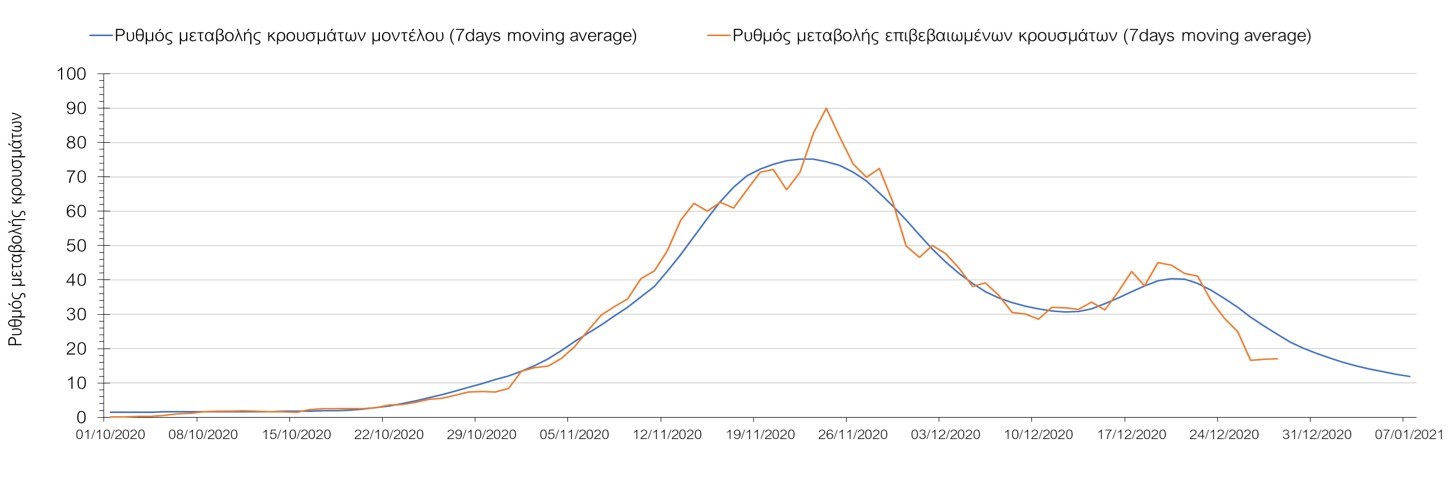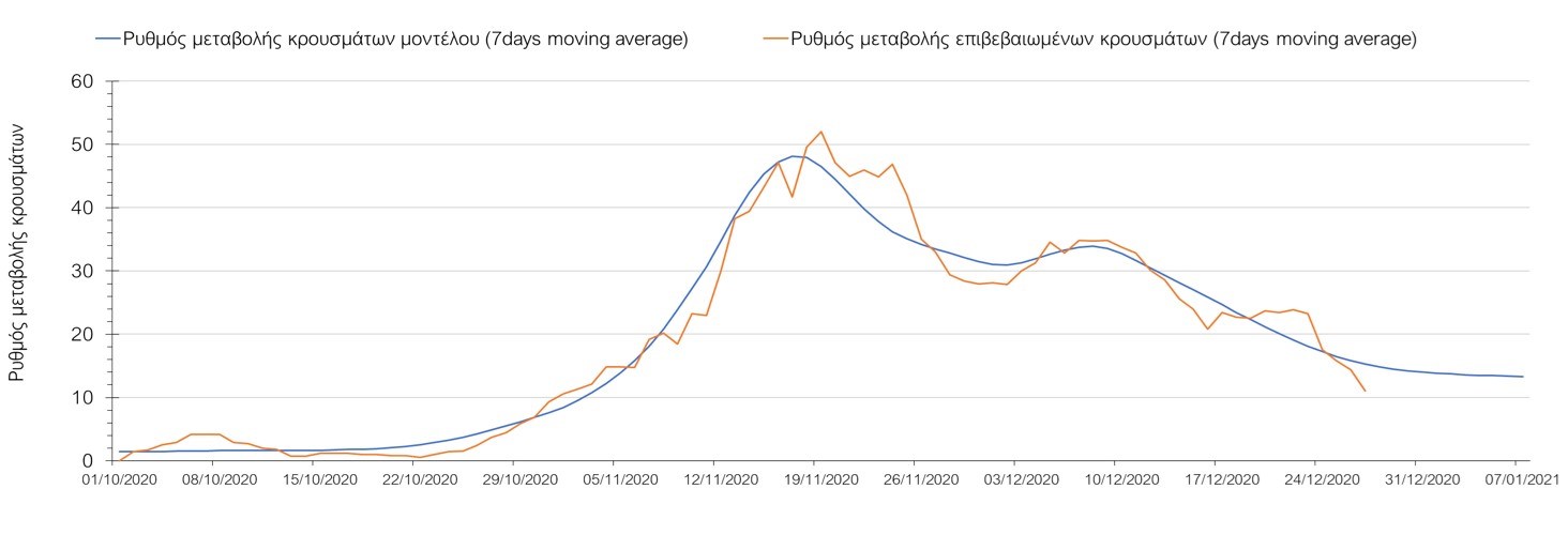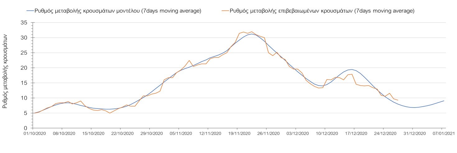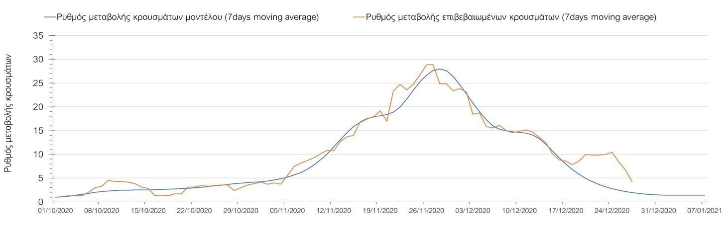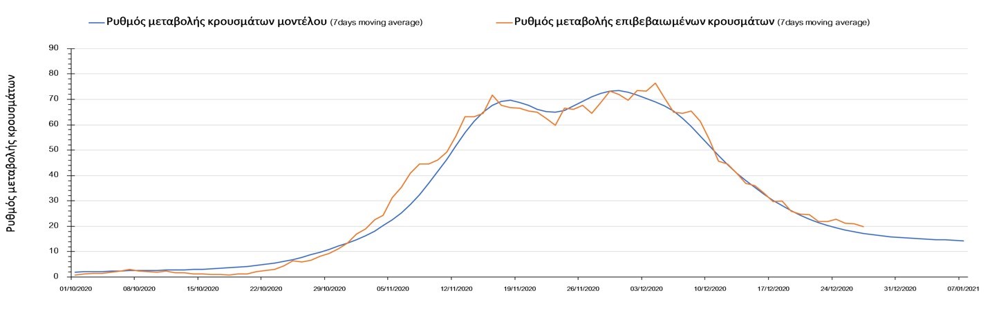 Σχήμα 33. Πορεία του ημερησίου αριθμού των κρουσμάτων (κυλιόμενος μέσος όρος 7 ημερών) στην ΘάσοΣυμπεράσματα:Η συνολική πορεία των κρουσμάτων, αλλά και η αρχή ουσιαστικής αποκλιμάκωσης που παρατηρείται τις τελευταίες ημέρες στον αριθμό των ασθενών σε κρίσιμη κατάσταση (διασωληνωμένοι σε ΜΕΘ), μετά τα αποτελέσματα της Κυριακής, συνάδει με τις προσομοιώσεις του μοντέλου CORE για τον επόμενο μήνα. Παρά την εφαρμογή οριζοντίων μέτρων ανάσχεσης της πανδημίας, η πορεία της τελευταίας διαφοροποιείται από περιοχή σε περιοχή. Οι παραπάνω παρατηρήσεις τείνουν στο συμπέρασμα ότι η διαχείριση του υγειονομικού κινδύνου θα πρέπει να εξεταστεί σε τοπικό επίπεδο από τη στιγμή που συνολικά στη χώρα φαίνεται να έχουμε ξεπεράσει την κορύφωση του συγκεκριμένου επιδημικού κύματος του Νοεμβρίου. Παρόλα αυτά, συνιστάται προσοχή για τις επόμενες ημέρες, λόγω του πιθανού συνωστισμού που θα προκύψει στις οικογενειακές συγκεντρώσεις και στην αυξημένη κίνηση σε δημόσιους χώρους λόγω των αργιών. Από την άλλη, οι επιπλέον ημέρες αργίας και η αποφυγή καθημερινών δραστηριοτήτων και επαφών ίσως λειτουργήσουν αντισταθμιστικά.
