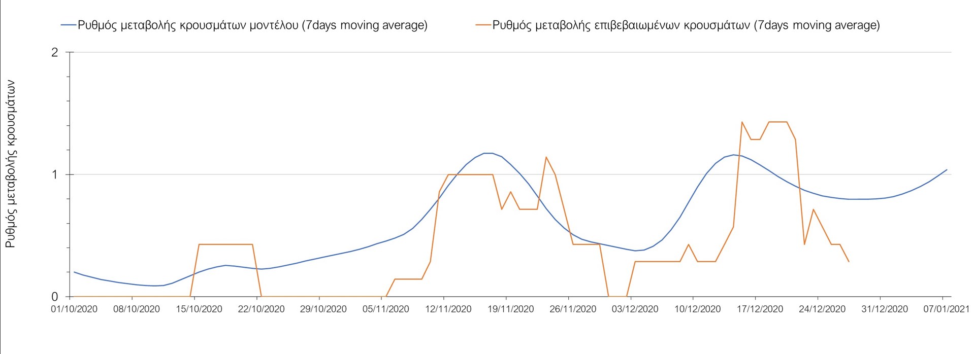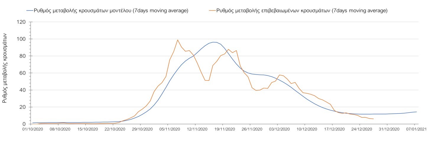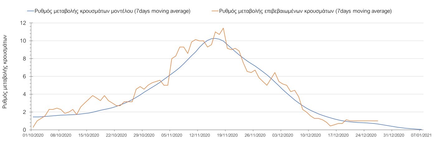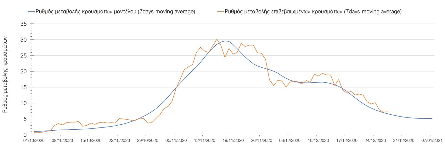 Σχήμα 33. Πορεία του ημερησίου αριθμού των κρουσμάτων (κυλιόμενος μέσος όρος 7 ημερών) στην ΘάσοΣυμπεράσματα:Η συνολική πορεία των κρουσμάτων, αλλά και η αρχή ουσιαστικής αποκλιμάκωσης που παρατηρείται τις τελευταίες ημέρες στον αριθμό των ασθενών σε κρίσιμη κατάσταση (διασωληνωμένοι σε ΜΕΘ), μετά τα αποτελέσματα της Κυριακής, συνάδει με τις προσομοιώσεις του μοντέλου CORE για τον επόμενο μήνα. Παρά την εφαρμογή οριζοντίων μέτρων ανάσχεσης της πανδημίας, η πορεία της τελευταίας διαφοροποιείται από περιοχή σε περιοχή. Οι παραπάνω παρατηρήσεις τείνουν στο συμπέρασμα ότι η διαχείριση του υγειονομικού κινδύνου θα πρέπει να εξεταστεί σε τοπικό επίπεδο από τη στιγμή που συνολικά στη χώρα φαίνεται να έχουμε ξεπεράσει την κορύφωση του συγκεκριμένου επιδημικού κύματος του Νοεμβρίου. Παρόλα αυτά, συνιστάται προσοχή για τις επόμενες ημέρες, λόγω του πιθανού συνωστισμού που θα προκύψει στις οικογενειακές συγκεντρώσεις και στην αυξημένη κίνηση σε δημόσιους χώρους λόγω των αργιών. Από την άλλη, οι επιπλέον ημέρες αργίας και η αποφυγή καθημερινών δραστηριοτήτων και επαφών ίσως λειτουργήσουν αντισταθμιστικά.