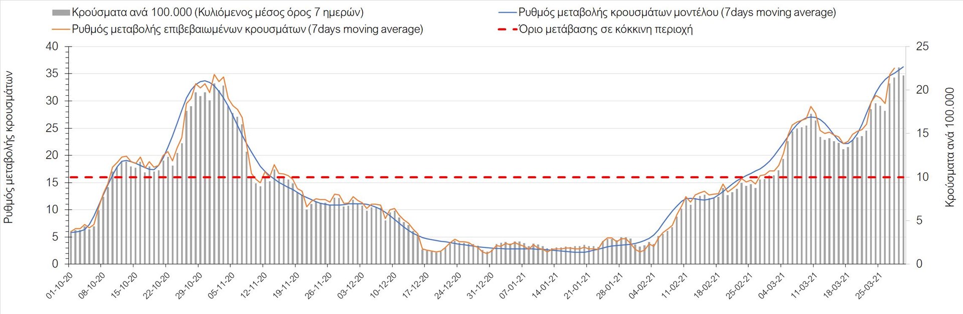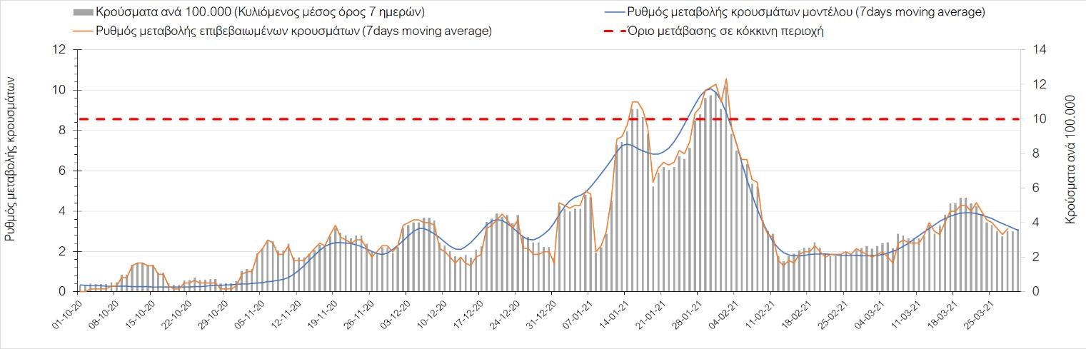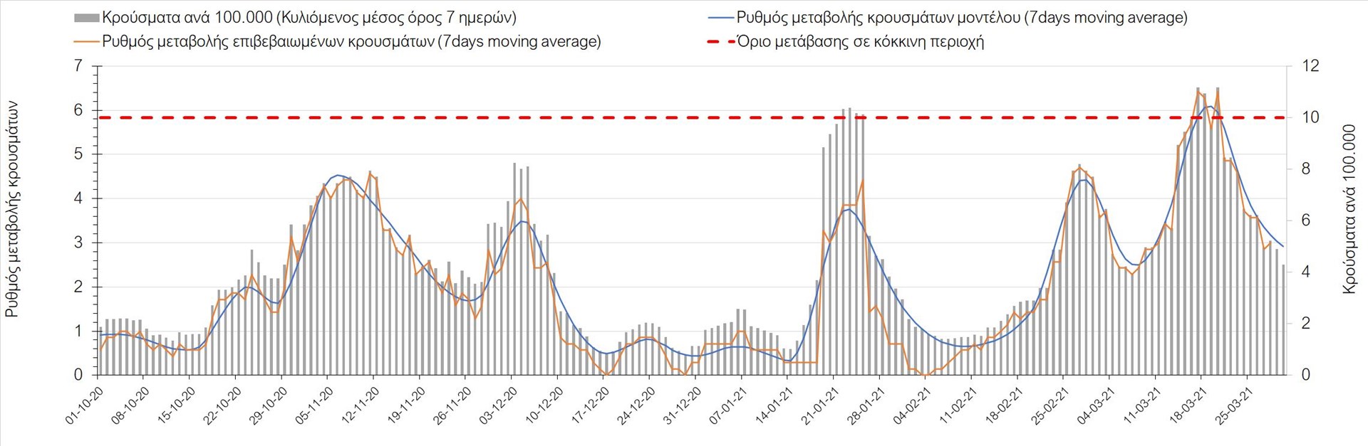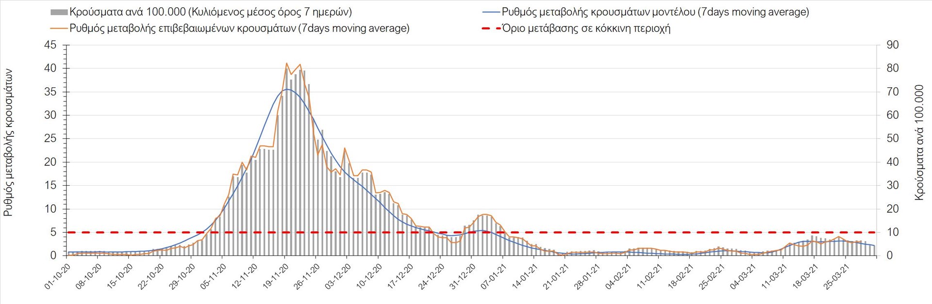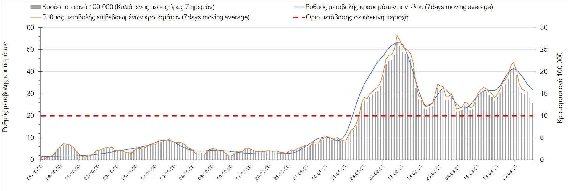 Η πορεία της μέσης εβδομαδιαίας τιμής των κρουσμάτων, καθώς και του κυλιόμενου μέσου όρου 7 ημερών του αριθμού των κρουσμάτων ανά 100.000 πληθυσμού, όπως έχουν καταγραφεί από τον ΕΟΔΥ και η αναμενόμενη πορεία τους όπως προδιαγράφεται από την υπολογιστική πλατφόρμα CORE για την Ελληνική επικράτεια μέχρι το τέλος του Μαρτίου, αποτυπώνονται στο Σχήμα 3. Αναμένεται μια αρχική σταθεροποίηση σε υψηλό αριθμό κορυσμάτων μέχρι το τέλος του μήνα και έπειτα μια μικρή αύξηση με κορύφωση στις 8 Απριλίου. Μετά από αυτήν την ημερομηνία και ανάλογα με τα μέτρα που θα έχουμε εφαρμόσει θα μπορούμε να δούμε σταδιακή αποκλιμάκωση της πανδημίας πανελλαδικά.Όπως φαίνεται από το διάγραμμα, από τις 8 Ιανουαρίου έχουμε μια αύξηση κρουσμάτων μέχρι τις 11 Ιανουαρίου η οποία οφείλεται στη μείωση της περιστολής που σημειώθηκε στις γιορτές. Από τις 11 μέχρι τις 18 Ιανουαρίου προβλεπόταν μια μείωση κρουσμάτων λόγω της εφαρμογής του lockdown και η οποία όντως παρατηρήθηκε. Εντούτοις, όπως είχαμε προβλέψει, από τις 23 Ιανουαρίου και έπειτα διαφαίνεται αύξηση στον κυλιόμενο μέσο όρο των κρουσμάτων, η οποία έγινε ιδιαίτερα έντονη μετά τις 17/2, η οποία και συνεχίζεται μέχρι τώρα. Λόγω της ισχυρής παρουσία των μεταλλαγμένων στελεχών, πιστεύουμε ότι για να επιτευχθεί κάμψη της επιδημικής καμπύλης, θα πρέπει να γίνει αυστηρή εφαρμογή των μέτρων, έτσι ώστε σε συνδυασμό με την επικρατούσα μετεωρολογία να επέλθει επιβράδυνση της ανόδου ή και σταθεροποίηση των κρουσμάτων προς το τέλος του μήνα. Πάντως για να μπορέσουμε να προχωρήσουμε σε σταδιακή άρση των περιοριστικών μέτρων για οικονομικές, εκπαιδευτικές και πολιτιστικές/αθλητικές δραστηριότητες, θα πρέπει να δημιουργήσουμε την κατάλληλη υποδομή ώστε να μπορέσουμε να αναχαιτίσουμε την υπερμετάδοση των μεταλλαγμένων στελεχών εκεί όπου συμβαίνει κατά το μάλλον, δηλαδή στους τόπους εργασίας και τα μέσα μαζικής μεταφοράς. Στα συμπεράσματα προτείνονται σχετικές λύσεις.