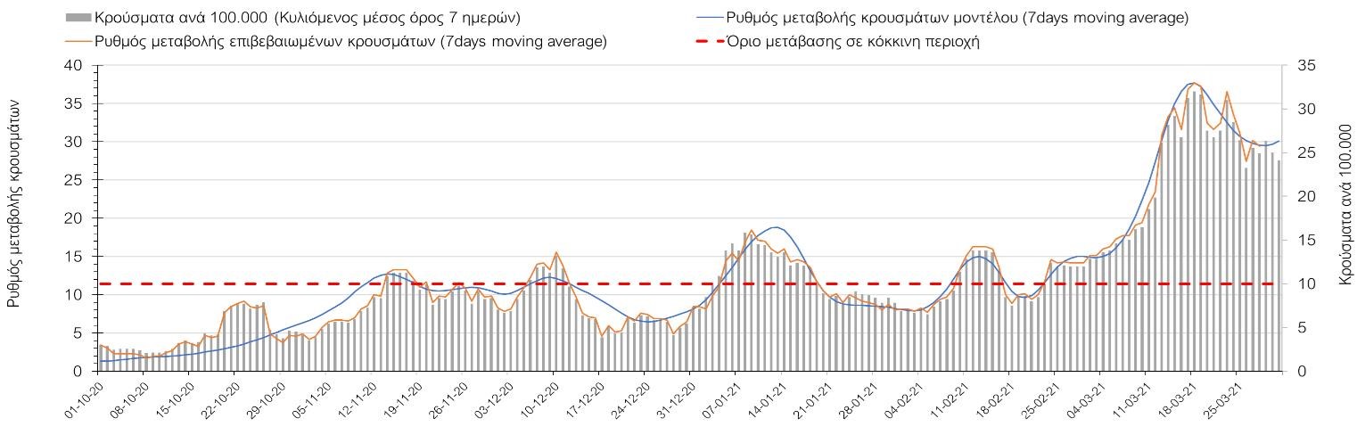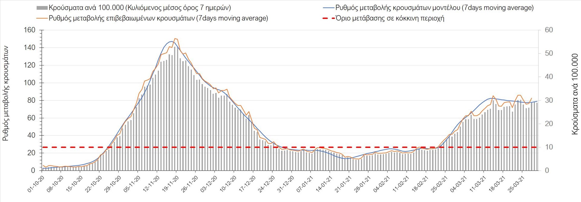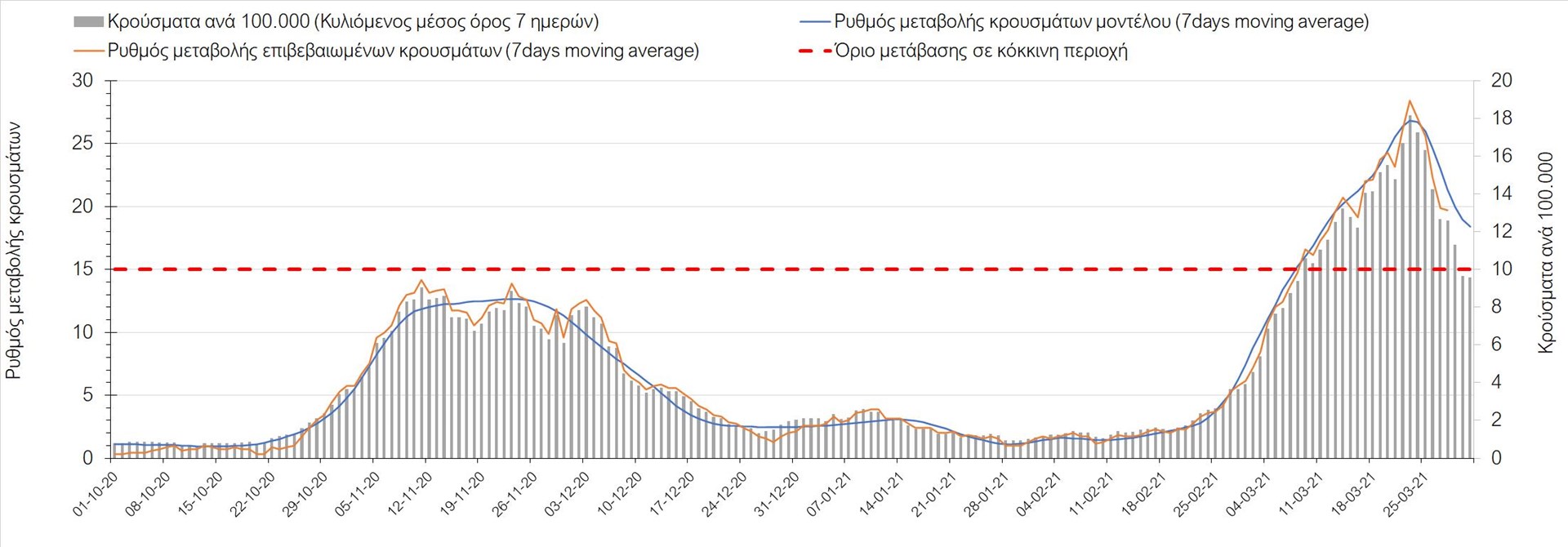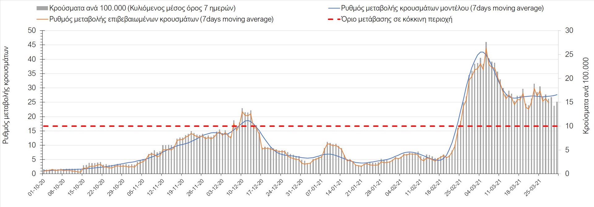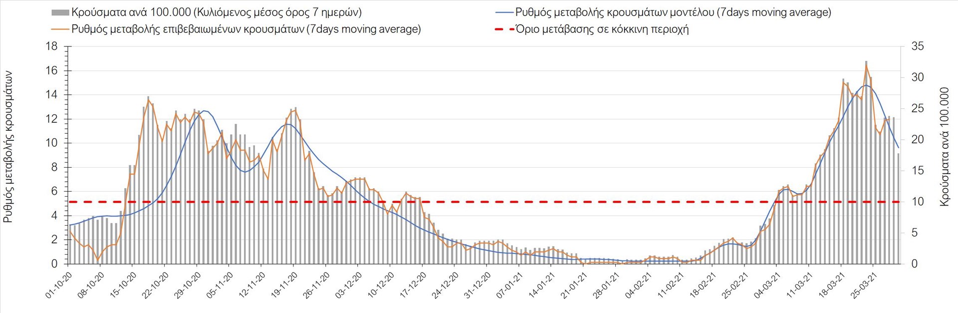 Η πορεία της μέσης εβδομαδιαίας τιμής των κρουσμάτων, καθώς και του κυλιόμενου μέσου όρου 7 ημερών του αριθμού των κρουσμάτων ανά 100.000 πληθυσμού, όπως έχουν καταγραφεί από τον ΕΟΔΥ και η αναμενόμενη πορεία τους όπως προδιαγράφεται από την υπολογιστική πλατφόρμα CORE για την Ελληνική επικράτεια μέχρι το τέλος του Μαρτίου, αποτυπώνονται στο Σχήμα 3. Αναμένεται μια αρχική σταθεροποίηση σε υψηλό αριθμό κορυσμάτων μέχρι το τέλος του μήνα και έπειτα μια μικρή αύξηση με κορύφωση στις 8 Απριλίου. Μετά από αυτήν την ημερομηνία και ανάλογα με τα μέτρα που θα έχουμε εφαρμόσει θα μπορούμε να δούμε σταδιακή αποκλιμάκωση της πανδημίας πανελλαδικά.Όπως φαίνεται από το διάγραμμα, από τις 8 Ιανουαρίου έχουμε μια αύξηση κρουσμάτων μέχρι τις 11 Ιανουαρίου η οποία οφείλεται στη μείωση της περιστολής που σημειώθηκε στις γιορτές. Από τις 11 μέχρι τις 18 Ιανουαρίου προβλεπόταν μια μείωση κρουσμάτων λόγω της εφαρμογής του lockdown και η οποία όντως παρατηρήθηκε. Εντούτοις, όπως είχαμε προβλέψει, από τις 23 Ιανουαρίου και έπειτα διαφαίνεται αύξηση στον κυλιόμενο μέσο όρο των κρουσμάτων, η οποία έγινε ιδιαίτερα έντονη μετά τις 17/2, η οποία και συνεχίζεται μέχρι τώρα. Λόγω της ισχυρής παρουσία των μεταλλαγμένων στελεχών, πιστεύουμε ότι για να επιτευχθεί κάμψη της επιδημικής καμπύλης, θα πρέπει να γίνει αυστηρή εφαρμογή των μέτρων, έτσι ώστε σε συνδυασμό με την επικρατούσα μετεωρολογία να επέλθει επιβράδυνση της ανόδου ή και σταθεροποίηση των κρουσμάτων προς το τέλος του μήνα. Πάντως για να μπορέσουμε να προχωρήσουμε σε σταδιακή άρση των περιοριστικών μέτρων για οικονομικές, εκπαιδευτικές και πολιτιστικές/αθλητικές δραστηριότητες, θα πρέπει να δημιουργήσουμε την κατάλληλη υποδομή ώστε να μπορέσουμε να αναχαιτίσουμε την υπερμετάδοση των μεταλλαγμένων στελεχών εκεί όπου συμβαίνει κατά το μάλλον, δηλαδή στους τόπους εργασίας και τα μέσα μαζικής μεταφοράς. Στα συμπεράσματα προτείνονται σχετικές λύσεις.