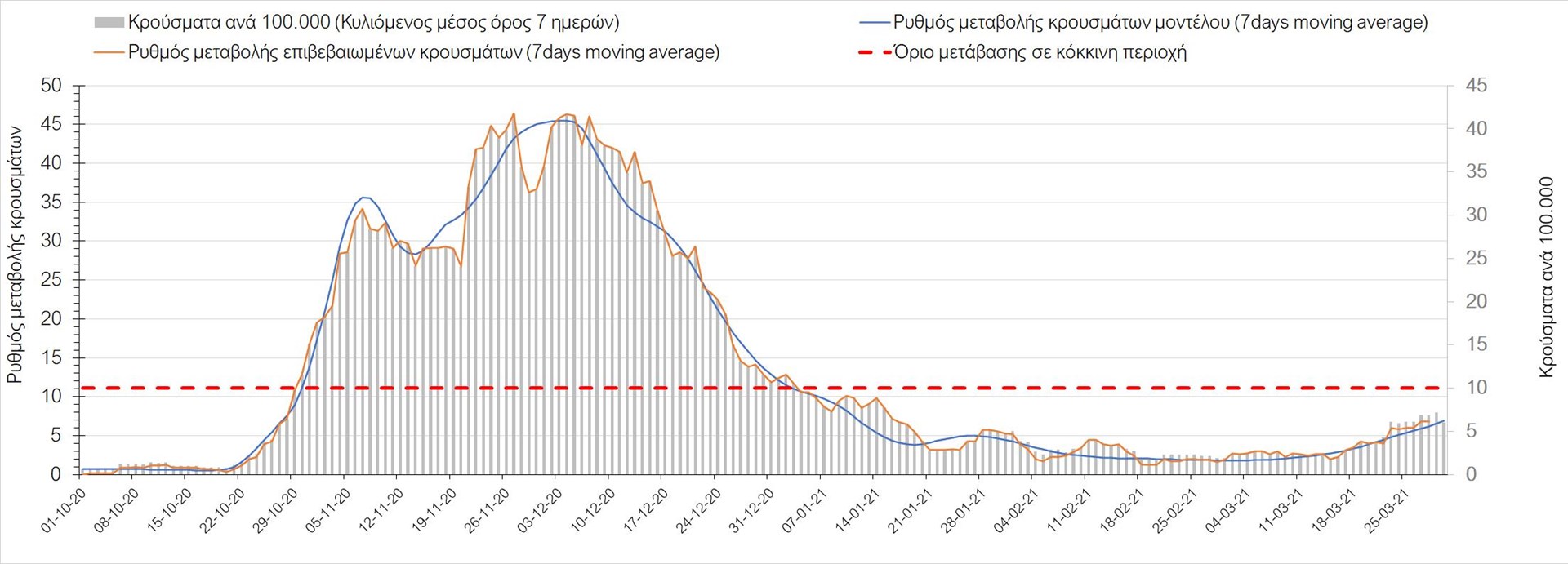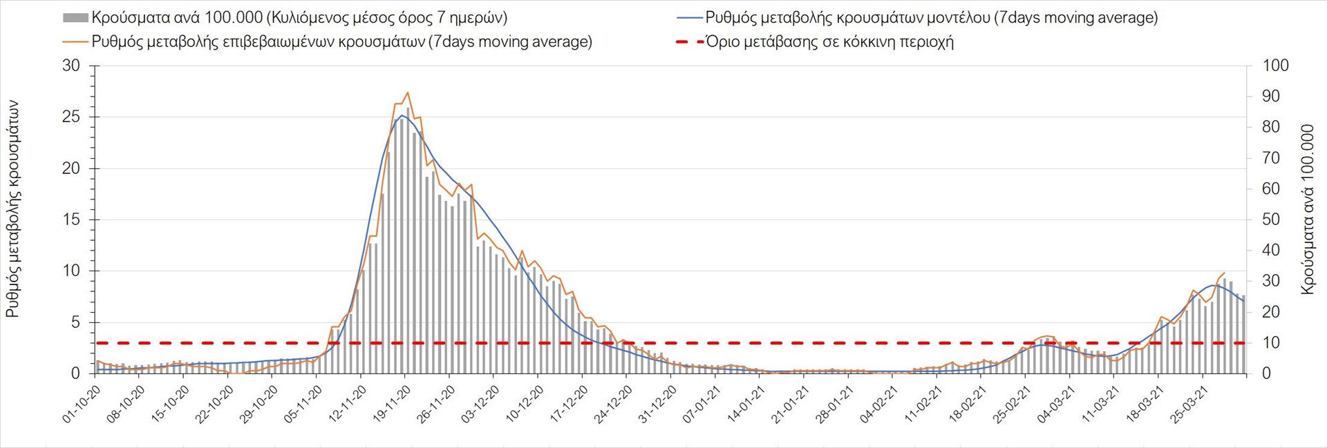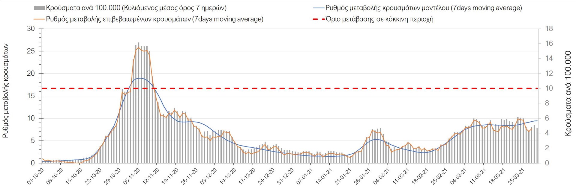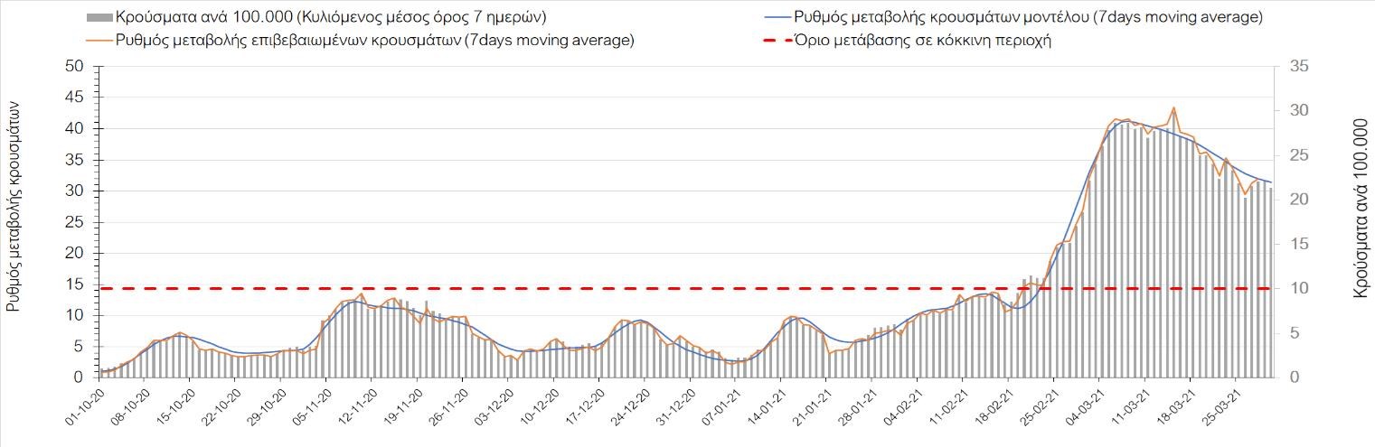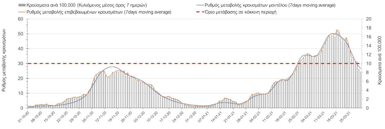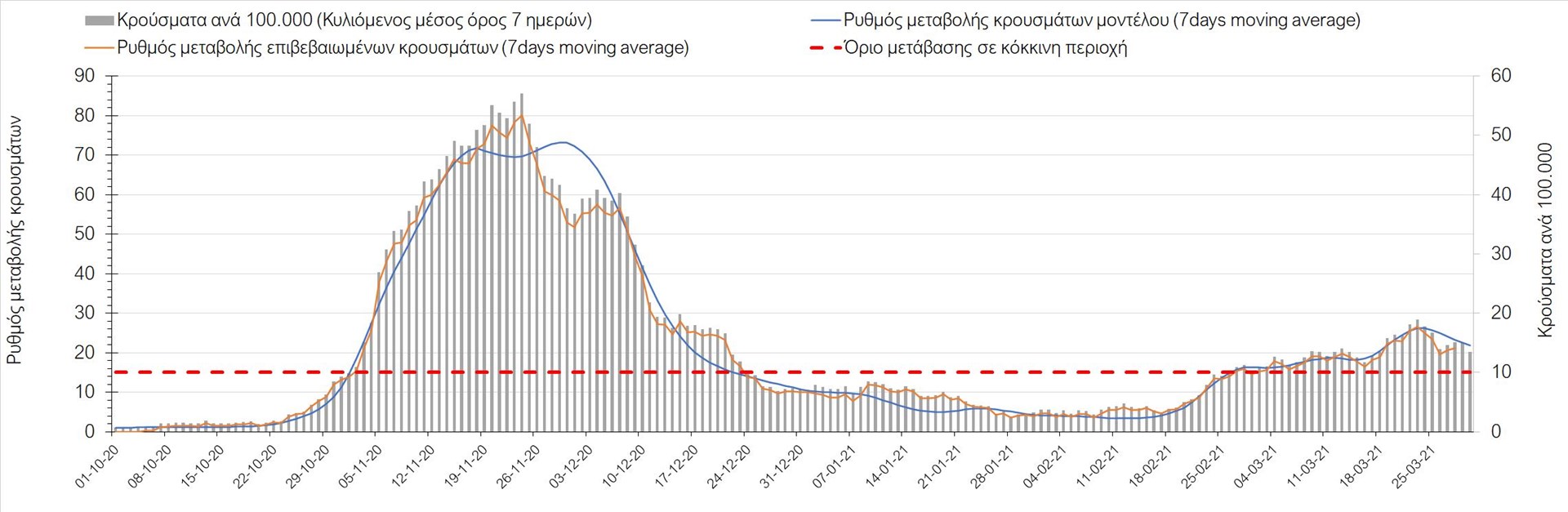 Η πορεία της μέσης εβδομαδιαίας τιμής των κρουσμάτων, καθώς και του κυλιόμενου μέσου όρου 7 ημερών του αριθμού των κρουσμάτων ανά 100.000 πληθυσμού, όπως έχουν καταγραφεί από τον ΕΟΔΥ και η αναμενόμενη πορεία τους όπως προδιαγράφεται από την υπολογιστική πλατφόρμα CORE για την Ελληνική επικράτεια μέχρι το τέλος του Μαρτίου, αποτυπώνονται στο Σχήμα 3. Αναμένεται μια αρχική σταθεροποίηση σε υψηλό αριθμό κορυσμάτων μέχρι το τέλος του μήνα και έπειτα μια μικρή αύξηση με κορύφωση στις 8 Απριλίου. Μετά από αυτήν την ημερομηνία και ανάλογα με τα μέτρα που θα έχουμε εφαρμόσει θα μπορούμε να δούμε σταδιακή αποκλιμάκωση της πανδημίας πανελλαδικά.Όπως φαίνεται από το διάγραμμα, από τις 8 Ιανουαρίου έχουμε μια αύξηση κρουσμάτων μέχρι τις 11 Ιανουαρίου η οποία οφείλεται στη μείωση της περιστολής που σημειώθηκε στις γιορτές. Από τις 11 μέχρι τις 18 Ιανουαρίου προβλεπόταν μια μείωση κρουσμάτων λόγω της εφαρμογής του lockdown και η οποία όντως παρατηρήθηκε. Εντούτοις, όπως είχαμε προβλέψει, από τις 23 Ιανουαρίου και έπειτα διαφαίνεται αύξηση στον κυλιόμενο μέσο όρο των κρουσμάτων, η οποία έγινε ιδιαίτερα έντονη μετά τις 17/2, η οποία και συνεχίζεται μέχρι τώρα. Λόγω της ισχυρής παρουσία των μεταλλαγμένων στελεχών, πιστεύουμε ότι για να επιτευχθεί κάμψη της επιδημικής καμπύλης, θα πρέπει να γίνει αυστηρή εφαρμογή των μέτρων, έτσι ώστε σε συνδυασμό με την επικρατούσα μετεωρολογία να επέλθει επιβράδυνση της ανόδου ή και σταθεροποίηση των κρουσμάτων προς το τέλος του μήνα. Πάντως για να μπορέσουμε να προχωρήσουμε σε σταδιακή άρση των περιοριστικών μέτρων για οικονομικές, εκπαιδευτικές και πολιτιστικές/αθλητικές δραστηριότητες, θα πρέπει να δημιουργήσουμε την κατάλληλη υποδομή ώστε να μπορέσουμε να αναχαιτίσουμε την υπερμετάδοση των μεταλλαγμένων στελεχών εκεί όπου συμβαίνει κατά το μάλλον, δηλαδή στους τόπους εργασίας και τα μέσα μαζικής μεταφοράς. Στα συμπεράσματα προτείνονται σχετικές λύσεις.