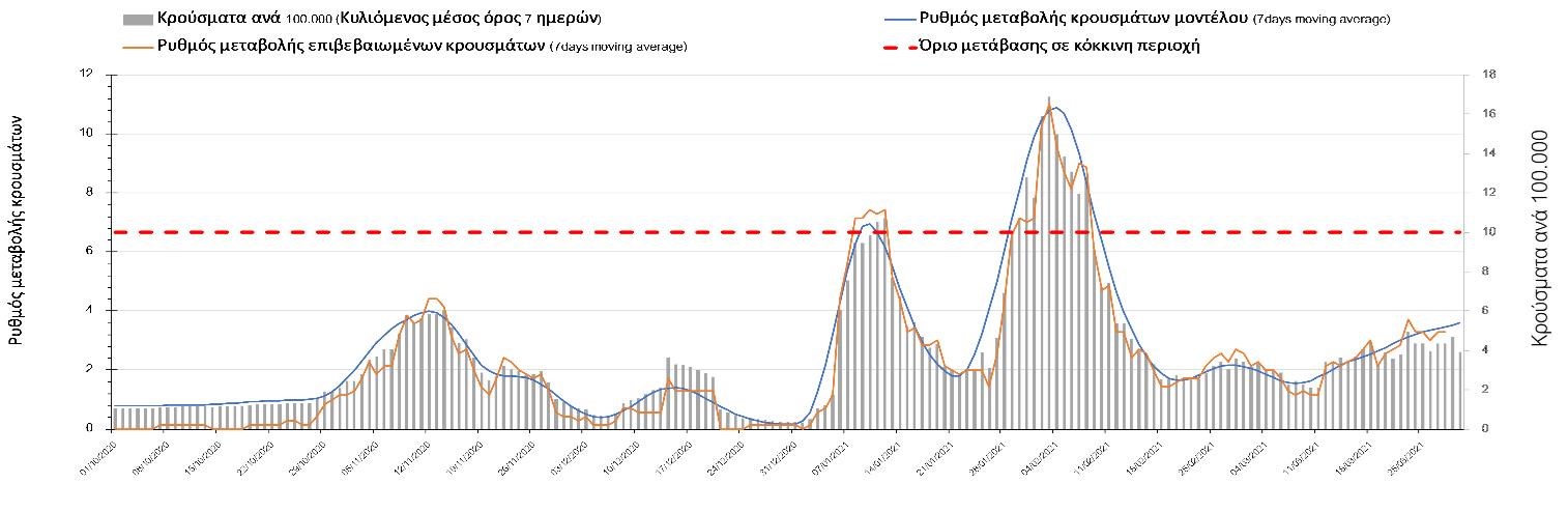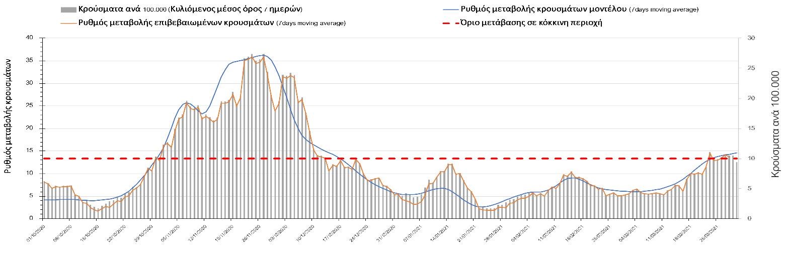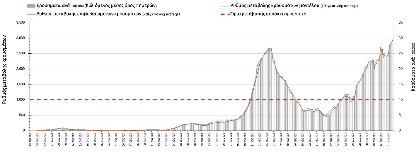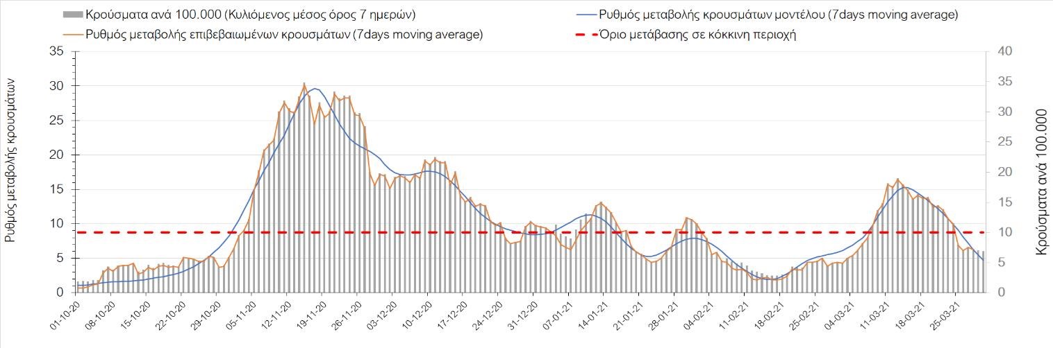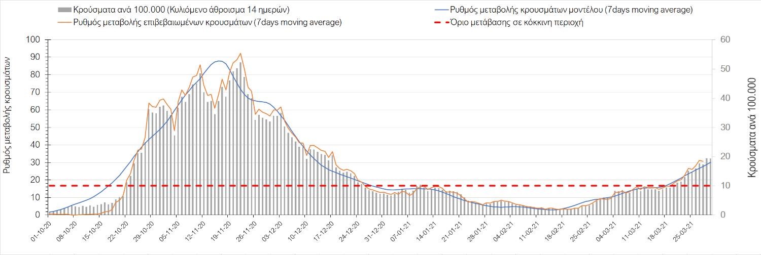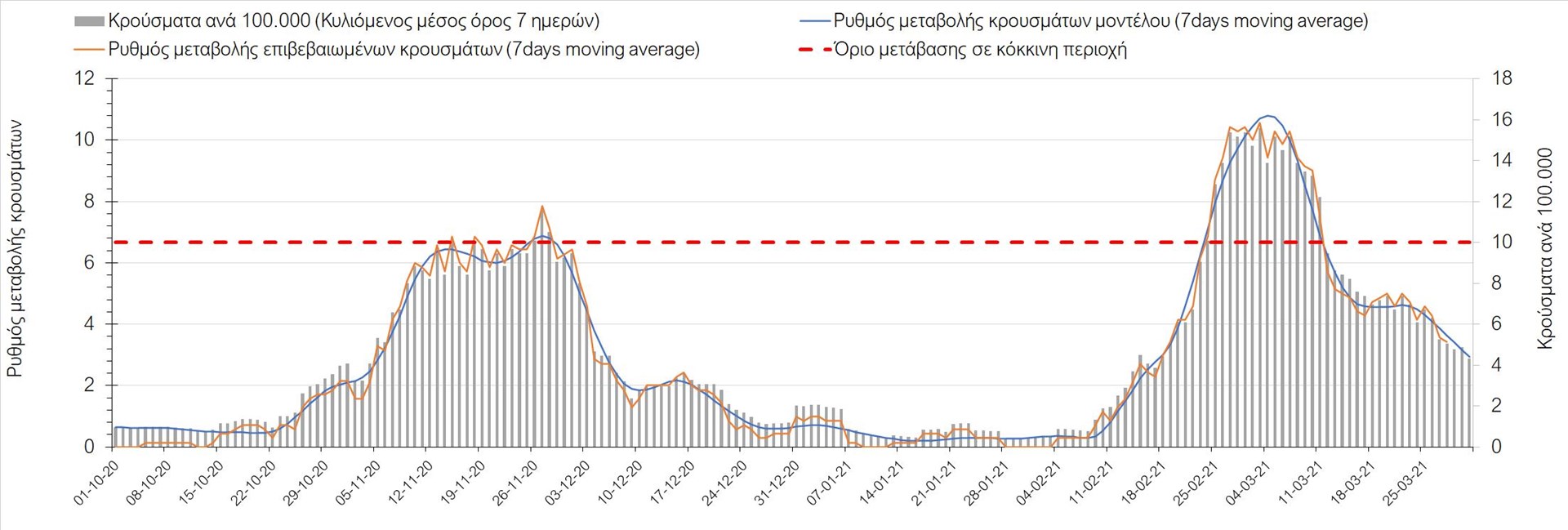 Η πορεία της μέσης εβδομαδιαίας τιμής των κρουσμάτων, καθώς και του κυλιόμενου μέσου όρου 7 ημερών του αριθμού των κρουσμάτων ανά 100.000 πληθυσμού, όπως έχουν καταγραφεί από τον ΕΟΔΥ και η αναμενόμενη πορεία τους όπως προδιαγράφεται από την υπολογιστική πλατφόρμα CORE για την Ελληνική επικράτεια μέχρι το τέλος του Μαρτίου, αποτυπώνονται στο Σχήμα 3. Αναμένεται μια αρχική σταθεροποίηση σε υψηλό αριθμό κορυσμάτων μέχρι το τέλος του μήνα και έπειτα μια μικρή αύξηση με κορύφωση στις 8 Απριλίου. Μετά από αυτήν την ημερομηνία και ανάλογα με τα μέτρα που θα έχουμε εφαρμόσει θα μπορούμε να δούμε σταδιακή αποκλιμάκωση της πανδημίας πανελλαδικά.Όπως φαίνεται από το διάγραμμα, από τις 8 Ιανουαρίου έχουμε μια αύξηση κρουσμάτων μέχρι τις 11 Ιανουαρίου η οποία οφείλεται στη μείωση της περιστολής που σημειώθηκε στις γιορτές. Από τις 11 μέχρι τις 18 Ιανουαρίου προβλεπόταν μια μείωση κρουσμάτων λόγω της εφαρμογής του lockdown και η οποία όντως παρατηρήθηκε. Εντούτοις, όπως είχαμε προβλέψει, από τις 23 Ιανουαρίου και έπειτα διαφαίνεται αύξηση στον κυλιόμενο μέσο όρο των κρουσμάτων, η οποία έγινε ιδιαίτερα έντονη μετά τις 17/2, η οποία και συνεχίζεται μέχρι τώρα. Λόγω της ισχυρής παρουσία των μεταλλαγμένων στελεχών, πιστεύουμε ότι για να επιτευχθεί κάμψη της επιδημικής καμπύλης, θα πρέπει να γίνει αυστηρή εφαρμογή των μέτρων, έτσι ώστε σε συνδυασμό με την επικρατούσα μετεωρολογία να επέλθει επιβράδυνση της ανόδου ή και σταθεροποίηση των κρουσμάτων προς το τέλος του μήνα. Πάντως για να μπορέσουμε να προχωρήσουμε σε σταδιακή άρση των περιοριστικών μέτρων για οικονομικές, εκπαιδευτικές και πολιτιστικές/αθλητικές δραστηριότητες, θα πρέπει να δημιουργήσουμε την κατάλληλη υποδομή ώστε να μπορέσουμε να αναχαιτίσουμε την υπερμετάδοση των μεταλλαγμένων στελεχών εκεί όπου συμβαίνει κατά το μάλλον, δηλαδή στους τόπους εργασίας και τα μέσα μαζικής μεταφοράς. Στα συμπεράσματα προτείνονται σχετικές λύσεις.