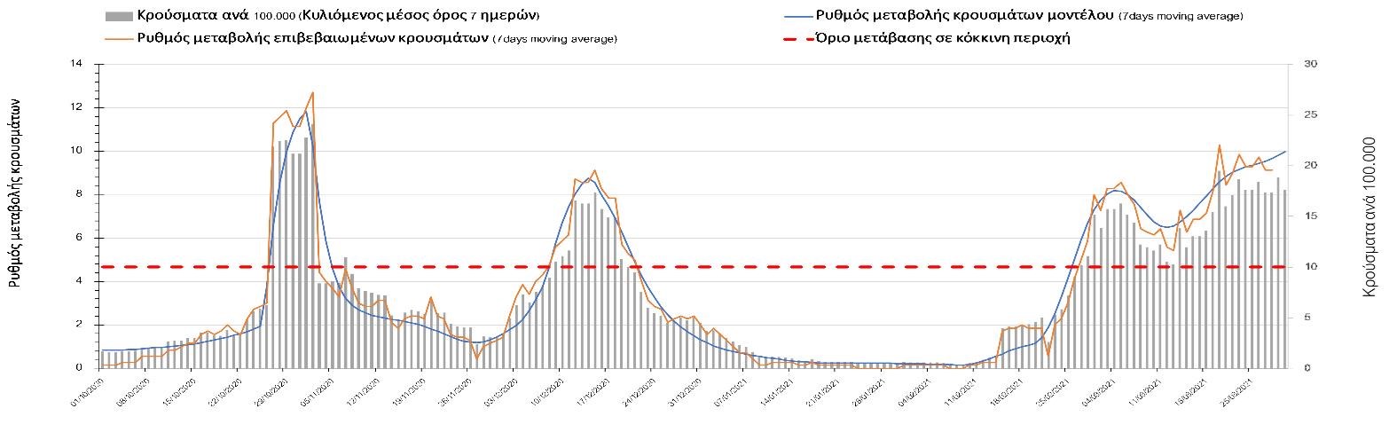 Συμπεράσματα:Η αύξηση που παρατηρείται πλέον στον αριθμό των ασθενών σε κρίσιμη κατάσταση (διασωληνομένοι σε ΜΕΘ), καθώς και ο αριθμός των θανάτων (αν και με κάποια μικρή απόκλιση) συνάδουν με τις προσομοιώσεις του μοντέλου CORE, όπως και ο αριθμός των κρουσμάτων, μετά και τις επικαιροποιημένες προβλέψεις προ 15 ημερών, όπου ελήφθη υπόψιν η μεγαλύτερη διασπορά των μεταλλαγμένων και ταχύτερα μεταδιδόμενων στελεχών. Σε πανελλαδικό επίπεδο ο κυλιόμενος εβδομαδιαίος μέσος όρος του δείκτη θετικότητας διαμορφώθηκε στο 7,6% (η ημερήσια τιμή είναι 6,8%) ενώ ο κυλιόμενος εβδομαδιαίος μέσος όρος του πραγματικού αριθμού αναπαραγωγής Rt (δηλαδή ο αριθμός των ατόμων που ένας φορέας μπορεί να επιμολύνει) διαμορφώθηκε στο 1,03 (τιμές του Rt πάνω από τη μονάδα υποδηλώνουν καθαρή αύξηση της διασποράς του ιού στην κοινότητα). Πλέον, με τον υψηλότερο αριθμό φορέων του μεταλλαγμένου στελέχους και την αναθεώρηση στις προβλέψεις, παρατηρούμε μια αμυδρά τάση κάμψης του ρυθμού αύξησης καθημερινά, και μπορεί να χρειαστεί να παραταθούν τα περιοριστικά μέτρα τουλάχιστον σε ό,τι αφορά στο άνοιγμα του λιανικού εμπορίου και μετά το τέλος Μαρτίου.