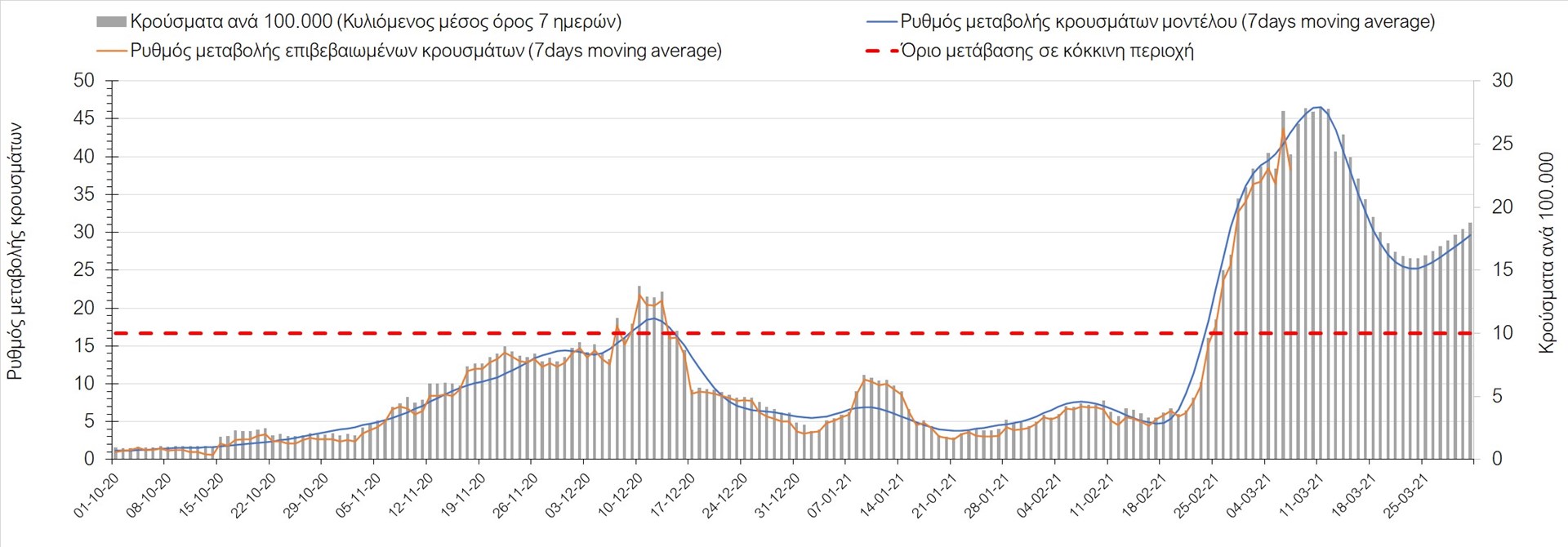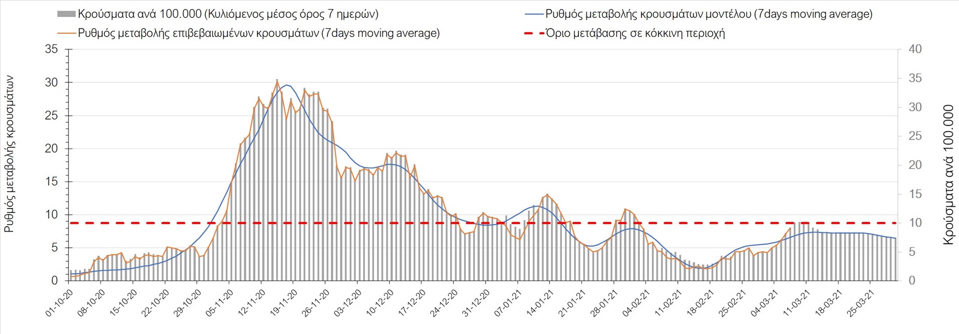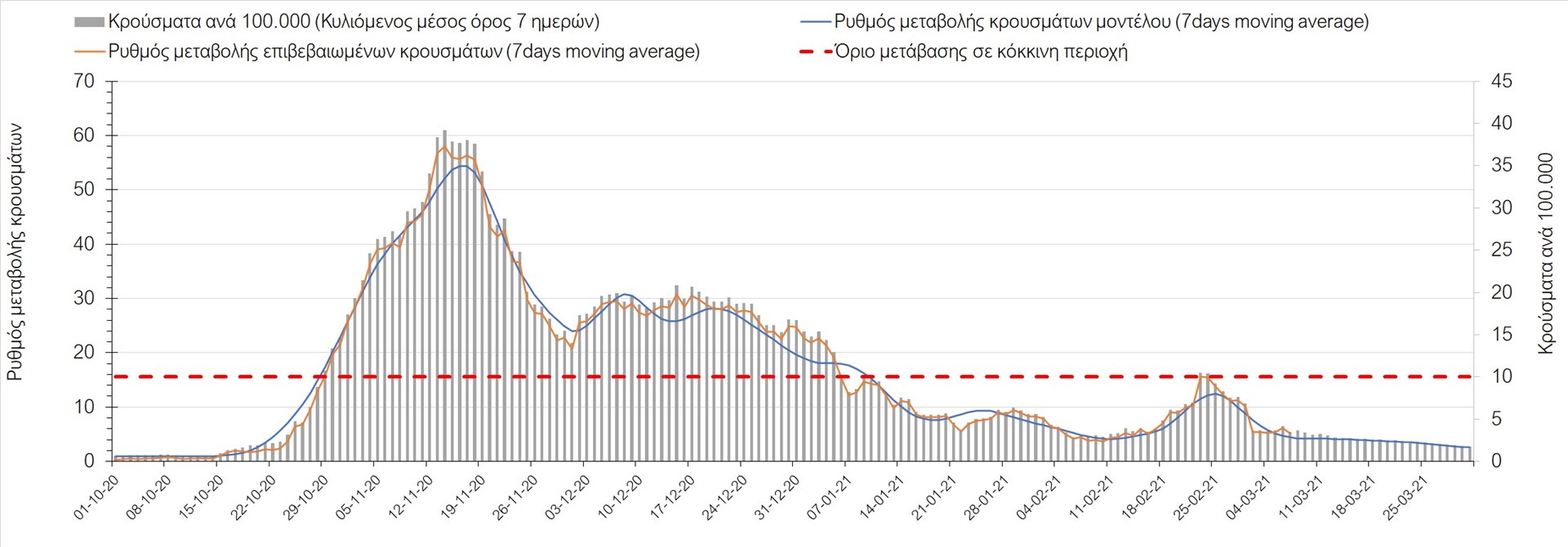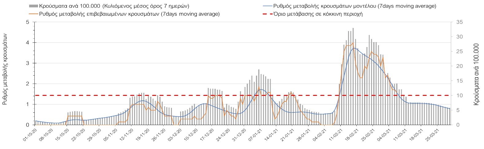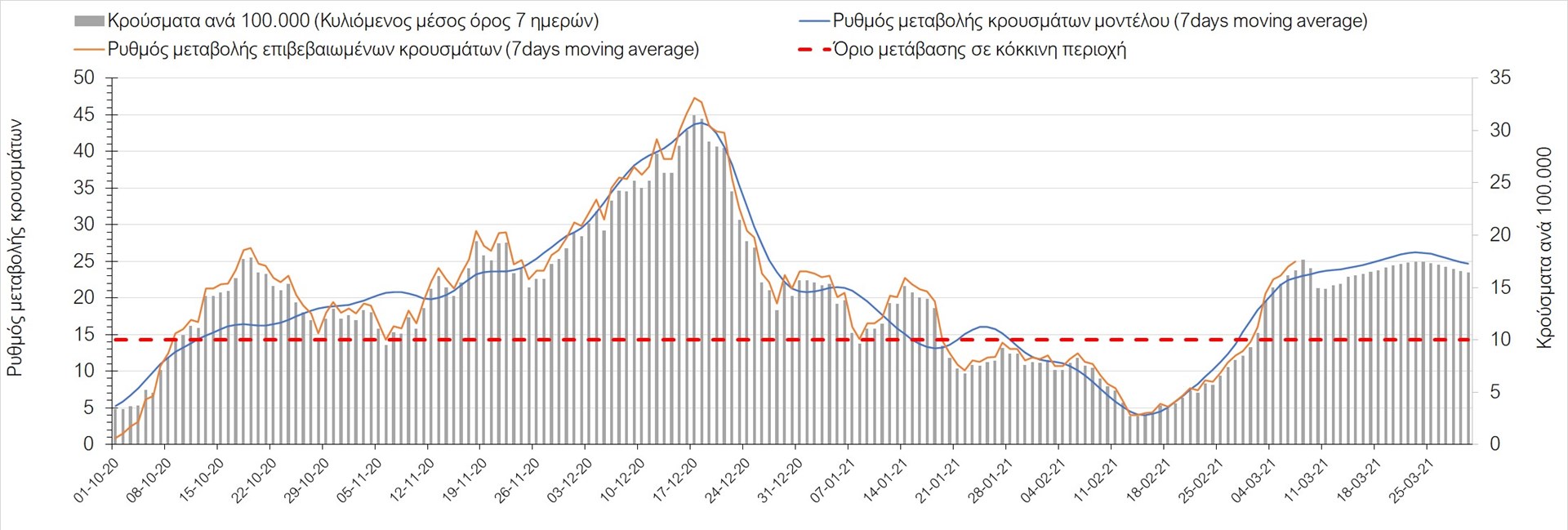 Σχήμα 27. Πορεία του ημερησίου αριθμού των κρουσμάτων (κυλιόμενος μέσος όρος 7 ημερών) στην Πιερία