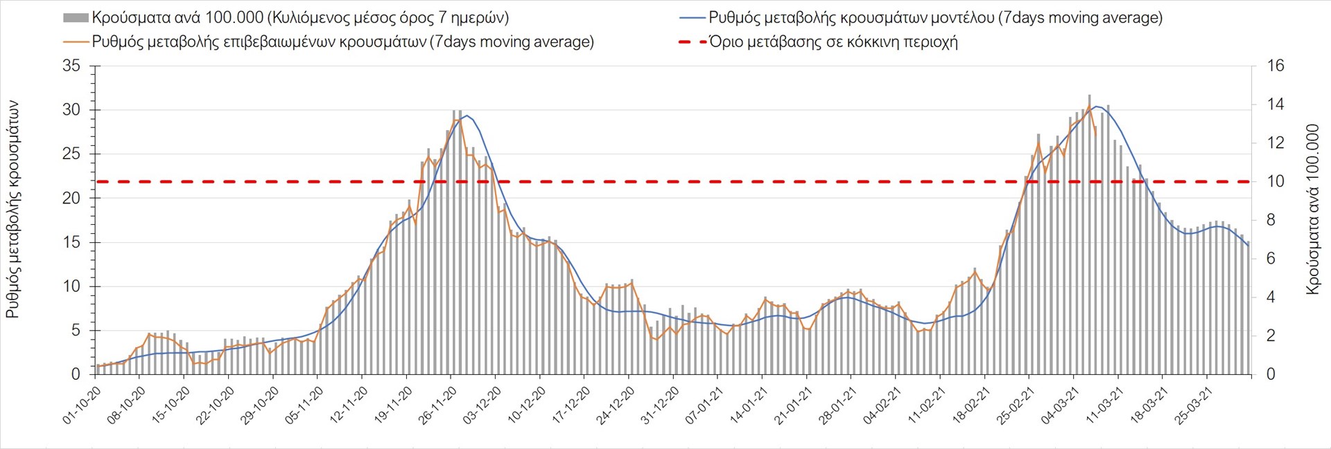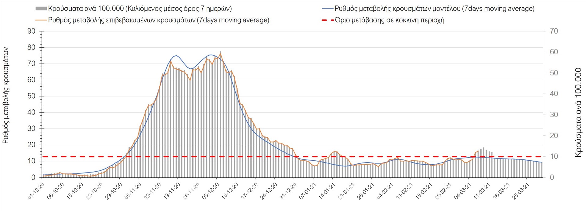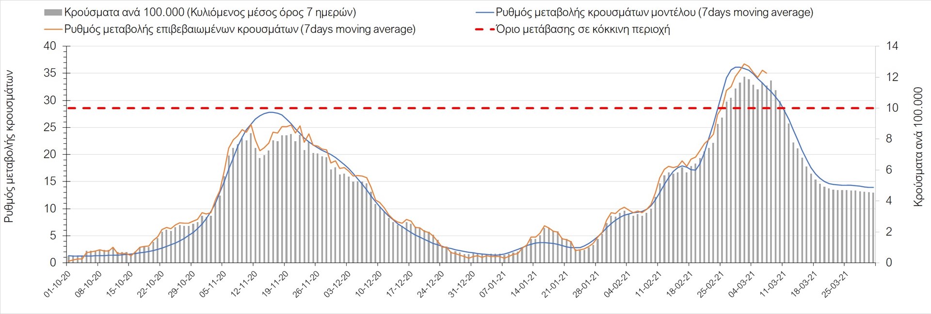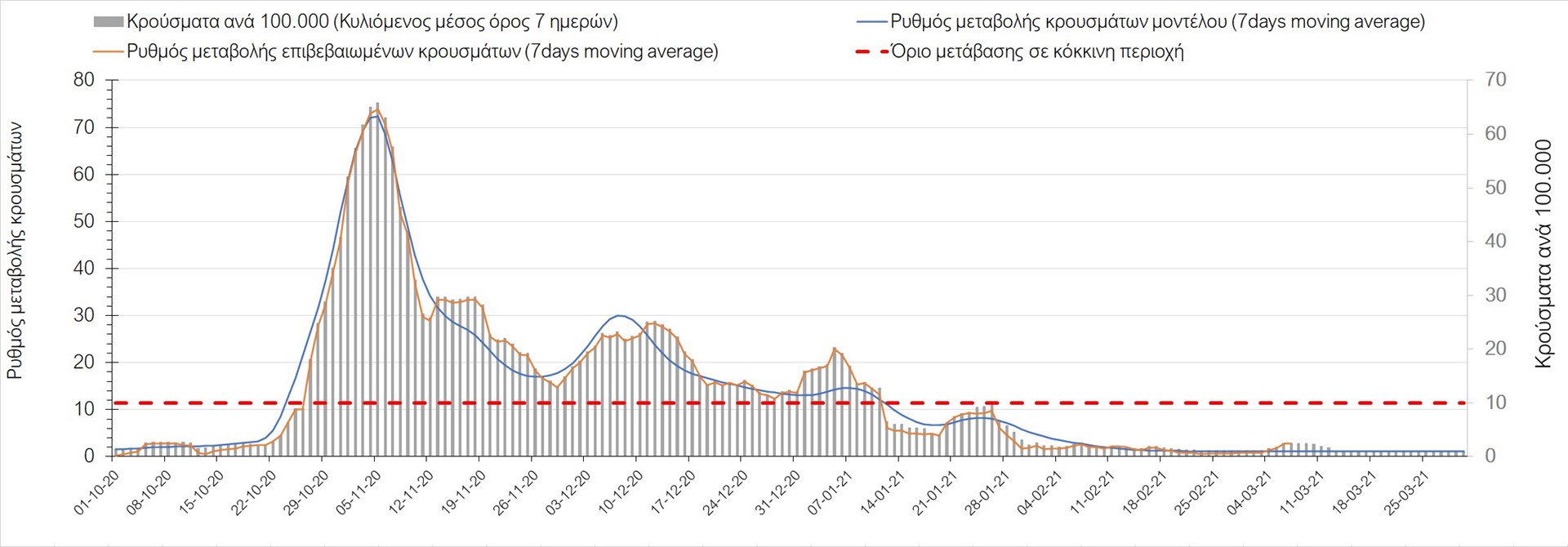 Σχήμα 27. Πορεία του ημερησίου αριθμού των κρουσμάτων (κυλιόμενος μέσος όρος 7 ημερών) στην Πιερία
