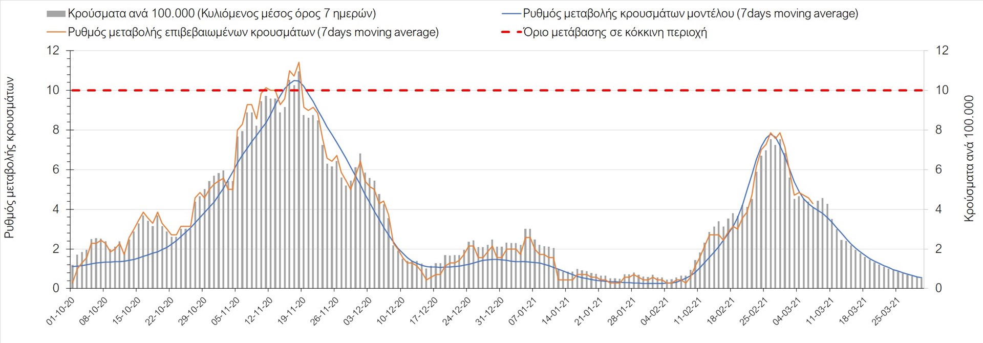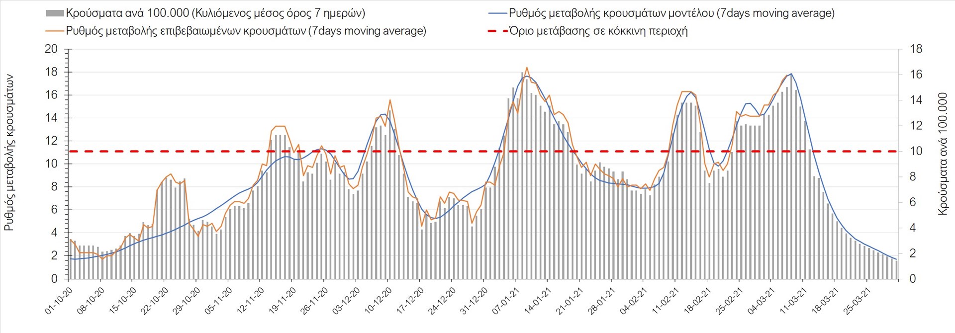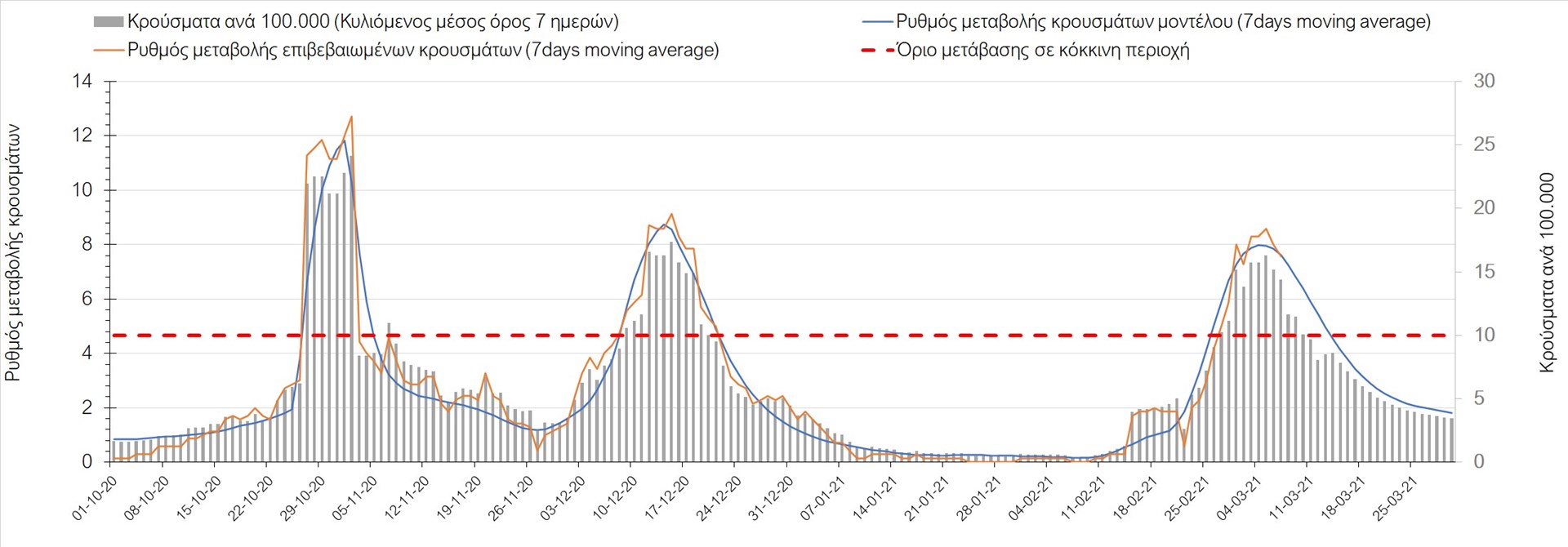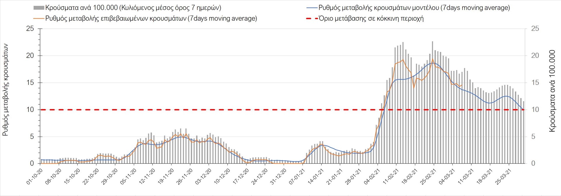 Σχήμα 27. Πορεία του ημερησίου αριθμού των κρουσμάτων (κυλιόμενος μέσος όρος 7 ημερών) στην Πιερία