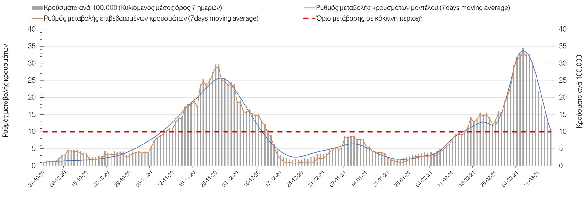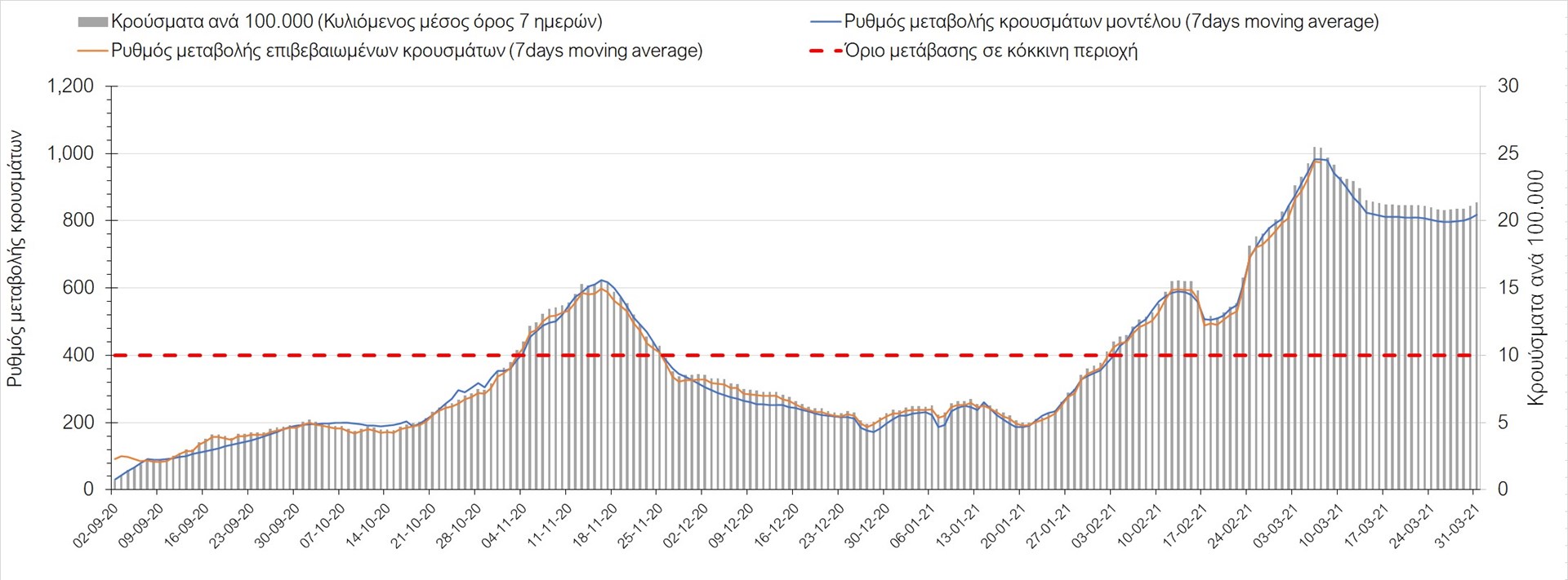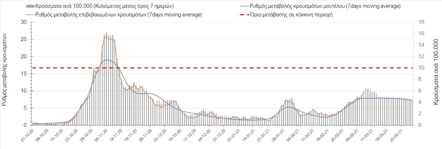 Σχήμα 41. Πορεία του ημερησίου αριθμού των κρουσμάτων (κυλιόμενος μέσος όρος 7 ημερών) στην ΘάσοΣυμπεράσματα:Η αύξηση που παρατηρείται πλέον στον αριθμό των ασθενών σε κρίσιμη κατάσταση (διασωληνωμένοι σε ΜΕΘ), καθώς και ο αριθμός των θανάτων συνάδουν με τις προσομοιώσεις του μοντέλου CORE για τον επόμενο μήνα, ενώ και ο αριθμός των νέων κρουσμάτων παραμένει ανησυχητικός, ιδιαίτερα για την Αττική. Τα παραπάνω αποτελέσματα αποτυπώνονται και στο δείκτη θετικότητας. Σε πανελλαδικό επίπεδο ο κυλιόμενος εβδομαδιαίος μέσος όρος του δείκτη θετικότητας παρέμεινε στο 4,6% (η ημερήσια τιμή την Κυριακή ήταν 4,7%) ενώ ο κυλιόμενος εβδομαδιαίος μέσος όρος του πραγματικού αριθμού αναπαραγωγής Rt (δηλαδή ο αριθμός των ατόμων που ένας φορέας μπορεί να επιμολύνει) έπεσε στο 1,22 (τιμές του Rt πάνω από τη μονάδα υποδηλώνουν καθαρή αύξηση της διασποράς του ιού στην κοινότητα) κάτι που καταδεικνύει την επιβράδυνση της αυξητικής πορείας της πανδημίας πανελλαδικά.Mε βάση τα δεδομένα αυτής της εβδομάδας, καλώς εφαρμόσθηκαν τα περιοριστικά μέτρα που ισχύουν από τις 4 Μαρτίου, τα οποία ίσως χρειαστούν επιπλέον αναθεώρηση, με βάση την επιδημιολογική εικόνα που θα επικρατήσει, ενώ επίσης καλώς εφαρμόσθηκε το lockdown στην Αθήνα μέχρι τις 15 Μαρτίου. Με τα μέχρι τώρα δεδομένα, τα μέτρα αυτά φαίνονται να είναι προς τη σωστή κατεύθυνση, και αναμένουμε να δούμε εάν θα αποδειχθούν ικανά και στην πράξη να αναχαιτίσουν την επέλαση ενός τρίτου κύματος, εν αναμονή και επιπλέον στοιχείων, τόσο για τη μεταδοτικότητα του στελέχους B.1.1.7. του SARS-CoV-2, όσο και της διασποράς του στην κοινότητα, οπότε συνολικά προτείνουμε την εφαρμογή καθολικού lockdown σε όλη τη χώρα, ώστε να αναχαιτιστεί η διαφαινόμενη ανοδική πορεία που διαμορφώνεται. Η πρόταση αυτή υποστηρίζεται και από το υψηλό ποσοστό πληρότητας των ΜΕΘ, των οποίων οι ανάγκες αναμένεται να συνεχίσουν να αυξάνουν.Παρά την εφαρμογή οριζόντιων μέτρων ανάσχεσης της πανδημίας που εφαρμόσθηκαν από τα τέλη Οκτωβρίου, η πορεία της τελευταίας διαφοροποιείται από περιοχή σε περιοχή. Οι παραπάνω παρατηρήσεις τείνουν στο συμπέρασμα ότι η διαχείριση του υγειονομικού κινδύνου θα πρέπει να εξεταστεί σε τοπικό επίπεδο. Πλέον προβληματίζουν πέρα από την Αττική, η Αχαΐα, η Αιτωλοακαρνανία, η Εύβοια, η Βοιωτία, η Θάσος, η Χαλκιδική, καθώς επίσης η Αρκαδία, η Αργολίδα, η Φθιώτιδα, η Λάρισα, τα Γρεβενά, η Χίος, το Ρέθυμνο, το Ηράκλειο και τα Ιωάννινα. Προσοχή πρέπει να δοθεί στην επιδημιολογική παρατήρηση στην Ημαθία. Προσοχή χρειάζεται και η Θεσσαλονίκη, ώστε να μην ξεφύγει η διασπορά της νοτιοαφρικανική μετάλλαξης στην κοινότητα. Συνολικά, τα τεστ ανίχνευσης θα πρέπει να φτάσουν τουλάχιστον στα 80.000 και να δίνεται έμφαση στοχευμένα στις περιφερειακές ενότητες στις οποίες η δυναμική της διασποράς φαίνεται να είναι ανησυχητική για 1-2 ημέρες ώστε να ανιχνεύονται οι ασυμπτωματικοί και προσυμπτωματικοί φορείς και να σπάει η αλυσίδα μετάδοσης βάζοντάς τους σε καραντίνα. Λόγω της ανησυχίας που εγείρει η παρουσία στην κοινότητα των μεταλλαγμένων στελέχους του SARS-CoV-2 (κυρίως η βρετανική και η νοτιοαφρικανική μετάλλαξη) και προκειμένου να περιορίσουμε ή τουλάχιστον να καθυστερήσουμε την ευρεία διασπορά τους, προτείνουμε τα ακόλουθα μέτρα πριν συζητηθεί το περαιτέρω άνοιγμα εκπαιδευτικών και οικονομικών δραστηριοτήτων:– εφαρμογή του ήδη υπάρχοντος νομοθετ