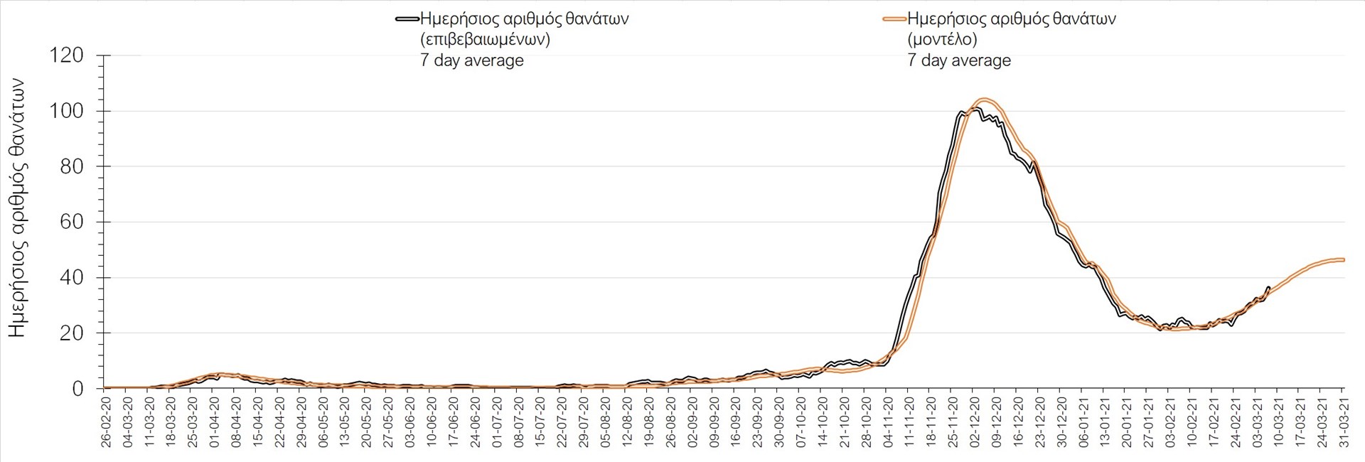 Σχήμα 2. Αριθμός θανάτων (κυλιόμενος μέσος όρος 7 ημερών) σύμφωνα με τα στοιχεία του ΕΟΔΥ και τις προβλέψεις της υπολογιστικής πλατφόρμας CORE.Η πορεία της μέσης εβδομαδιαίας τιμής των κρουσμάτων, καθώς και του κυλιόμενου μέσου όρου 7 ημερών του αριθμού των κρουσμάτων ανά 100.000 πληθυσμού, όπως έχουν καταγραφεί από τον ΕΟΔΥ και η αναμενόμενη πορεία τους όπως προδιαγράφεται από την υπολογιστική πλατφόρμα CORE για την Ελληνική επικράτεια μέχρι το τέλος του Ιανουαρίου, αποτυπώνονται στο Σχήμα 3. Η ανάλυσή μας έχει επικαιροποιηθεί με βάση την απόφαση εφαρμογής αυστηρού lockdown από την Κυριακή 3 Ιανουαρίου μέχρι και τις 17 Ιανουαρίου. Στις 11 Ιανουαρίου λάβαμε υπόψη το άνοιγμα της πρωτοβάθμιας εκπαίδευσης, ενώ το άνοιγμα των βιβλιοπωλείων, κομμωτηρίων, λιανικού εμπορίου και των εμπορικών καταστημάτων από τη Δευτέρα 18/1, ενώ επιπλέον, έχει ληφθεί υπόψη το άνοιγμα τις δευτεροβάθμιας εκπαίδευσης από τη Δευτέρα 1 Φεβρουαρίου στις κίτρινες περιοχές. Στις κόκκινες περιοχές, από τη Δευτέρα 1 Φεβρουαρίου έχει γίνει άνοιγμα μόνο των Γυμνασίων (και συνεχίζεται το καθεστώς τηλε-εκπαίδευση για τα Λύκεια), στις οποίες επίσης, η λειτουργία του λιανεμπορίου θα πραγματοποιείται με τη μέθοδο click away, και η λειτουργία καταστημάτων ένδυσης, υπόδησης, βιβλιοπωλείων, κομμωτηρίων και καταστημάτων προσωπικής περιποίησης με προκαθορισμένο ραντεβού (click-in-a-shop) και με 1 άτομο ανά 25 τ.μ. Έχουν ληφθεί υπόψιν τα περιοριστικά μέτρα που ανακοινώθηκαν στις 5 Φεβρουαρίου) για Αθήνα, Θεσσαλονίκη, Πάτρα, Χαλκίδα και Χαλκιδική και που τέθηκαν σε ισχύ από το Σάββατο 6 Φεβρουαρίου και μέχρι τη Δευτέρα 15 Φεβρουαρίου, ενώ επιπλέον για την Αθήνα και στο βαθμό που αυτή επηρεάζει όλη την υπόλοιπη Ελλάδα, το αυστηρό lock down, με εφαρμογή από την Πέμπτη 11/2 έως και τις 15/3. Επιπλέον, στο σύνολο της Ελλάδας έχει ληφθεί υπόψιν το lockdown μέχρι και τις 15/3 που εφαρμόσθηκε στις Περιφερειακές Ενότητες Αχαΐας, Αρκαδίας, Θεσσαλονίκης, Λάρισας, Λευκάδας, Φθιώτιδας, Αργολίδας, Κορινθίας, Θεσπρωτίας, Άρτας, Σάμου, Βοιωτίας, Χίου, Αιτωλοακαρνανίας, Ρόδου, Ηρακλείου και Ευβοίας. Επιπλέον, όσον αφορά τις προσομοιώσεις των επιμέρους περιοχών, έγινε επικαιροποίηση των προβλέψεων σε όλες τις επιμέρους περιφερειακές ενότητες όπου εφαρμόσθηκε το lockdown από τις 4/3.