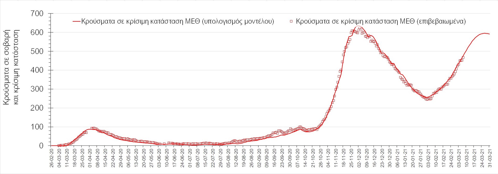 Όσον αφορά στους ασθενείς σε κρίσιμη κατάσταση (διασωληνωμένοι σε ΜΕΘ), την Κυριακή ο αριθμός τους αυξήθηκε σε σχέση με το Σάββατο (466 από 452), ενώ αναμένεται να φτάσουν στους 561 μέχρι τις 25 Μαρτίου. Η καμπύλη εξέλιξης του αριθμού των ασθενών με βάση τις προσομοιώσεις της πλατφόρμας CORE, όπως αυτή παρουσιάζεται στο Σχήμα 1, ενώ μια εκτίμηση για την πορεία των θανάτων ανά ημέρα παρουσιάζεται στο Σχήμα 2.