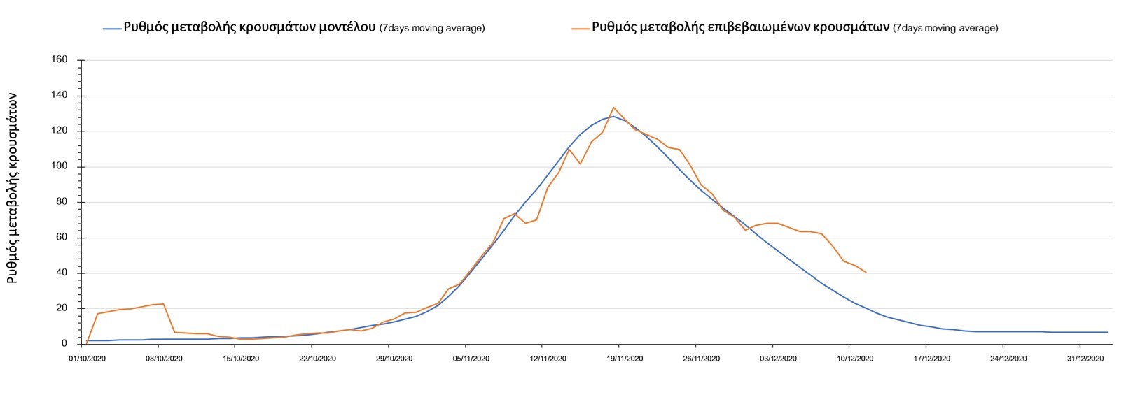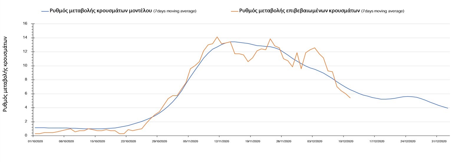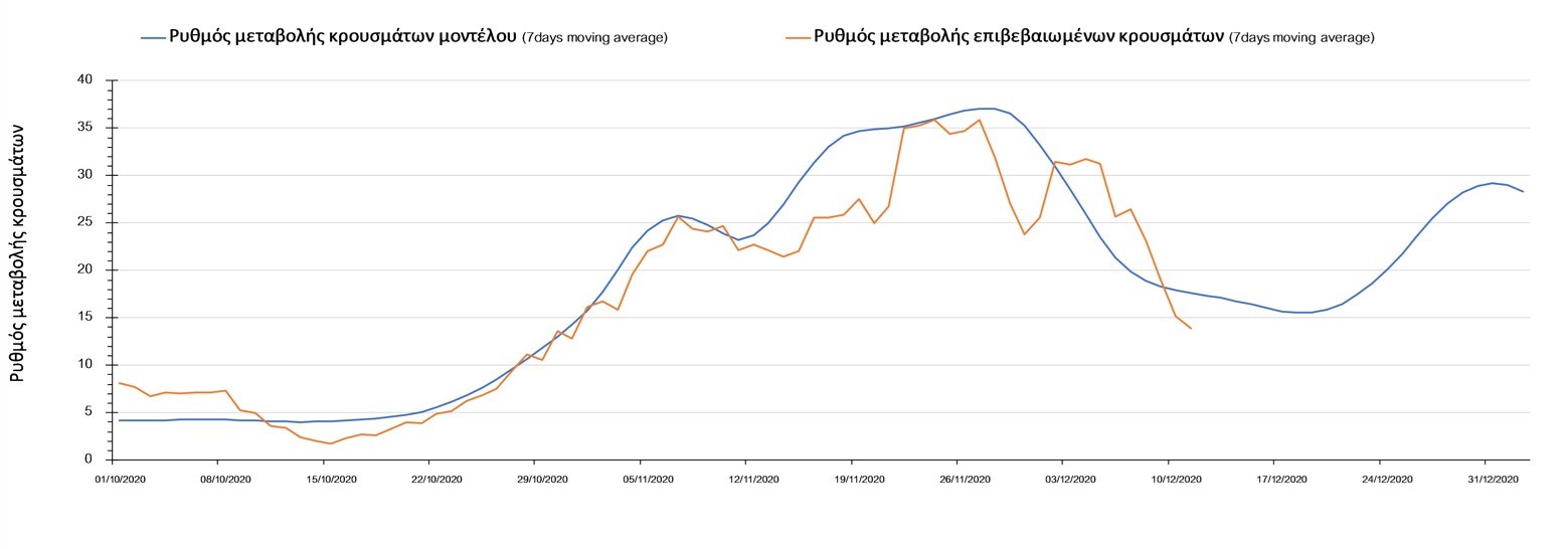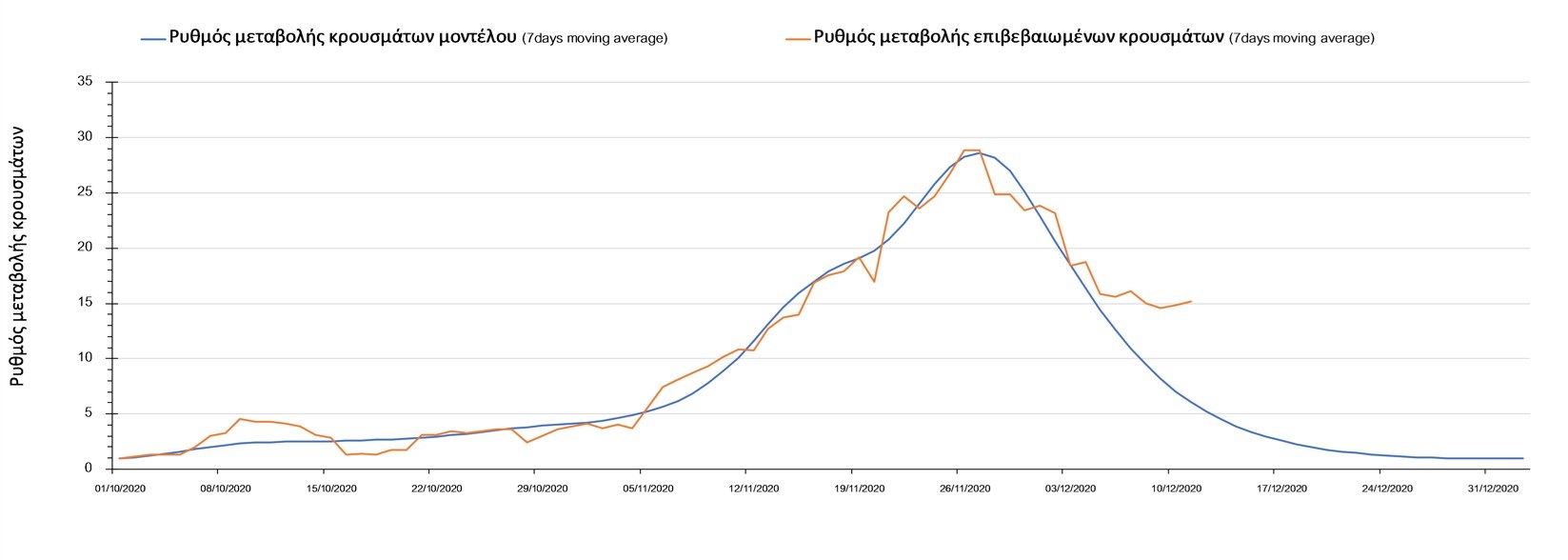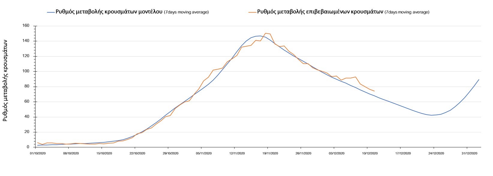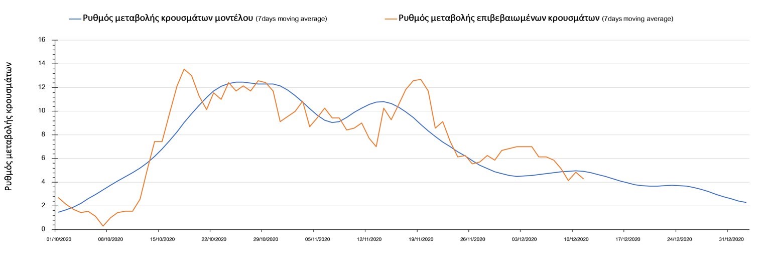 Σχήμα 2. Αριθμός θανάτων (κυλιόμενος μέσος όρος 7 ημερών) σύμφωνα με τα στοιχεία του ΕΟΔΥ και τις προβλέψεις της υπολογιστικής πλατφόρμας CORE.Η πορεία της μέσης εβδομαδιαίας τιμής των κρουσμάτων όπως έχουν καταγραφεί από τον ΕΟΔΥ και η αναμενόμενη πορεία τους, σύμφωνα με την υπάρχουσα κατάσταση και την απόφαση παράτασης του lockdown μέχρι και τις 7 Ιανουαρίου, όπως προδιαγράφεται από την υπολογιστική πλατφόρμα CORE για την Ελληνική επικράτεια, αποτυπώνονται στο Σχήμα 3.