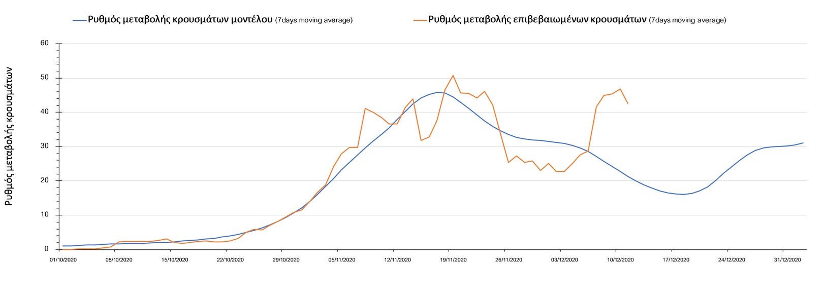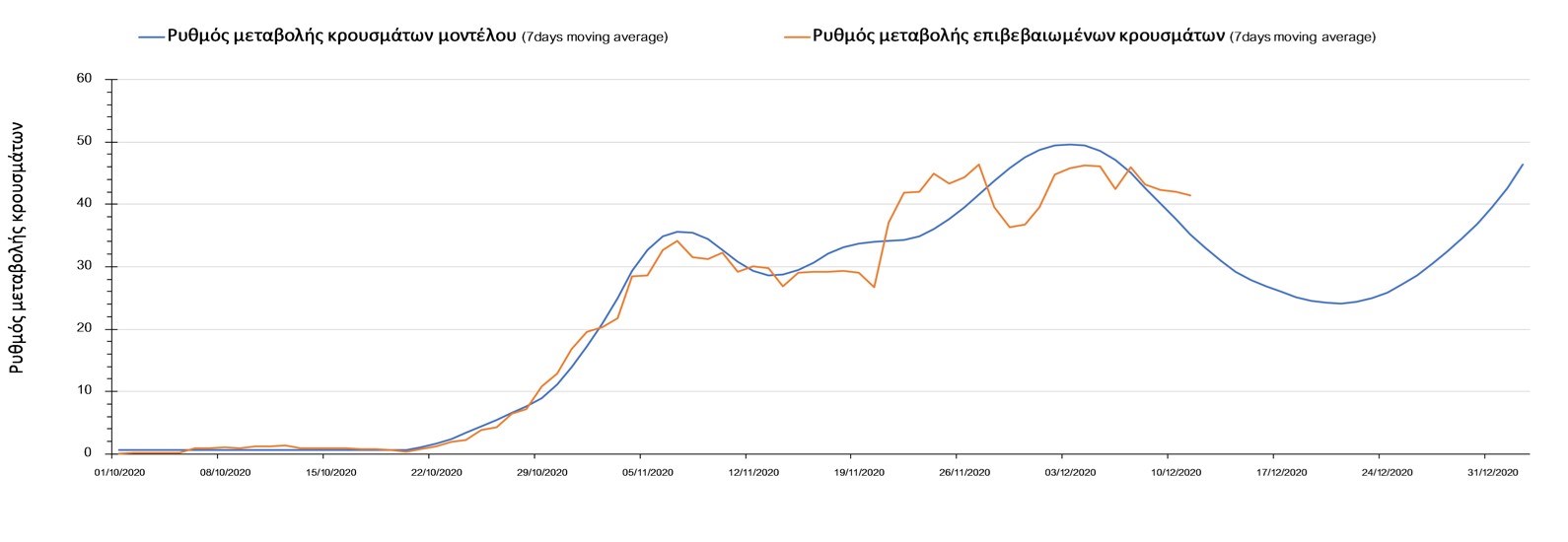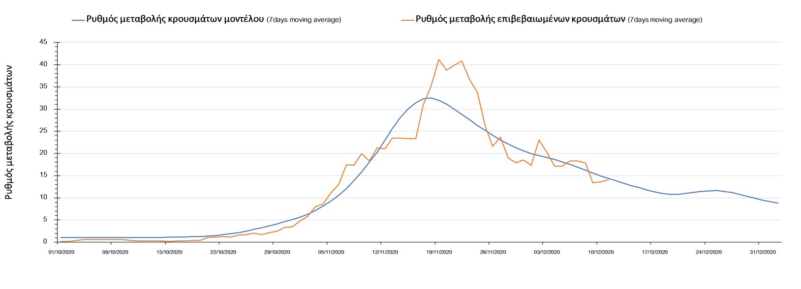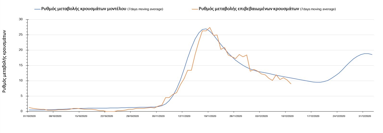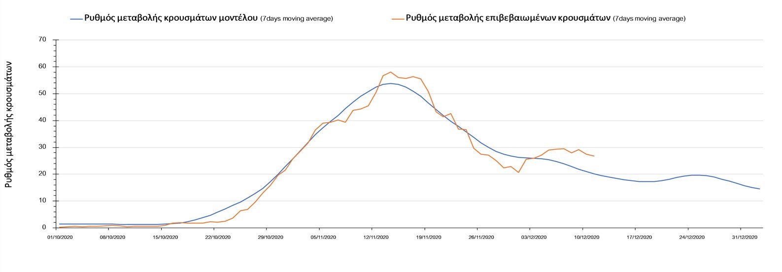 Σχήμα 2. Αριθμός θανάτων (κυλιόμενος μέσος όρος 7 ημερών) σύμφωνα με τα στοιχεία του ΕΟΔΥ και τις προβλέψεις της υπολογιστικής πλατφόρμας CORE.Η πορεία της μέσης εβδομαδιαίας τιμής των κρουσμάτων όπως έχουν καταγραφεί από τον ΕΟΔΥ και η αναμενόμενη πορεία τους, σύμφωνα με την υπάρχουσα κατάσταση και την απόφαση παράτασης του lockdown μέχρι και τις 7 Ιανουαρίου, όπως προδιαγράφεται από την υπολογιστική πλατφόρμα CORE για την Ελληνική επικράτεια, αποτυπώνονται στο Σχήμα 3.