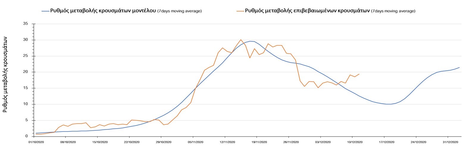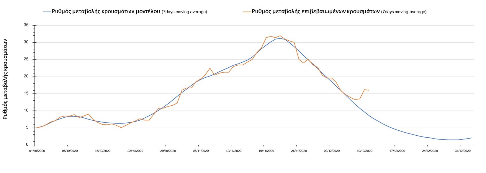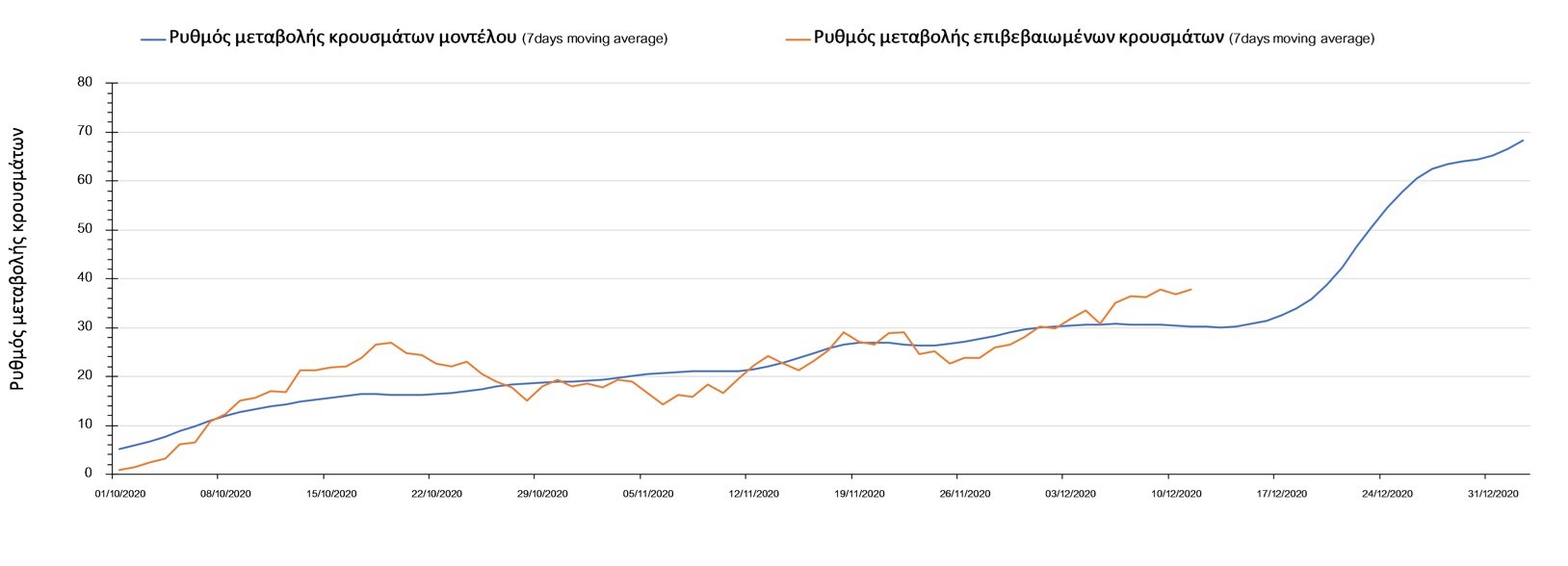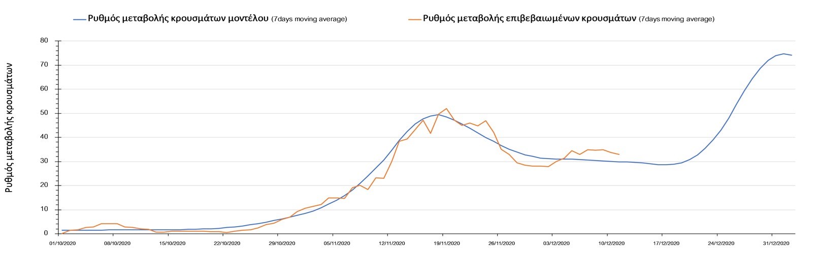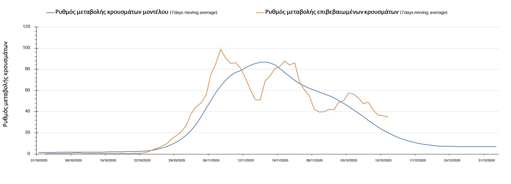 Σχήμα 2. Αριθμός θανάτων (κυλιόμενος μέσος όρος 7 ημερών) σύμφωνα με τα στοιχεία του ΕΟΔΥ και τις προβλέψεις της υπολογιστικής πλατφόρμας CORE.Η πορεία της μέσης εβδομαδιαίας τιμής των κρουσμάτων όπως έχουν καταγραφεί από τον ΕΟΔΥ και η αναμενόμενη πορεία τους, σύμφωνα με την υπάρχουσα κατάσταση και την απόφαση παράτασης του lockdown μέχρι και τις 7 Ιανουαρίου, όπως προδιαγράφεται από την υπολογιστική πλατφόρμα CORE για την Ελληνική επικράτεια, αποτυπώνονται στο Σχήμα 3.