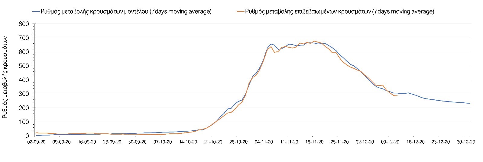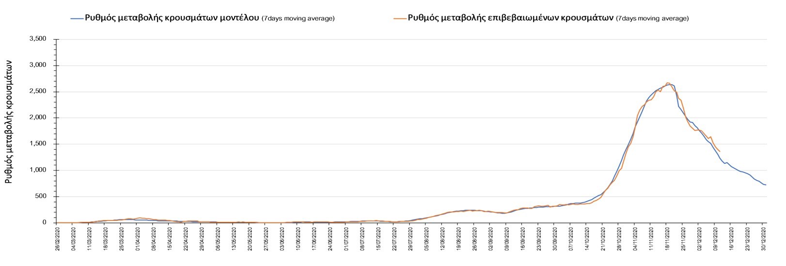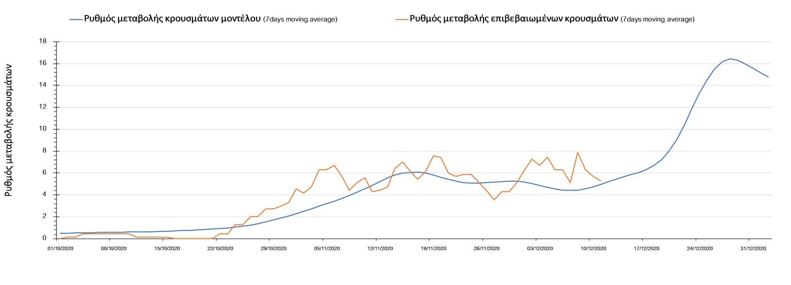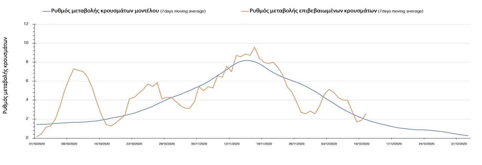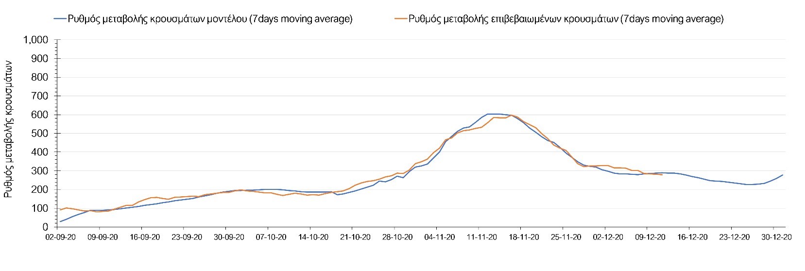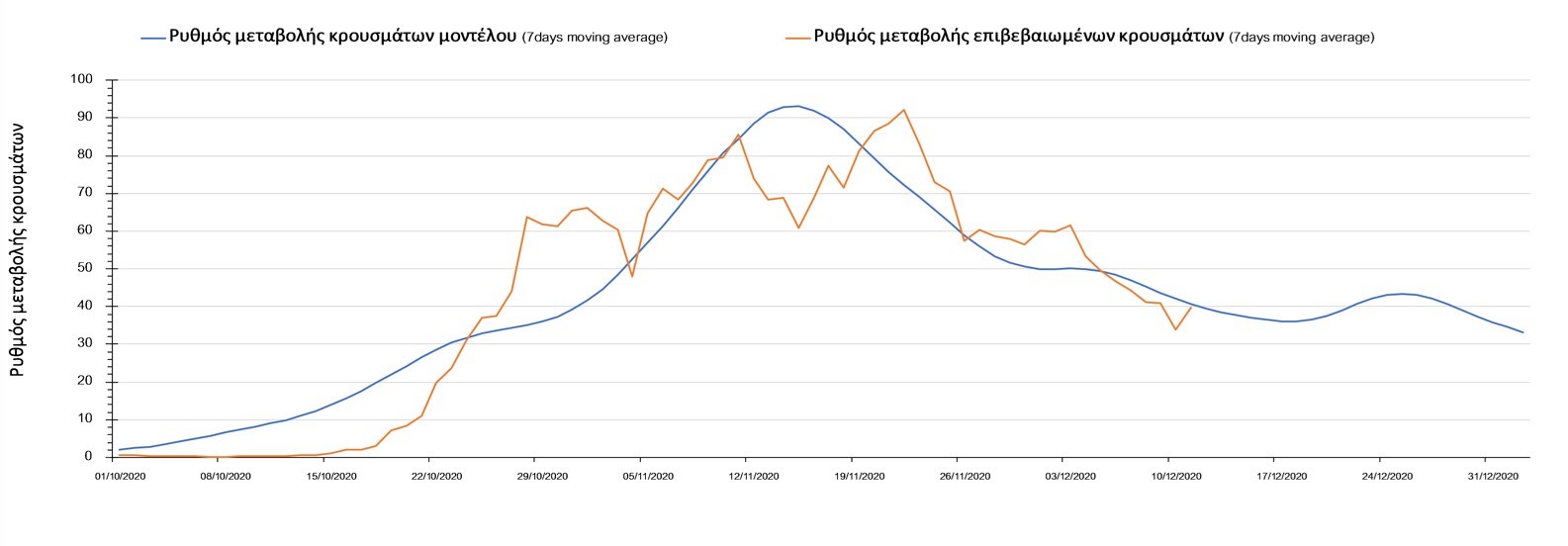Σχήμα 2. Αριθμός θανάτων (κυλιόμενος μέσος όρος 7 ημερών) σύμφωνα με τα στοιχεία του ΕΟΔΥ και τις προβλέψεις της υπολογιστικής πλατφόρμας CORE.Η πορεία της μέσης εβδομαδιαίας τιμής των κρουσμάτων όπως έχουν καταγραφεί από τον ΕΟΔΥ και η αναμενόμενη πορεία τους, σύμφωνα με την υπάρχουσα κατάσταση και την απόφαση παράτασης του lockdown μέχρι και τις 7 Ιανουαρίου, όπως προδιαγράφεται από την υπολογιστική πλατφόρμα CORE για την Ελληνική επικράτεια, αποτυπώνονται στο Σχήμα 3.