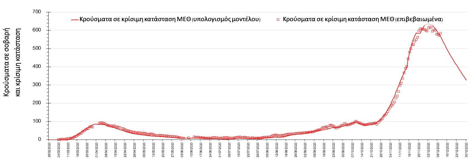 Σχήμα 1. Αριθμός κρουσμάτων σε κρίσιμη κατάσταση (ΜΕΘ) σύμφωνα με τα στοιχεία του ΕΟΔΥ και τις προβλέψεις της υπολογιστικής πλατφόρμας CORE.