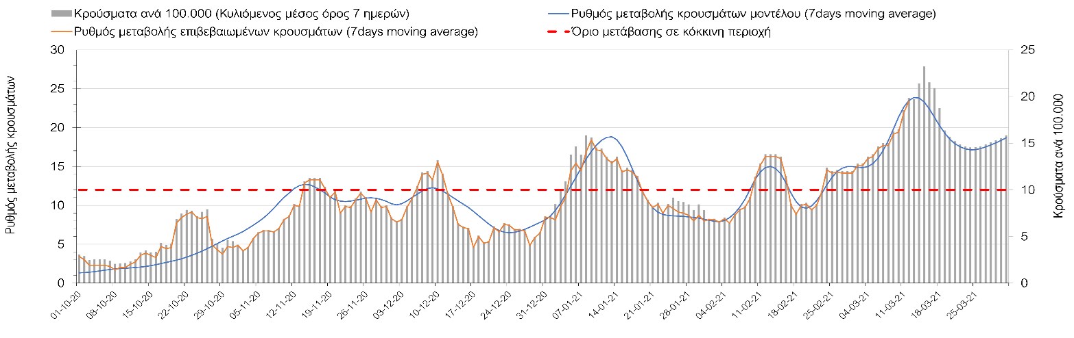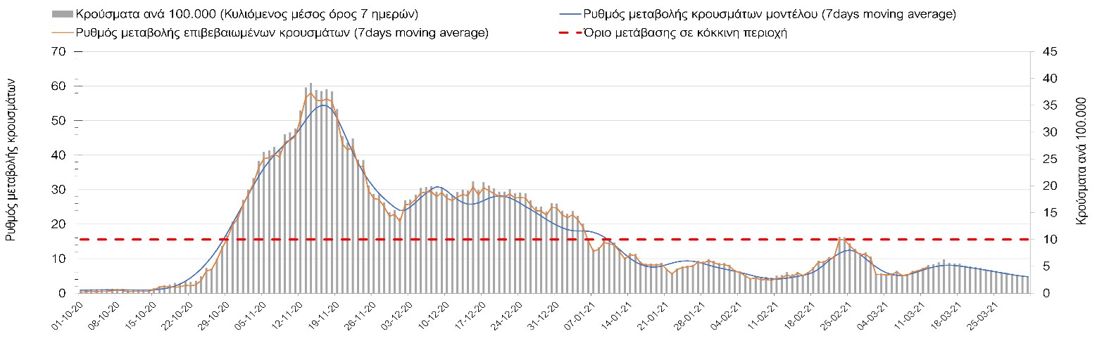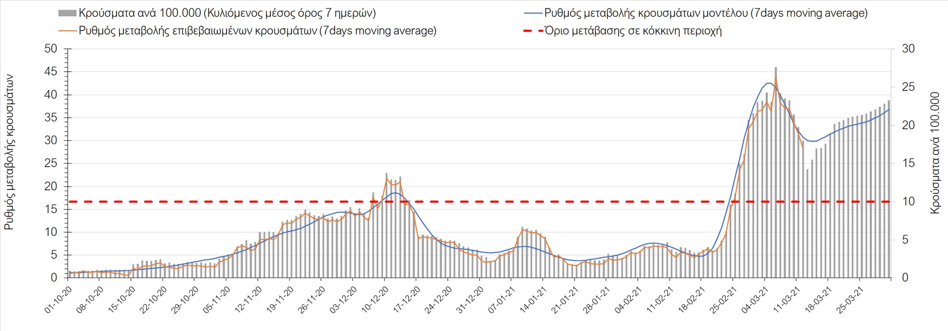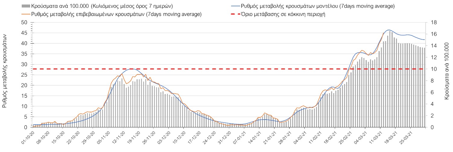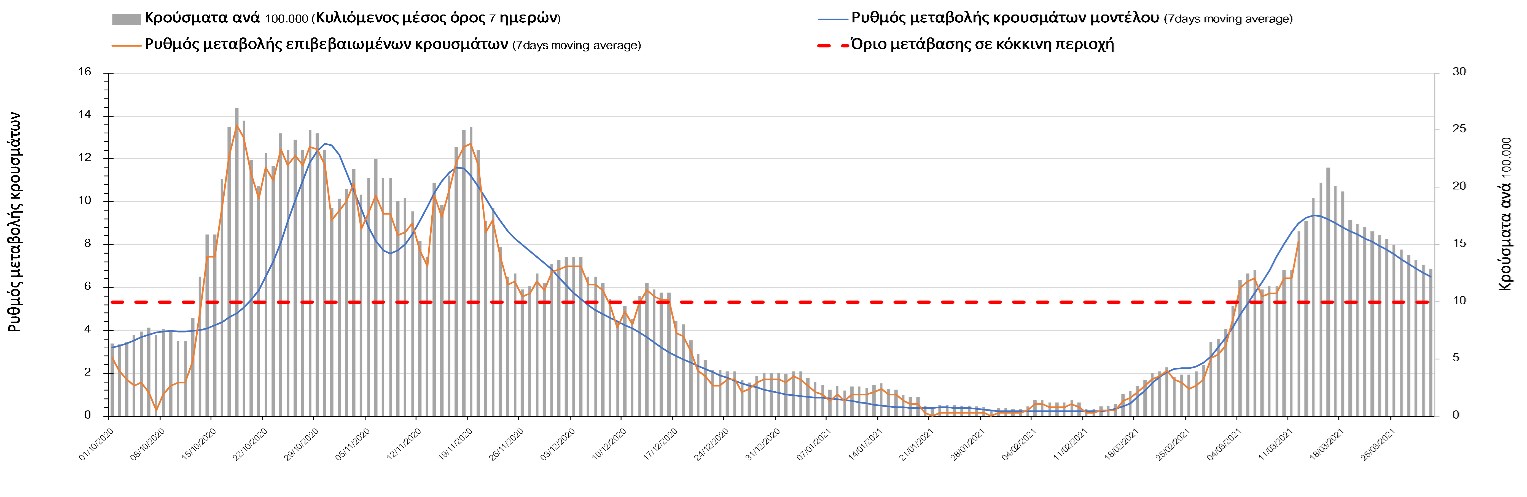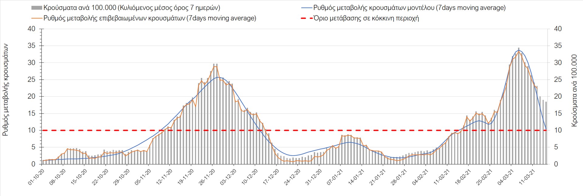 Όπως φαίνεται από το διάγραμμα, από τις 8 Ιανουαρίου έχουμε μια αύξηση κρουσμάτων μέχρι τις 11 Ιανουαρίου η οποία οφείλεται στη μείωση της περιστολής που σημειώθηκε στις γιορτές. Από τις 11 μέχρι τις 18 Ιανουαρίου προβλεπόταν μια μείωση κρουσμάτων λόγω της εφαρμογής του lockdown και η οποία όντως παρατηρήθηκε. Εντούτοις, όπως είχαμε προβλέψει, από τις 23 Ιανουαρίου και έπειτα διαφαίνεται αύξηση στον κυλιόμενο μέσο όρο των κρουσμάτων, η οποία έγινε ιδιαίτερα έντονη μετά τις 17/2, η οποία και συνεχίζεται μέχρι τώρα. Λόγω της ισχυρής παρουσία των μεταλλαγμένων στελεχών, πιστεύουμε ότι για να επιτευχθεί κάμψη της επιδημικής καμπύλης, θα πρέπει να γίνει αυστηρή εφαρμογή των μέτρων, έτσι ώστε σε συνδυασμό με την επικρατούσα μετεωρολογία να επέλθει επιβράδυνση της ανόδου ή και σταθεροποίηση των κρουσμάτων προς το τέλος του μήνα. Επίσης προβληματική θα είναι η αποτύπωση της επιδημιολογικής εικόνας την επόμενη εβδομάδα, λόγω του μειωμένου αριθμού των τεστ ανίχνευσης που θα πραγματοποιηθούν και την επερχόμενη Καθαροδευτέρα. Πάντως για να μπορέσουμε να προχωρήσουμε σε σταδιακή άρση των περιοριστικών μέτρων για οικονομικές, εκπαιδευτικές και πολιτιστικές/αθλητικές δραστηριότητες, θα πρέπει να δημιουργήσουμε την κατάλληλη υποδομή ώστε να μπορέσουμε να αναχαιτίσουμε την υπερμετάδοση των μεταλλαγμένων στελεχών εκεί όπου συμβαίνει κατά το μάλλον, δηλαδή στους τόπους εργασίας και τα μέσα μαζικής μεταφοράς. Στα συμπεράσματα προτείνονται σχετικές λύσεις.