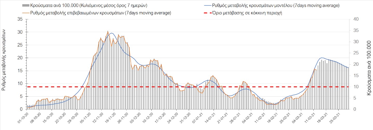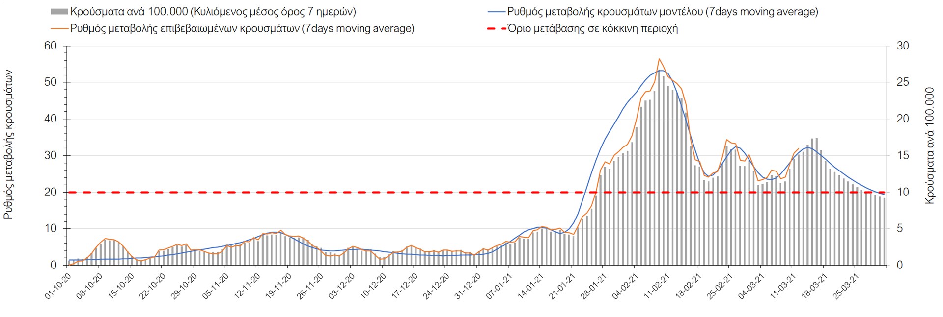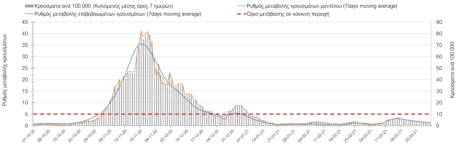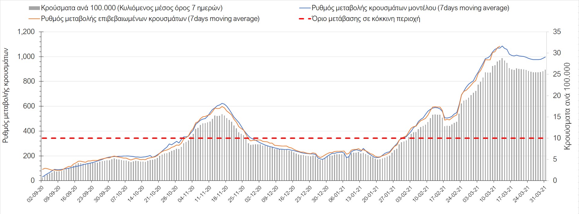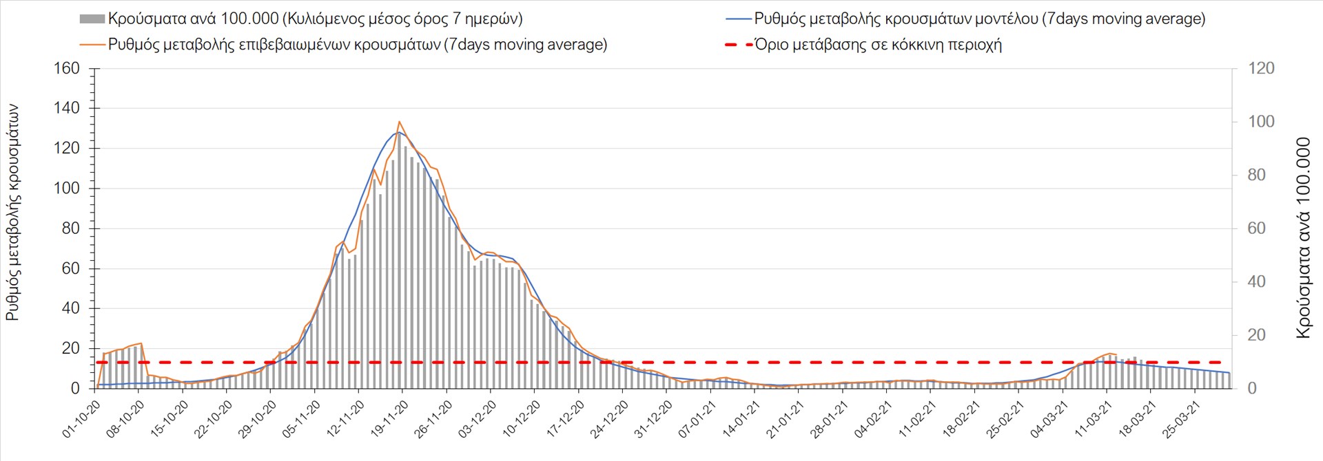 Όπως φαίνεται από το διάγραμμα, από τις 8 Ιανουαρίου έχουμε μια αύξηση κρουσμάτων μέχρι τις 11 Ιανουαρίου η οποία οφείλεται στη μείωση της περιστολής που σημειώθηκε στις γιορτές. Από τις 11 μέχρι τις 18 Ιανουαρίου προβλεπόταν μια μείωση κρουσμάτων λόγω της εφαρμογής του lockdown και η οποία όντως παρατηρήθηκε. Εντούτοις, όπως είχαμε προβλέψει, από τις 23 Ιανουαρίου και έπειτα διαφαίνεται αύξηση στον κυλιόμενο μέσο όρο των κρουσμάτων, η οποία έγινε ιδιαίτερα έντονη μετά τις 17/2, η οποία και συνεχίζεται μέχρι τώρα. Λόγω της ισχυρής παρουσία των μεταλλαγμένων στελεχών, πιστεύουμε ότι για να επιτευχθεί κάμψη της επιδημικής καμπύλης, θα πρέπει να γίνει αυστηρή εφαρμογή των μέτρων, έτσι ώστε σε συνδυασμό με την επικρατούσα μετεωρολογία να επέλθει επιβράδυνση της ανόδου ή και σταθεροποίηση των κρουσμάτων προς το τέλος του μήνα. Επίσης προβληματική θα είναι η αποτύπωση της επιδημιολογικής εικόνας την επόμενη εβδομάδα, λόγω του μειωμένου αριθμού των τεστ ανίχνευσης που θα πραγματοποιηθούν και την επερχόμενη Καθαροδευτέρα. Πάντως για να μπορέσουμε να προχωρήσουμε σε σταδιακή άρση των περιοριστικών μέτρων για οικονομικές, εκπαιδευτικές και πολιτιστικές/αθλητικές δραστηριότητες, θα πρέπει να δημιουργήσουμε την κατάλληλη υποδομή ώστε να μπορέσουμε να αναχαιτίσουμε την υπερμετάδοση των μεταλλαγμένων στελεχών εκεί όπου συμβαίνει κατά το μάλλον, δηλαδή στους τόπους εργασίας και τα μέσα μαζικής μεταφοράς. Στα συμπεράσματα προτείνονται σχετικές λύσεις.