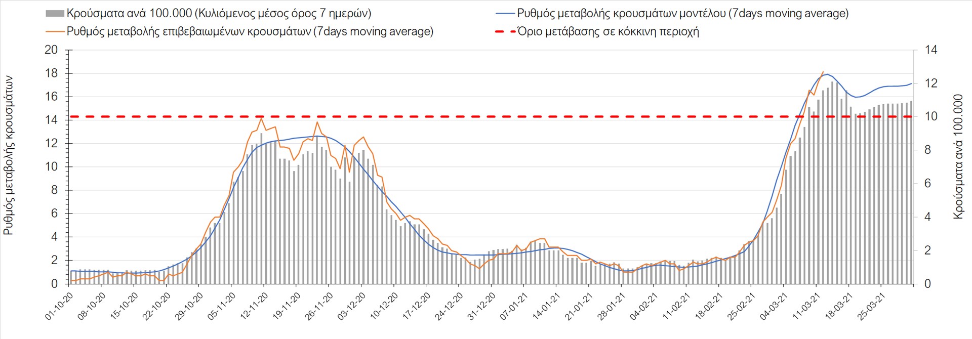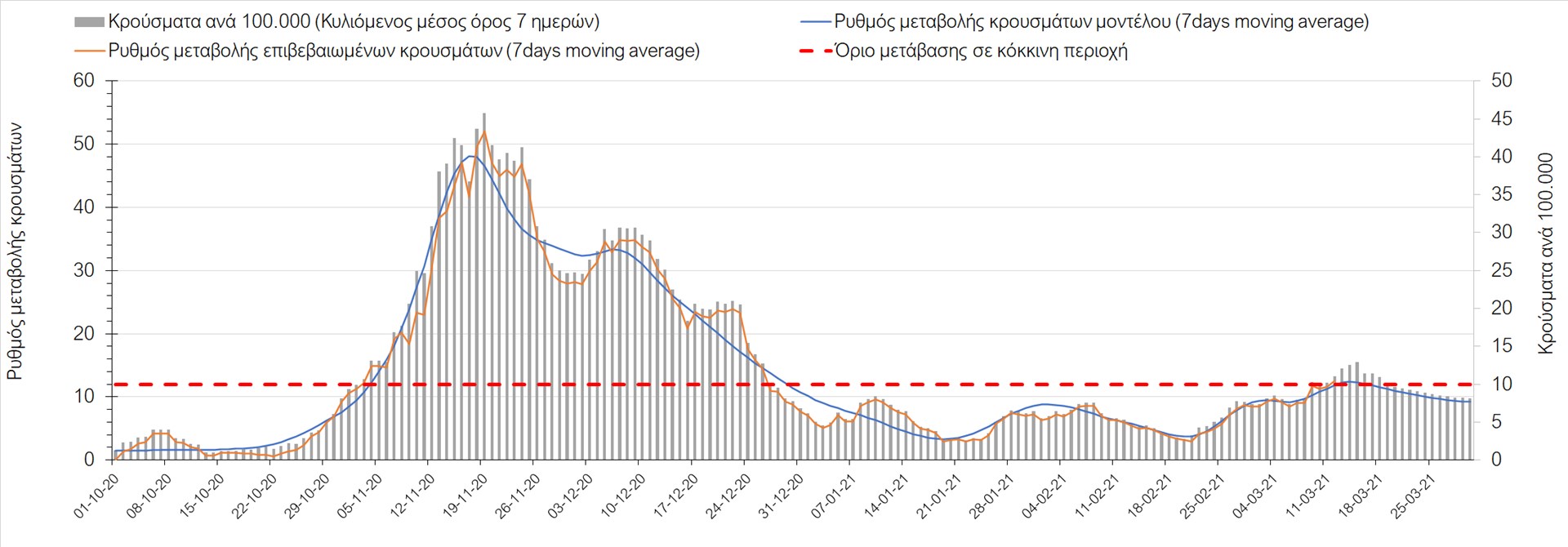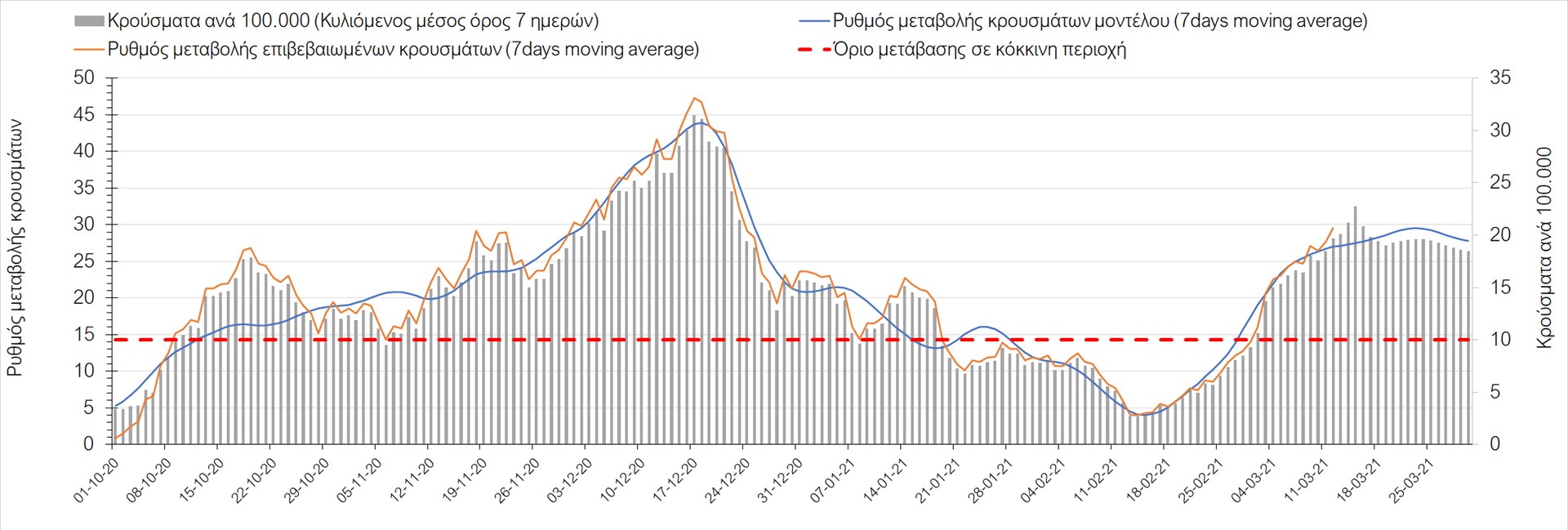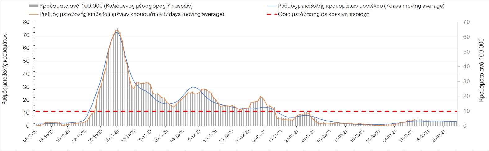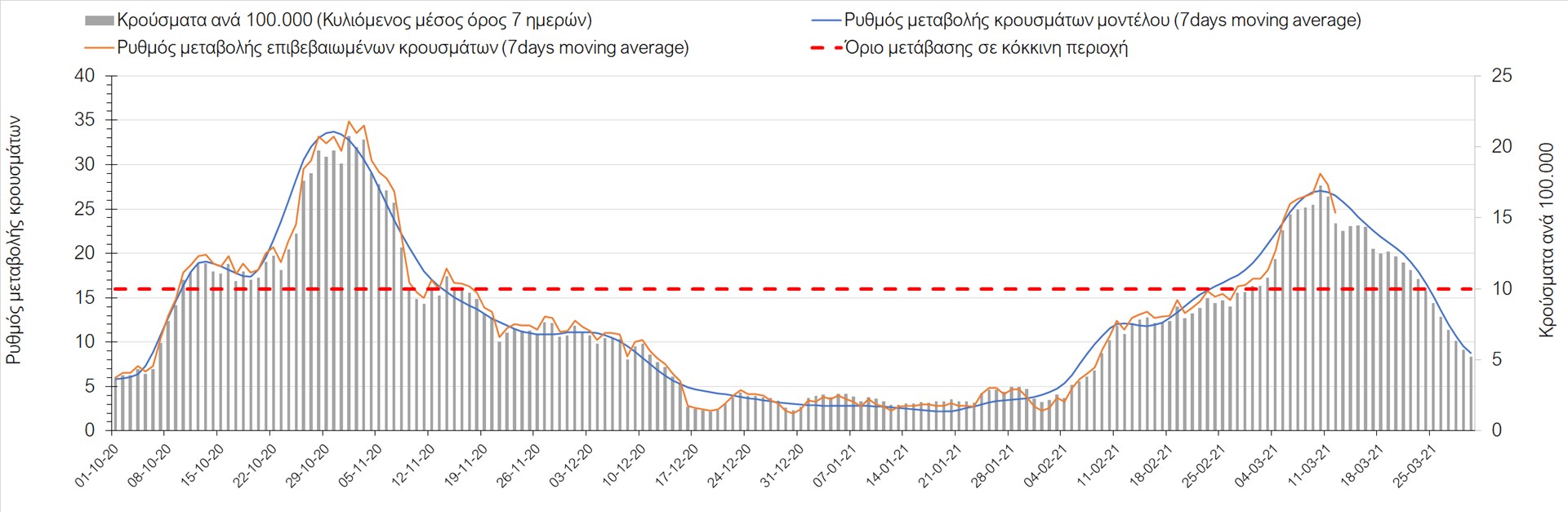 Όπως φαίνεται από το διάγραμμα, από τις 8 Ιανουαρίου έχουμε μια αύξηση κρουσμάτων μέχρι τις 11 Ιανουαρίου η οποία οφείλεται στη μείωση της περιστολής που σημειώθηκε στις γιορτές. Από τις 11 μέχρι τις 18 Ιανουαρίου προβλεπόταν μια μείωση κρουσμάτων λόγω της εφαρμογής του lockdown και η οποία όντως παρατηρήθηκε. Εντούτοις, όπως είχαμε προβλέψει, από τις 23 Ιανουαρίου και έπειτα διαφαίνεται αύξηση στον κυλιόμενο μέσο όρο των κρουσμάτων, η οποία έγινε ιδιαίτερα έντονη μετά τις 17/2, η οποία και συνεχίζεται μέχρι τώρα. Λόγω της ισχυρής παρουσία των μεταλλαγμένων στελεχών, πιστεύουμε ότι για να επιτευχθεί κάμψη της επιδημικής καμπύλης, θα πρέπει να γίνει αυστηρή εφαρμογή των μέτρων, έτσι ώστε σε συνδυασμό με την επικρατούσα μετεωρολογία να επέλθει επιβράδυνση της ανόδου ή και σταθεροποίηση των κρουσμάτων προς το τέλος του μήνα. Επίσης προβληματική θα είναι η αποτύπωση της επιδημιολογικής εικόνας την επόμενη εβδομάδα, λόγω του μειωμένου αριθμού των τεστ ανίχνευσης που θα πραγματοποιηθούν και την επερχόμενη Καθαροδευτέρα. Πάντως για να μπορέσουμε να προχωρήσουμε σε σταδιακή άρση των περιοριστικών μέτρων για οικονομικές, εκπαιδευτικές και πολιτιστικές/αθλητικές δραστηριότητες, θα πρέπει να δημιουργήσουμε την κατάλληλη υποδομή ώστε να μπορέσουμε να αναχαιτίσουμε την υπερμετάδοση των μεταλλαγμένων στελεχών εκεί όπου συμβαίνει κατά το μάλλον, δηλαδή στους τόπους εργασίας και τα μέσα μαζικής μεταφοράς. Στα συμπεράσματα προτείνονται σχετικές λύσεις.