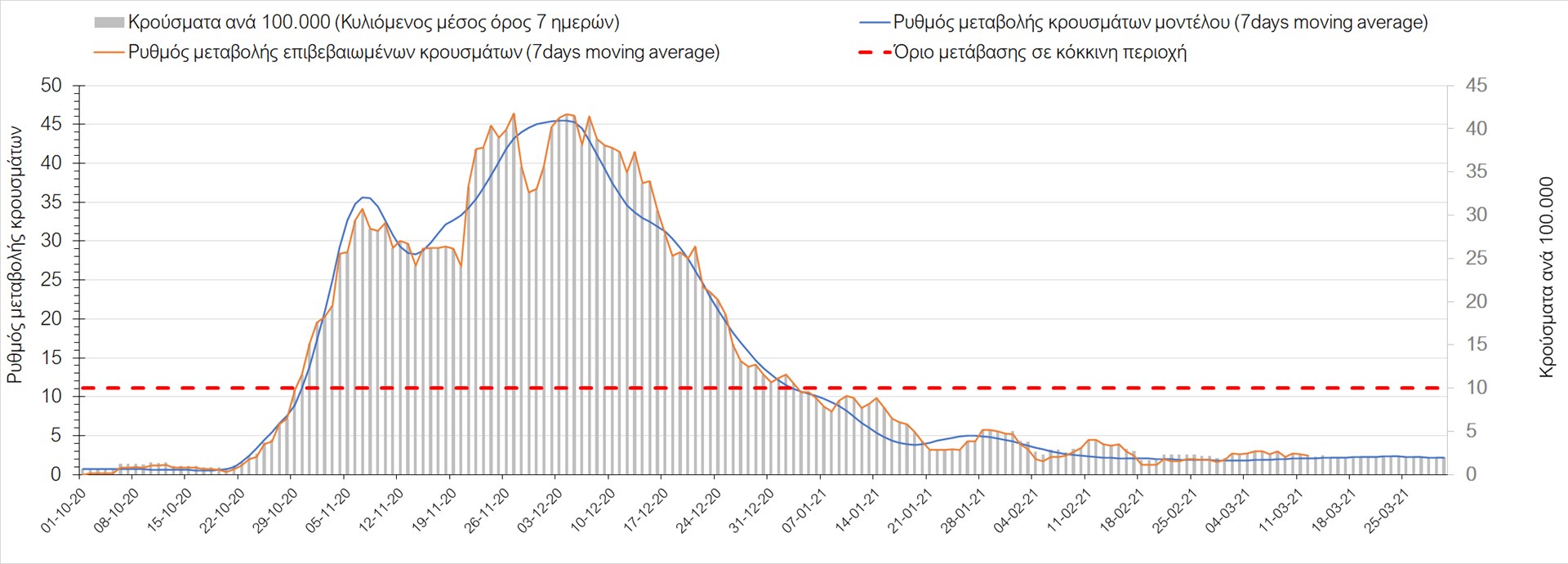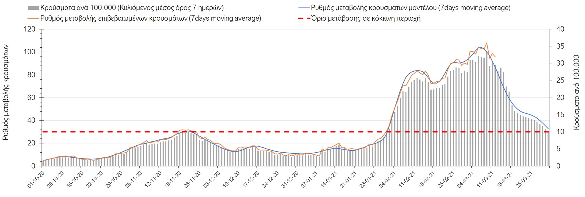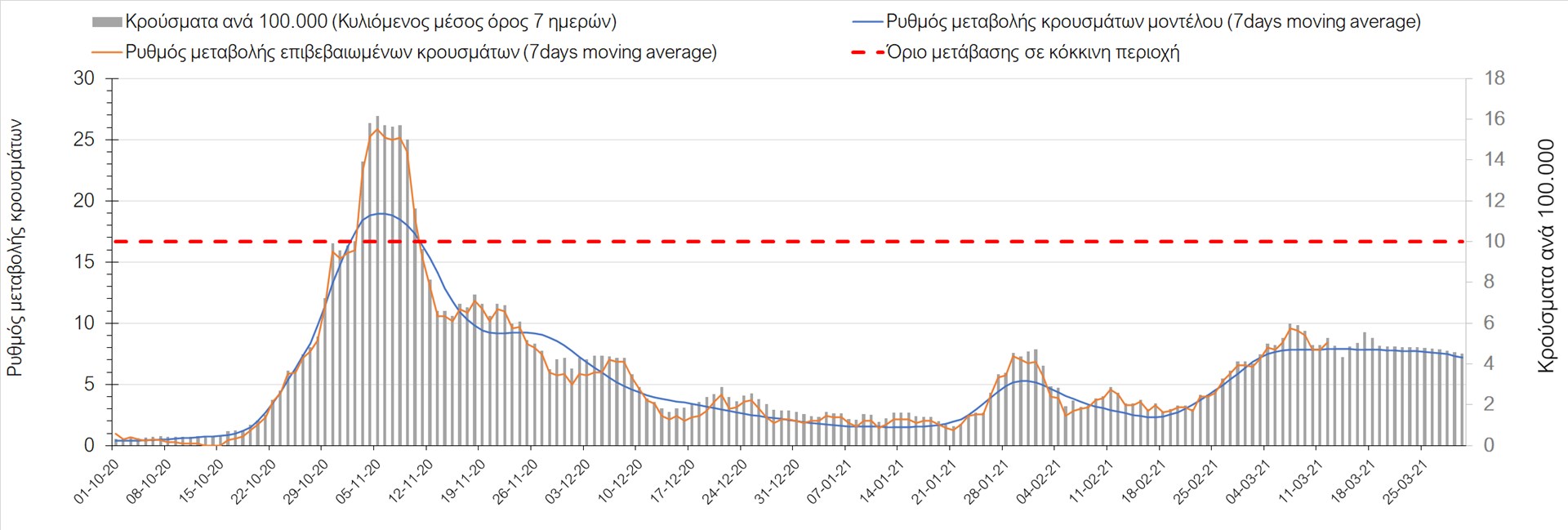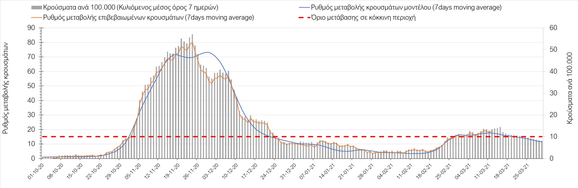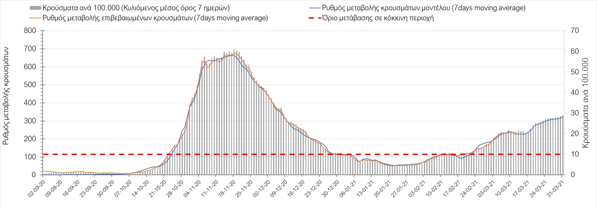 Όπως φαίνεται από το διάγραμμα, από τις 8 Ιανουαρίου έχουμε μια αύξηση κρουσμάτων μέχρι τις 11 Ιανουαρίου η οποία οφείλεται στη μείωση της περιστολής που σημειώθηκε στις γιορτές. Από τις 11 μέχρι τις 18 Ιανουαρίου προβλεπόταν μια μείωση κρουσμάτων λόγω της εφαρμογής του lockdown και η οποία όντως παρατηρήθηκε. Εντούτοις, όπως είχαμε προβλέψει, από τις 23 Ιανουαρίου και έπειτα διαφαίνεται αύξηση στον κυλιόμενο μέσο όρο των κρουσμάτων, η οποία έγινε ιδιαίτερα έντονη μετά τις 17/2, η οποία και συνεχίζεται μέχρι τώρα. Λόγω της ισχυρής παρουσία των μεταλλαγμένων στελεχών, πιστεύουμε ότι για να επιτευχθεί κάμψη της επιδημικής καμπύλης, θα πρέπει να γίνει αυστηρή εφαρμογή των μέτρων, έτσι ώστε σε συνδυασμό με την επικρατούσα μετεωρολογία να επέλθει επιβράδυνση της ανόδου ή και σταθεροποίηση των κρουσμάτων προς το τέλος του μήνα. Επίσης προβληματική θα είναι η αποτύπωση της επιδημιολογικής εικόνας την επόμενη εβδομάδα, λόγω του μειωμένου αριθμού των τεστ ανίχνευσης που θα πραγματοποιηθούν και την επερχόμενη Καθαροδευτέρα. Πάντως για να μπορέσουμε να προχωρήσουμε σε σταδιακή άρση των περιοριστικών μέτρων για οικονομικές, εκπαιδευτικές και πολιτιστικές/αθλητικές δραστηριότητες, θα πρέπει να δημιουργήσουμε την κατάλληλη υποδομή ώστε να μπορέσουμε να αναχαιτίσουμε την υπερμετάδοση των μεταλλαγμένων στελεχών εκεί όπου συμβαίνει κατά το μάλλον, δηλαδή στους τόπους εργασίας και τα μέσα μαζικής μεταφοράς. Στα συμπεράσματα προτείνονται σχετικές λύσεις.