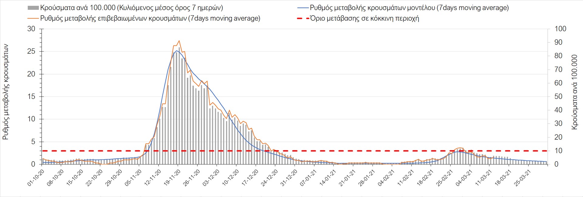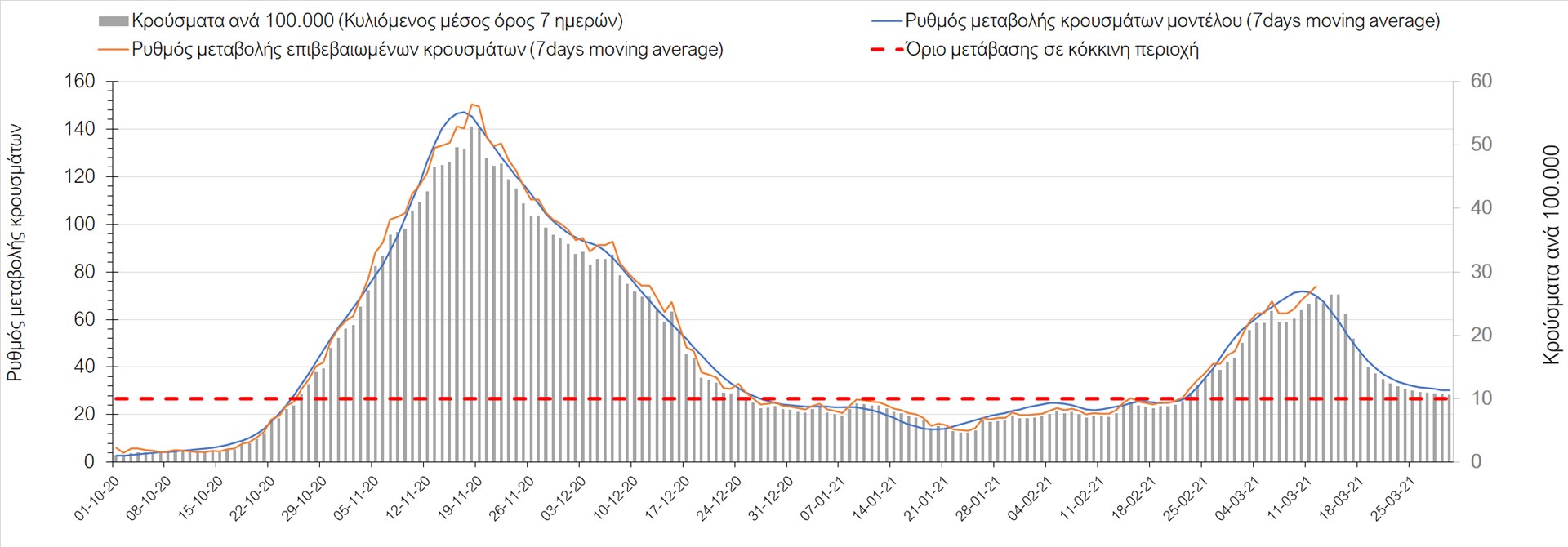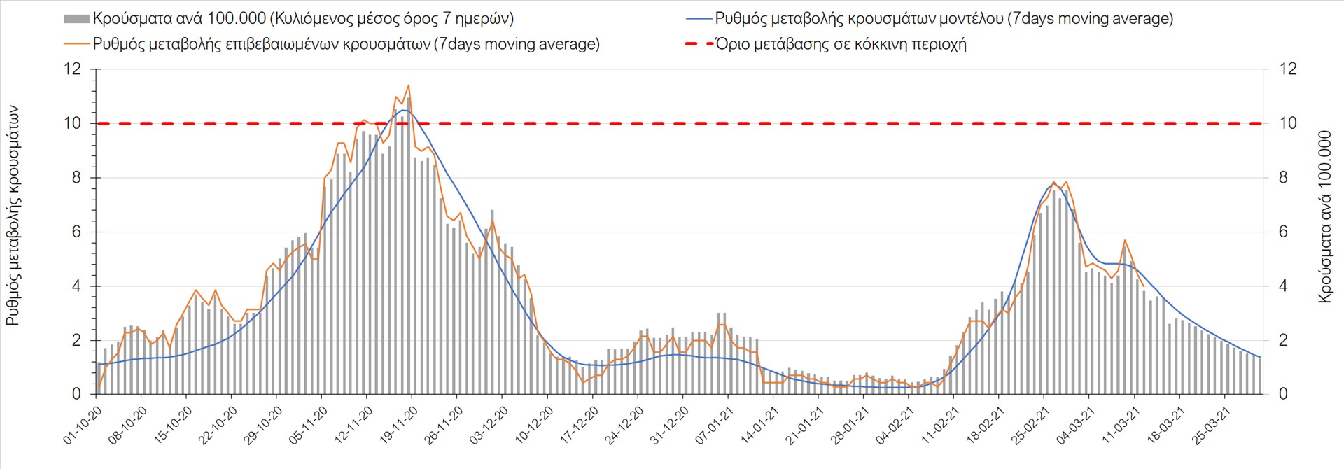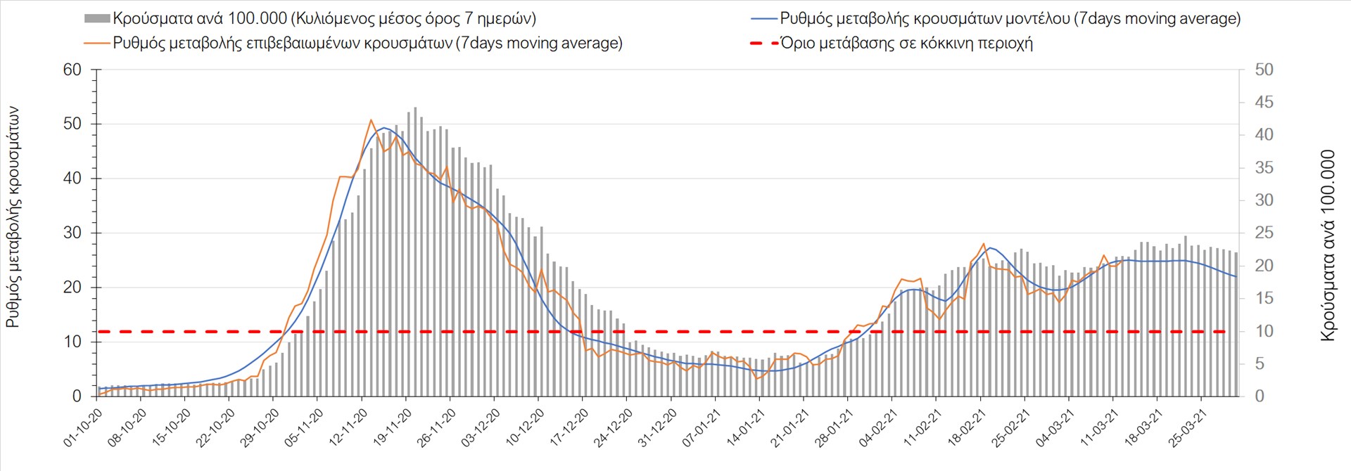 Όπως φαίνεται από το διάγραμμα, από τις 8 Ιανουαρίου έχουμε μια αύξηση κρουσμάτων μέχρι τις 11 Ιανουαρίου η οποία οφείλεται στη μείωση της περιστολής που σημειώθηκε στις γιορτές. Από τις 11 μέχρι τις 18 Ιανουαρίου προβλεπόταν μια μείωση κρουσμάτων λόγω της εφαρμογής του lockdown και η οποία όντως παρατηρήθηκε. Εντούτοις, όπως είχαμε προβλέψει, από τις 23 Ιανουαρίου και έπειτα διαφαίνεται αύξηση στον κυλιόμενο μέσο όρο των κρουσμάτων, η οποία έγινε ιδιαίτερα έντονη μετά τις 17/2, η οποία και συνεχίζεται μέχρι τώρα. Λόγω της ισχυρής παρουσία των μεταλλαγμένων στελεχών, πιστεύουμε ότι για να επιτευχθεί κάμψη της επιδημικής καμπύλης, θα πρέπει να γίνει αυστηρή εφαρμογή των μέτρων, έτσι ώστε σε συνδυασμό με την επικρατούσα μετεωρολογία να επέλθει επιβράδυνση της ανόδου ή και σταθεροποίηση των κρουσμάτων προς το τέλος του μήνα. Επίσης προβληματική θα είναι η αποτύπωση της επιδημιολογικής εικόνας την επόμενη εβδομάδα, λόγω του μειωμένου αριθμού των τεστ ανίχνευσης που θα πραγματοποιηθούν και την επερχόμενη Καθαροδευτέρα. Πάντως για να μπορέσουμε να προχωρήσουμε σε σταδιακή άρση των περιοριστικών μέτρων για οικονομικές, εκπαιδευτικές και πολιτιστικές/αθλητικές δραστηριότητες, θα πρέπει να δημιουργήσουμε την κατάλληλη υποδομή ώστε να μπορέσουμε να αναχαιτίσουμε την υπερμετάδοση των μεταλλαγμένων στελεχών εκεί όπου συμβαίνει κατά το μάλλον, δηλαδή στους τόπους εργασίας και τα μέσα μαζικής μεταφοράς. Στα συμπεράσματα προτείνονται σχετικές λύσεις.
