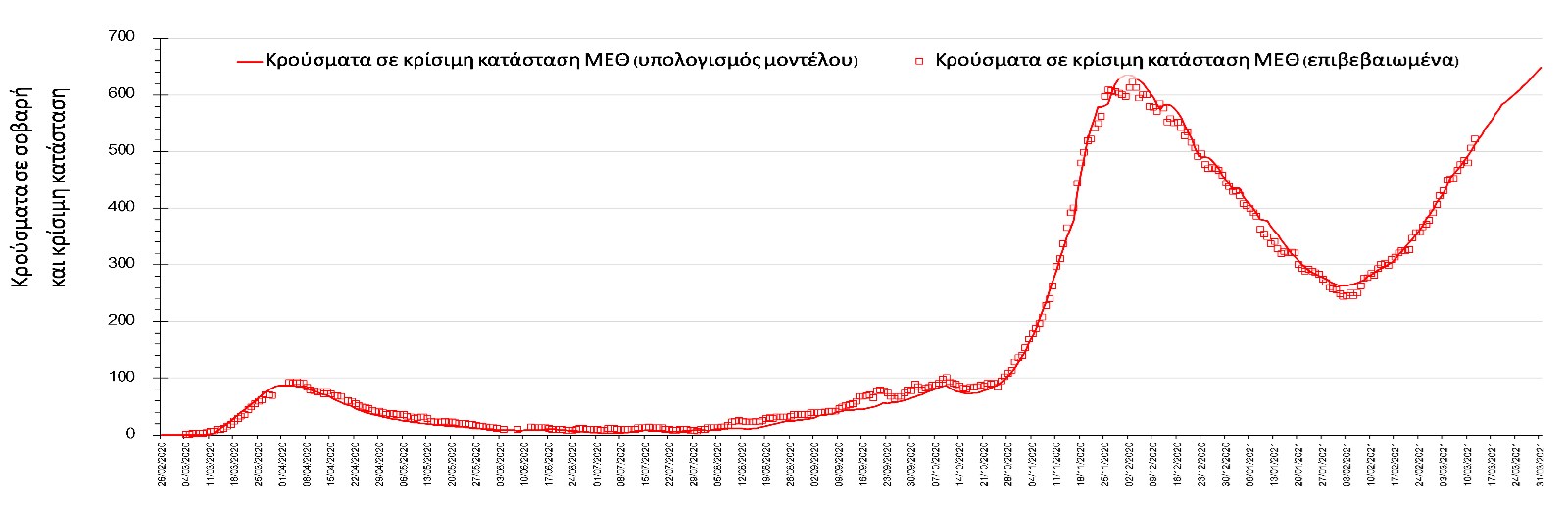 Όσον αφορά στους ασθενείς σε κρίσιμη κατάσταση (διασωληνωμένοι σε ΜΕΘ), ο αριθμός τους αυξήθηκε σε σχέση με την Πέμπτη (521 από 506), ενώ αναμένεται να φτάσουν στους περίπου 590 μέχρι τις 25 Μαρτίου με βάση την επικαιροποιημένη πρόβλεψη. Η καμπύλη εξέλιξης του αριθμού των ασθενών με βάση τις προσομοιώσεις της πλατφόρμας CORE, όπως αυτή παρουσιάζεται στο Σχήμα 1, ενώ μια εκτίμηση για την πορεία των θανάτων ανά ημέρα παρουσιάζεται στο Σχήμα 2.