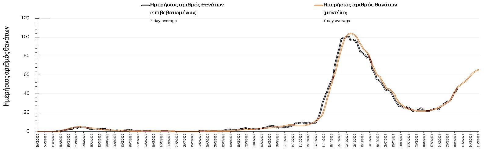 Ο αριθμός θανάτων (49) είναι ελαφρώς μειωμένος σε σχέση με την Πέμπτη (51), και όπως είχαμε προβλέψει από την προηγούμενη εβδομάδα, ο κυλιόμενος εβδομαδιαίος μέσος όρος που είναι 41, αναμένεται να αυξηθεί περαιτέρω μέχρι και άνω των 60 μέχρι το τέλος Μαρτίου (σε επίπεδο μέσης εβδομαδιαίας τιμής), με δεδομένη την αύξηση του αριθμού των κρουσμάτων και την αύξηση του αριθμού των διασωληνωμένων.