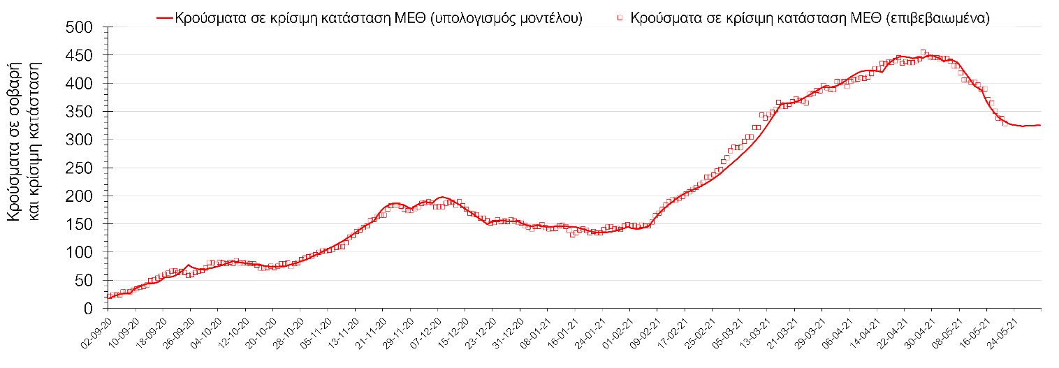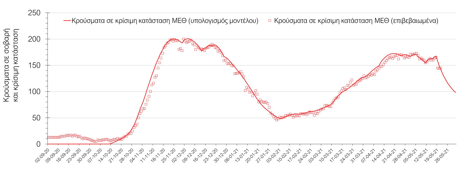 Σχήμα 1. Αριθμός κρουσμάτων σε κρίσιμη κατάσταση (ΜΕΘ) σύμφωνα με τα στοιχεία του ΕΟΔΥ και τις προβλέψεις της υπολογιστικής πλατφόρμας CORE.