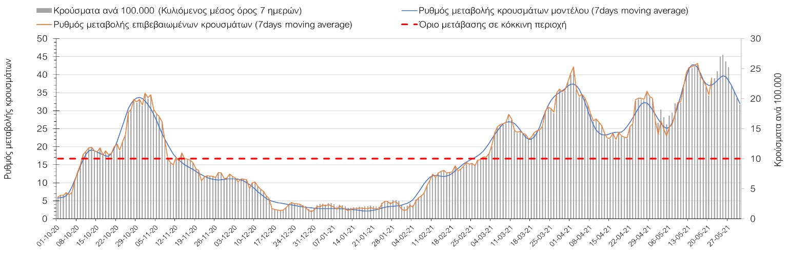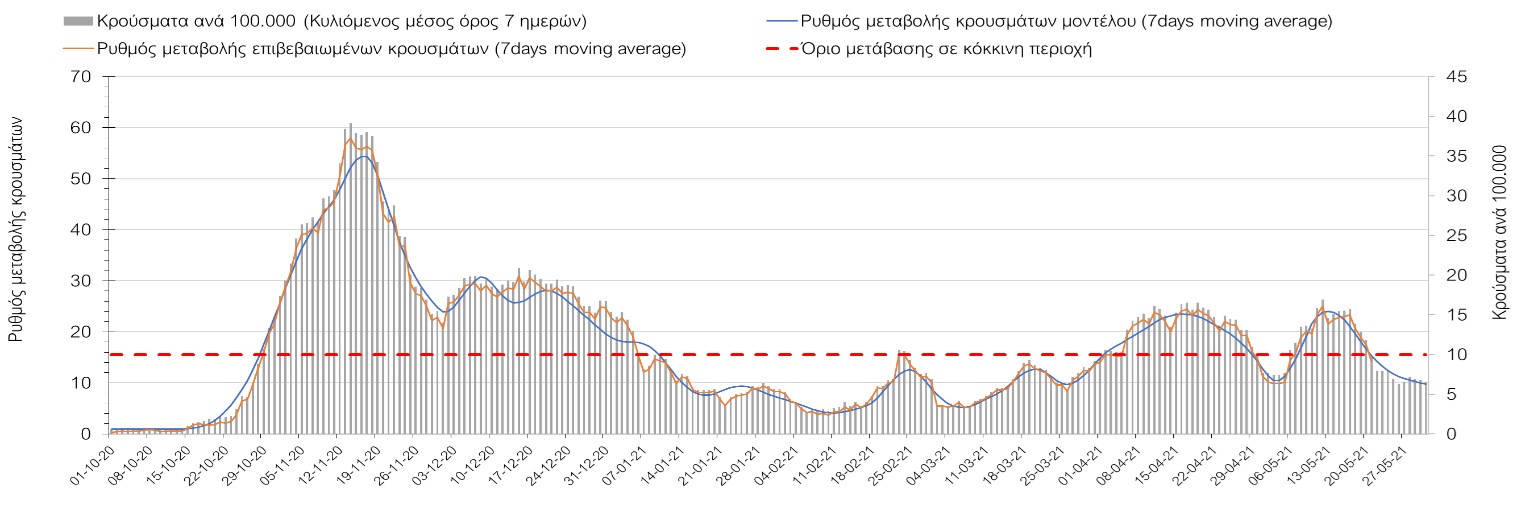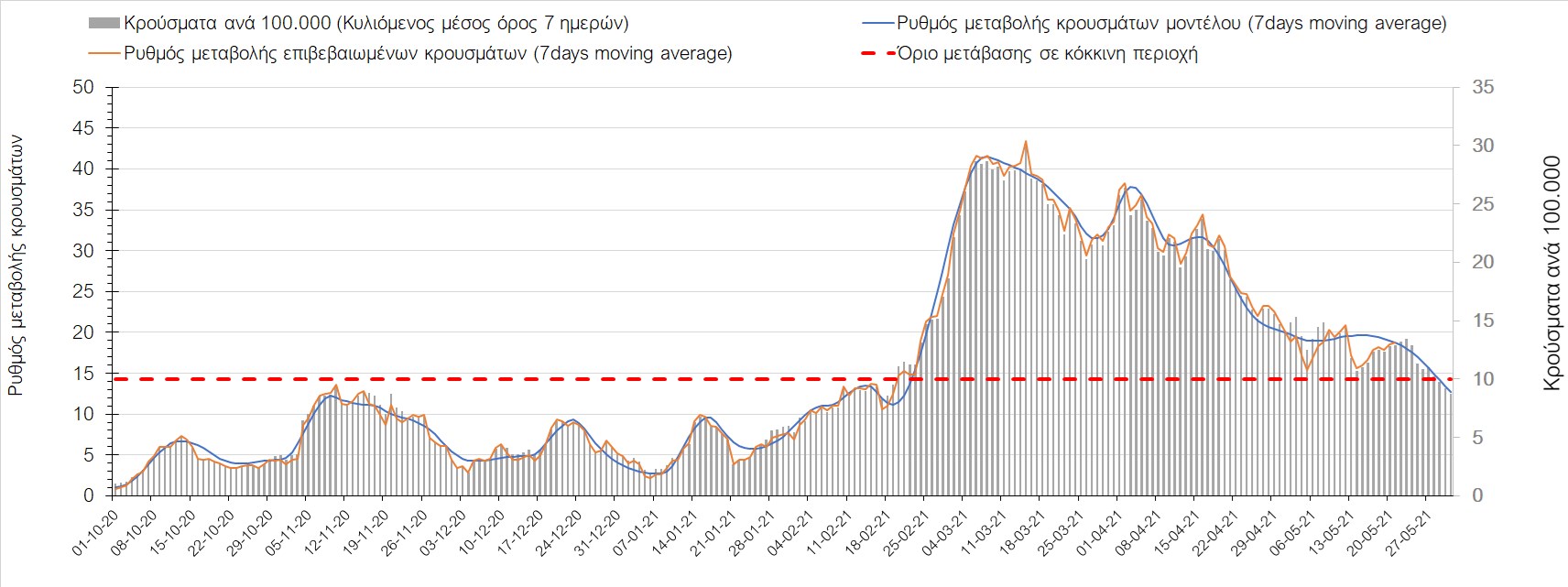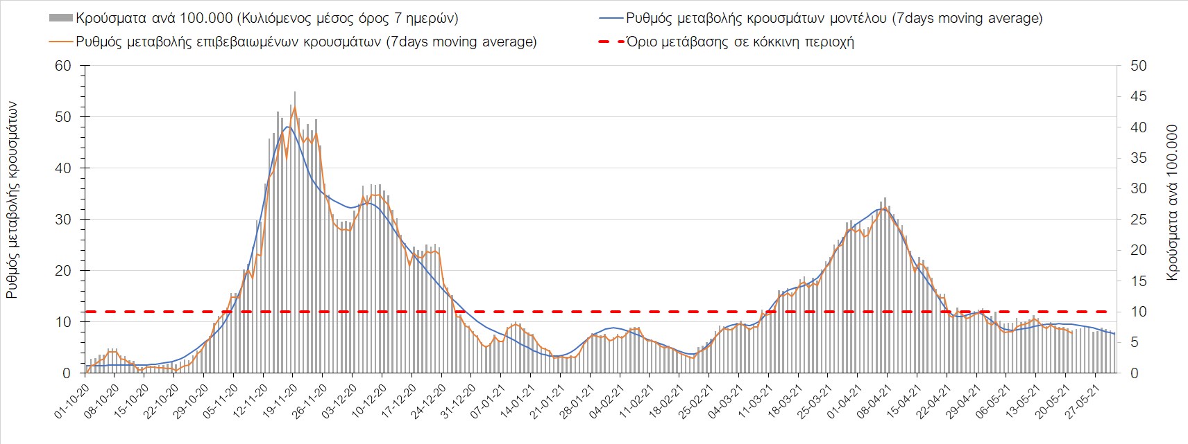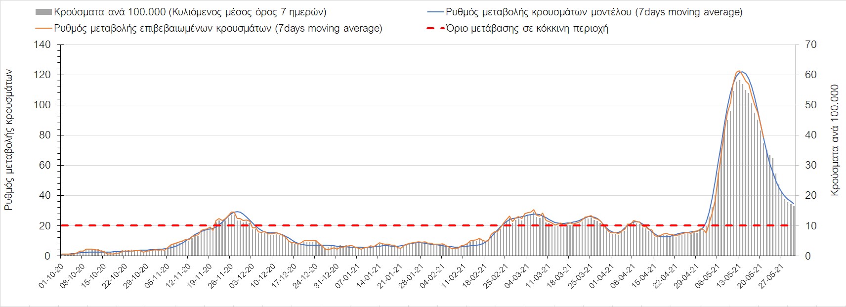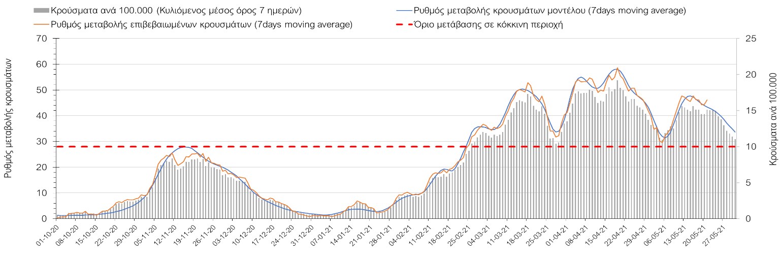Σχήμα 44. Πορεία του ημερησίου αριθμού των κρουσμάτων (κυλιόμενος μέσος όρος 7 ημερών) στον ΈβροΣτο Ηράκλειο, όπου εντοπίστηκαν 50 κρούσματα παρατηρείται μείωση σε σχέση με προχθές (Σχήμα 45). Λόγω των έντονων διακυμάνσεων που σημειώθηκαν στην πορεία της πανδημίας ως αποτέλεσμα του πολύ μεγάλου αριθμού φορέων του μεταλλαγμένου στελέχους Β.1.1.7, το Ηράκλειο είχε μεγάλη διασπορά του ιού και αυτή η δυναμική καθυστέρησε και συνεχίζει να καθυστερεί τον αποχαρακτηρισμό της περιοχής ως κόκκινη. Το επιπλέον ανοδικό κύμα που διαμορφώθηκε τις τελευταίες ημέρες και μάλλον οφείλεται σε αυξημένες συρροές λόγω του Πάσχα, έχει αρχίσει να αποκλιμακώνεται, σύμφωνα με τις προβλέψεις, αλλά με πολύ αργό ρυθμό. Στα Χανιά με 24 κρούσματα (Σχήμα 46) έχουμε αύξηση σε σχέση με προχθές, και υπάρχουν έντονες διακυμάνσεις (με ένα επιπλέον ανοδικό κύμα που οφείλεται σε συρροές των ημερών του Πάσχα) που δυσχεραίνουν τη συστηματική αποκλιμάκωση. Τα Χανιά θα παραμείνουν ανάμεσα στις κόκκινες περιοχές και μετά τις 20 Μαΐου. Μείωση κρουσμάτων παρατηρείται στο Ρέθυμνο με 15 κρούσματα, στο οποίο η προ 15 ημερών έντονα ανοδική τάση, είχε περιέλθει σε πορεία ισχυρής αποκλιμάκωσης (Σχήμα 47), όμως η μικρή ανοδική τάση που έχει διαμορφωθεί, έχει φέρει την περιοχή ξανά πάνω από το όριο του χαρακτηρισμού ως κόκκινη. Στο Λασίθι παρατηρείται μείωση σε σχέση με προχθές, καθώς εντοπίστηκαν 0 κρούσματα και παρατηρούνται έντονες διακυμάνσεις (Σχήμα 48), παρόλα αυτά, η περιφερειακή ενότητα βρίσκεται κάτω από το όριο της κόκκινης περιοχής.